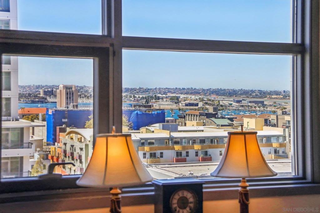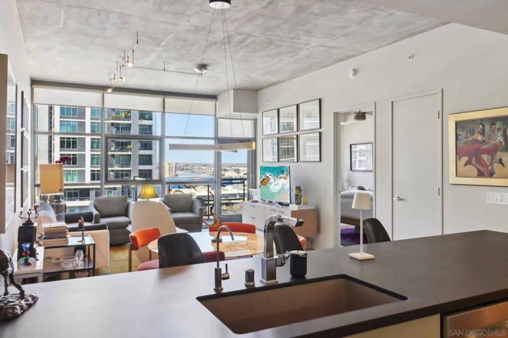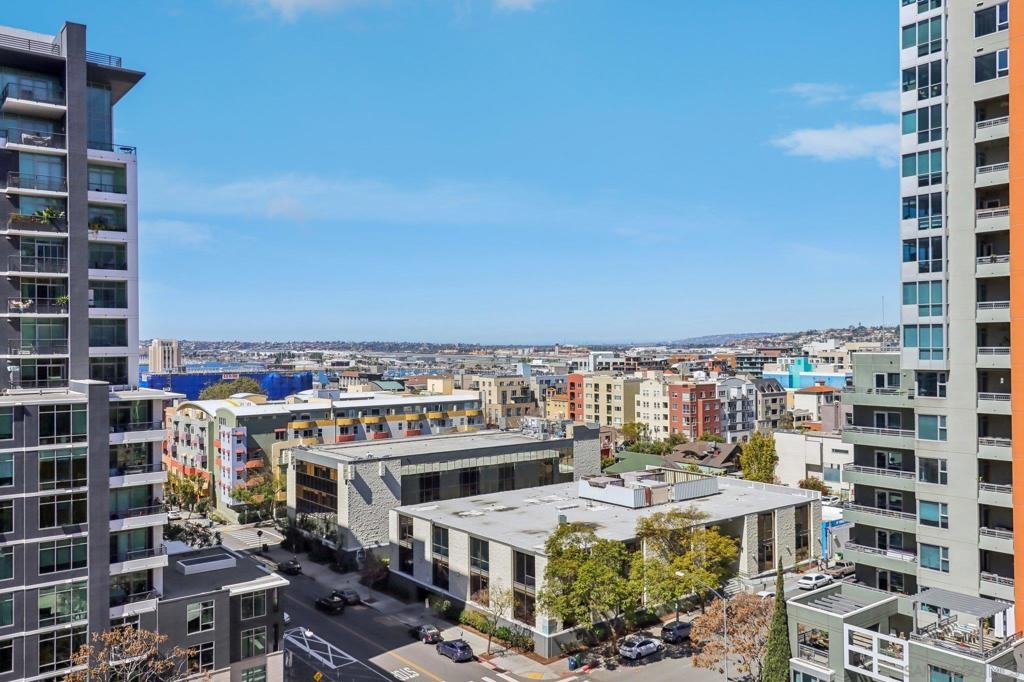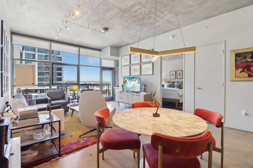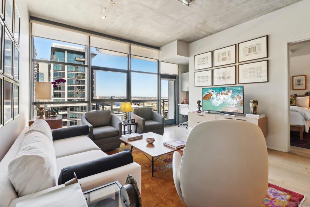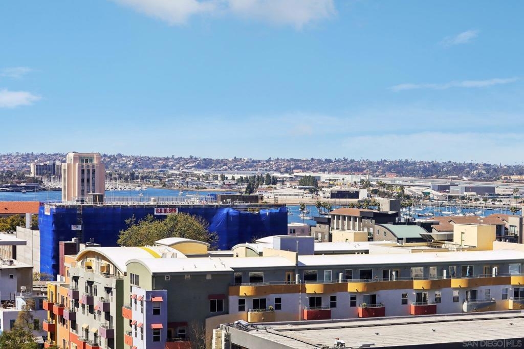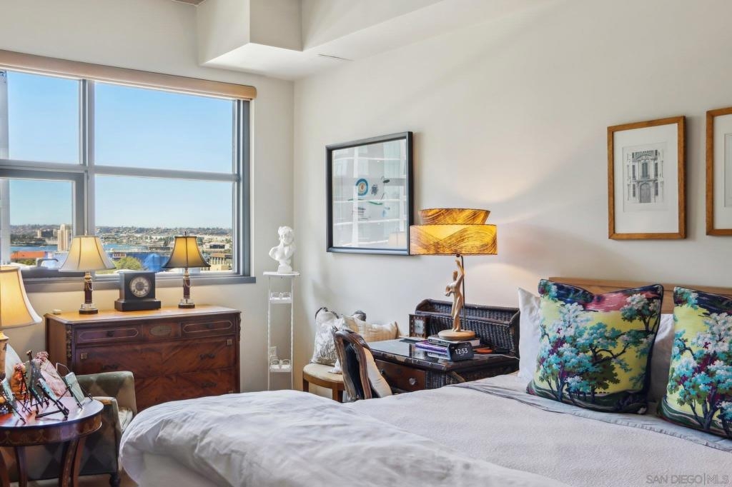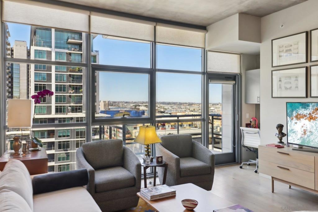 Welcome to one of the most sought-after larger one-bedroom residences in Aperture, perfectly situated in Little Italy. This highly upgraded condo offers an ideal blend of vibrant city living and peaceful retreat and is located just steps from the farmer's market, restaurants, FIT gym and a Whole Foods to open early 2026. You will find a generous, open floor plan that showcases floor-to-ceiling windows framing stunning bay views and breathtaking sunsets. European oak hardwood floors throughout the space, a custom-built desk, window shades, and a statement light fixture in the dining area. The balcony has plenty of room for a cafe table and chairs, including a custom screen door to enjoy the western breezes. The large, modern and updated kitchen features newer appliances, sleek high end Dekton countertops (modern stone material of glass, porcelain, and natural quartz create a high-quality, durable surface), high-end fixtures, custom backsplash, and updated lighting. Relax in the king-sized bedroom with a cozy sitting area and partial bay views. The spacious, custom walk-in closet boasts built-in drawers, a hamper, and floor-to-ceiling shoe rack, with plenty of additional storage. The remodeled bathroom has a glass-enclosed stand-up shower, Toto toilet, bidet, Dekton countertops, designer fixtures, and new tile flooring. Additional features include a full-size stackable washer & dryer, one secure, underground parking space and a relatively low HOA fee. This beautifully appointed, turnkey condo is an exceptional opportunity for sophisticated urban living.