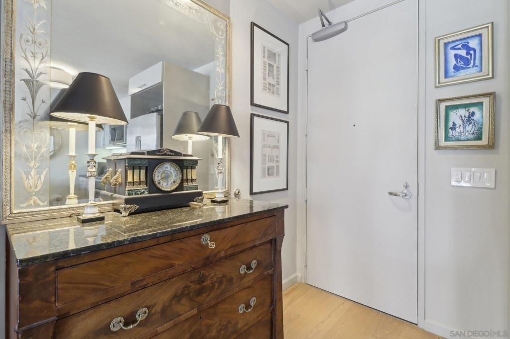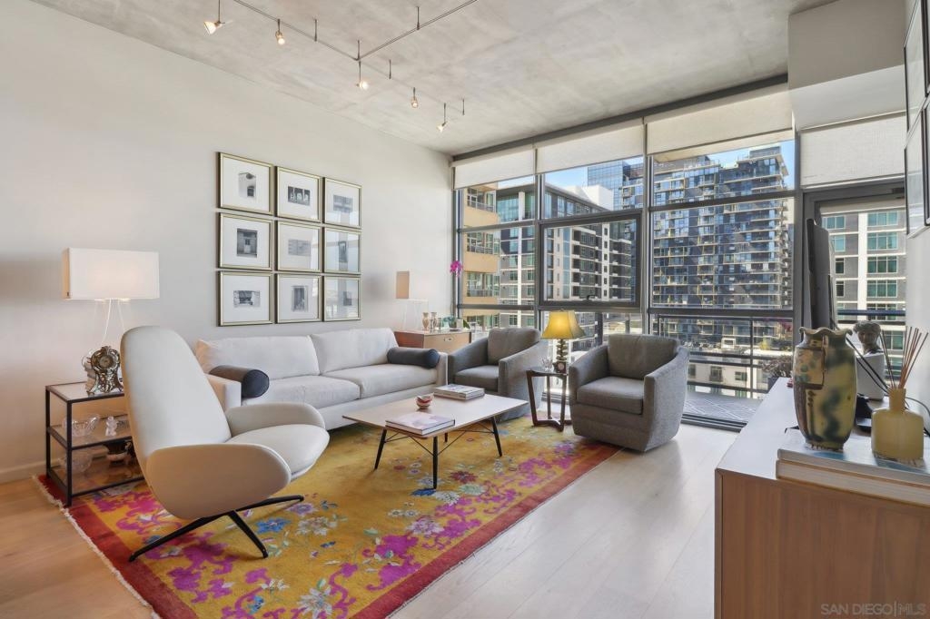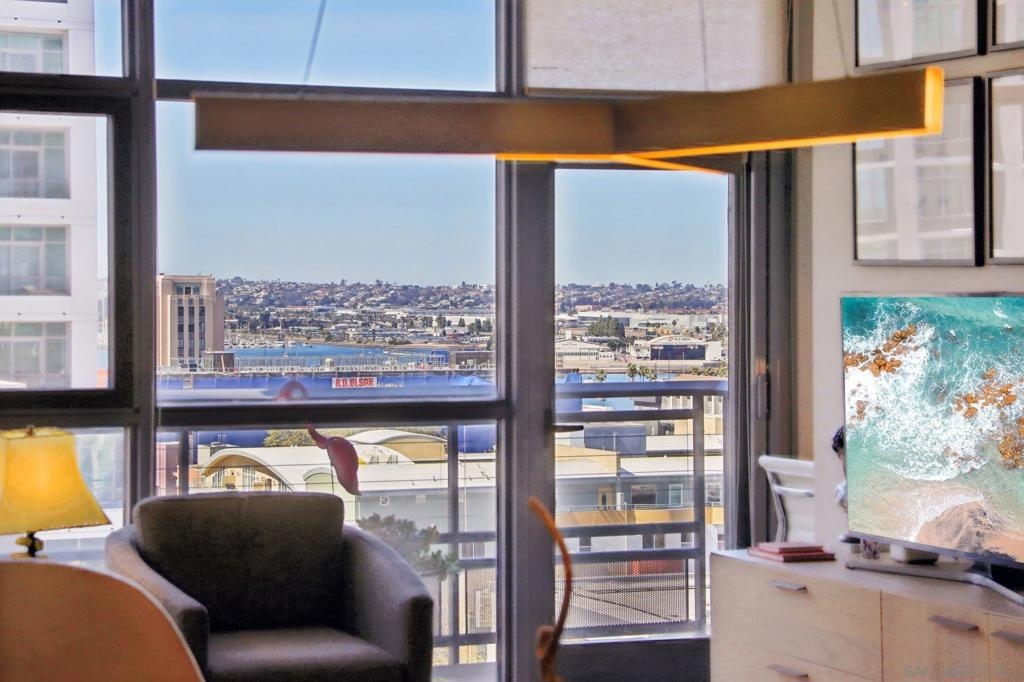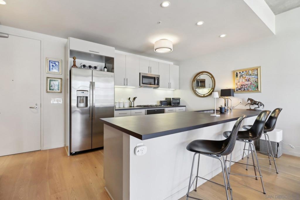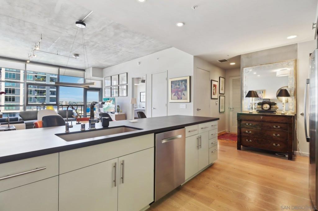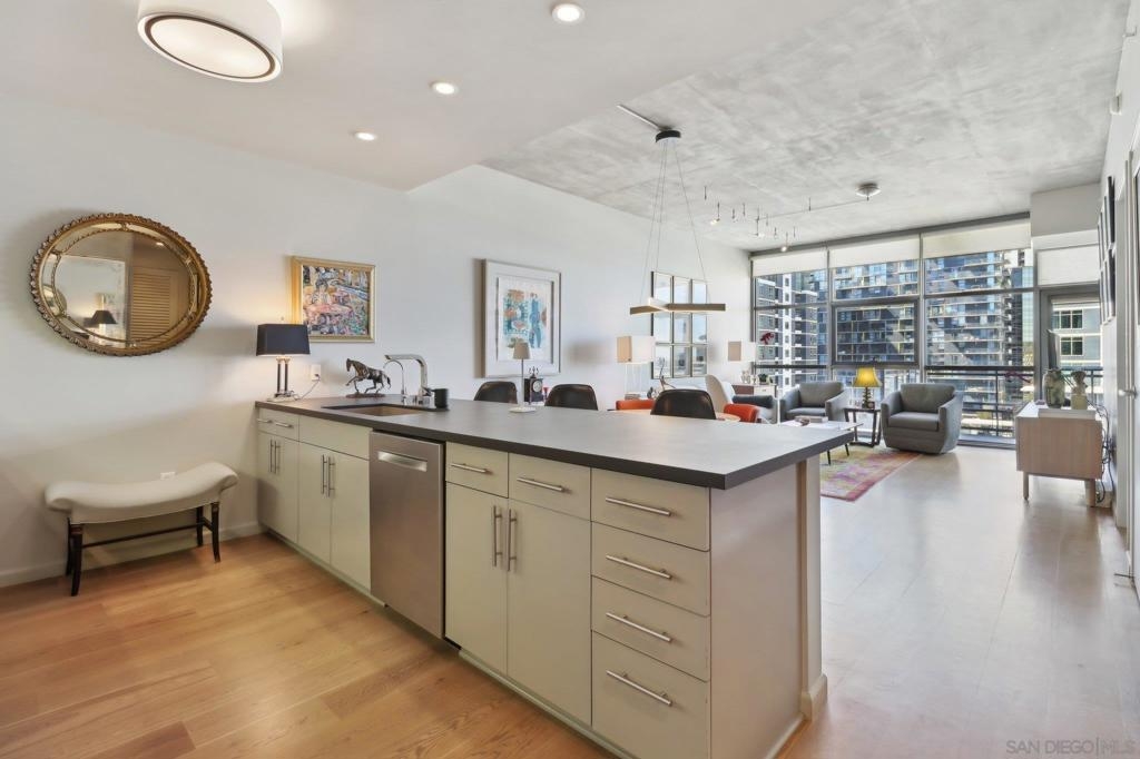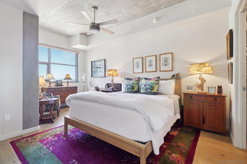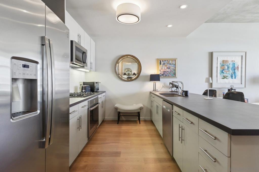 Welcome to one of the most sought-after larger one-bedroom residences in Aperture, perfectly situated in Little Italy. This highly upgraded condo offers an ideal blend of vibrant city living and peaceful retreat and is located just steps from the farmer's market, restaurants, FIT gym and a Whole Foods to open early 2026. You will find a generous, open floor plan that showcases floor-to-ceiling windows framing stunning bay views and breathtaking sunsets. European oak hardwood floors throughout the space, a custom-built desk, window shades, and a statement light fixture in the dining area. The balcony has plenty of room for a cafe table and chairs, including a custom screen door to enjoy the western breezes. The large, modern and updated kitchen features newer appliances, sleek high end Dekton countertops (modern stone material of glass, porcelain, and natural quartz create a high-quality, durable surface), high-end fixtures, custom backsplash, and updated lighting. Relax in the king-sized bedroom with a cozy sitting area and partial bay views. The spacious, custom walk-in closet boasts built-in drawers, a hamper, and floor-to-ceiling shoe rack, with plenty of additional storage. The remodeled bathroom has a glass-enclosed stand-up shower, Toto toilet, bidet, Dekton countertops, designer fixtures, and new tile flooring. Additional features include a full-size stackable washer & dryer, one secure, underground parking space and a relatively low HOA fee. This beautifully appointed, turnkey condo is an exceptional opportunity for sophisticated urban living.