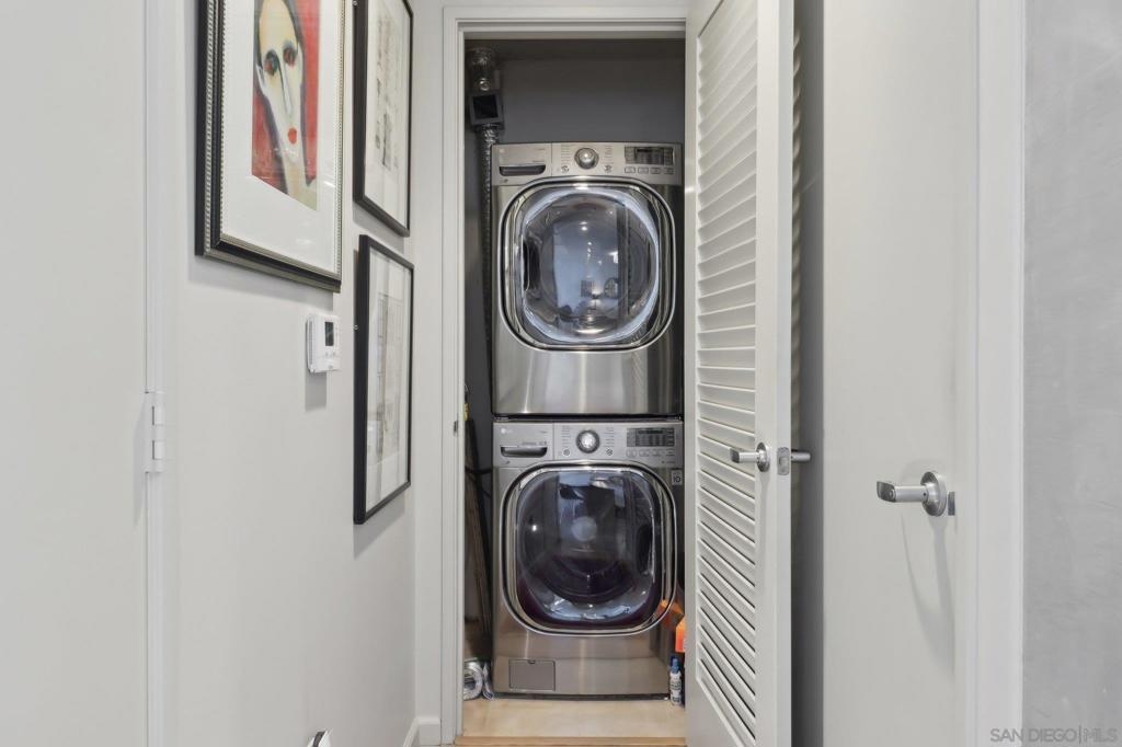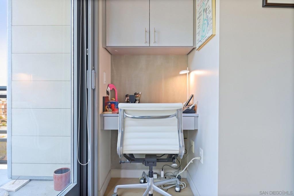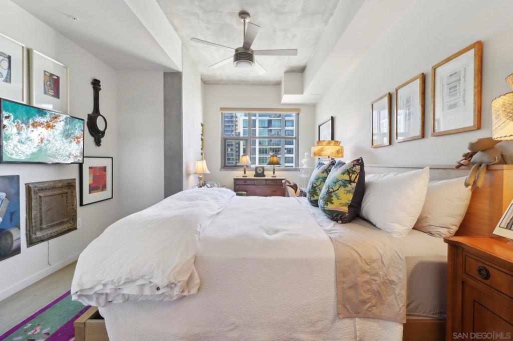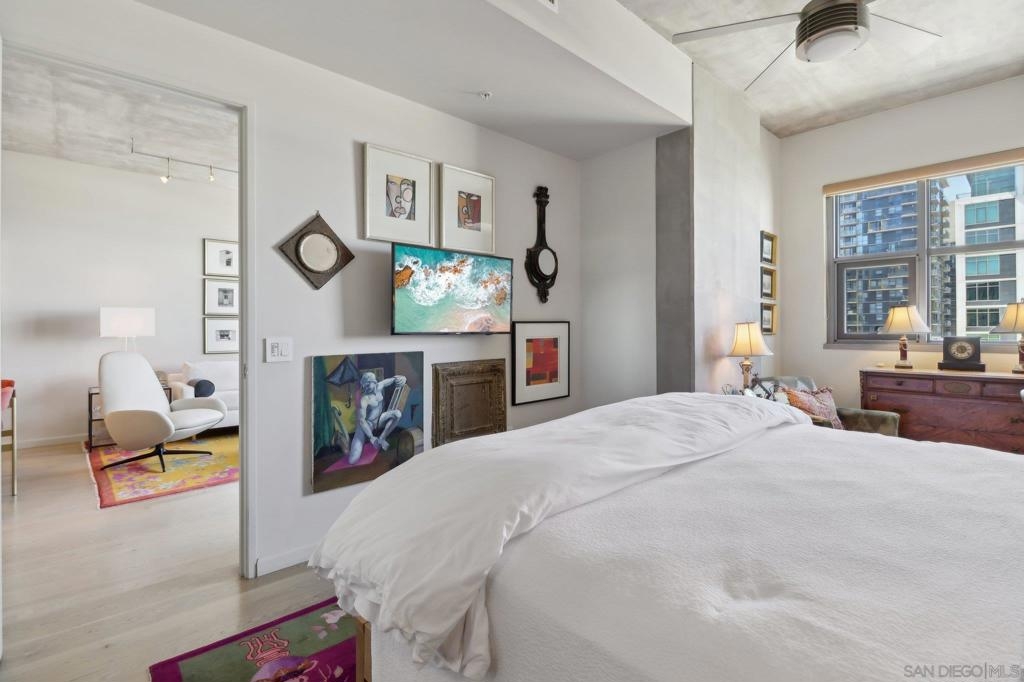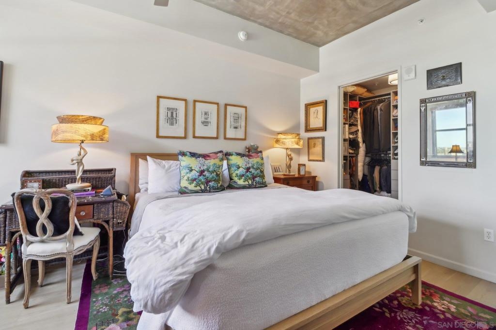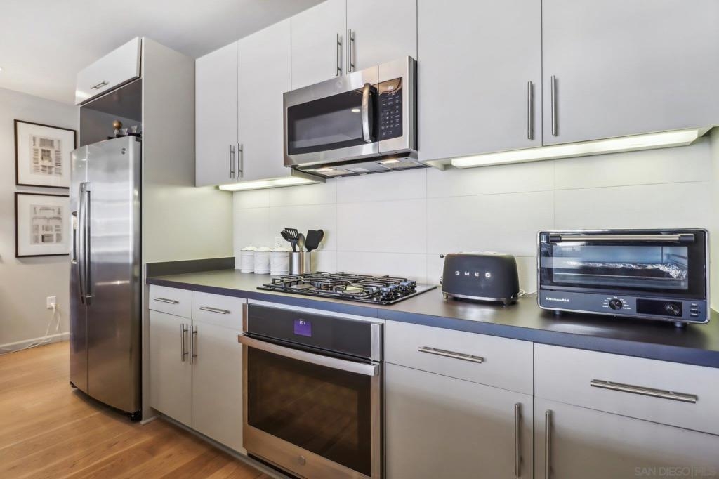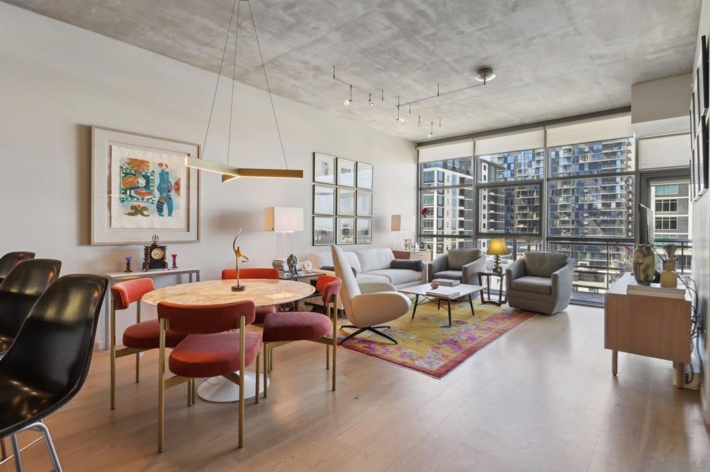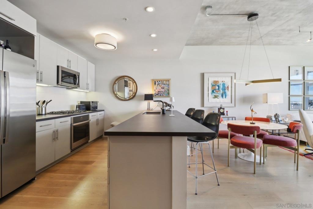 Welcome to one of the most sought-after larger one-bedroom residences in Aperture, perfectly situated in Little Italy. This highly upgraded condo offers an ideal blend of vibrant city living and peaceful retreat and is located just steps from the farmer's market, restaurants, FIT gym and a Whole Foods to open early 2026. You will find a generous, open floor plan that showcases floor-to-ceiling windows framing stunning bay views and breathtaking sunsets. European oak hardwood floors throughout the space, a custom-built desk, window shades, and a statement light fixture in the dining area. The balcony has plenty of room for a cafe table and chairs, including a custom screen door to enjoy the western breezes. The large, modern and updated kitchen features newer appliances, sleek high end Dekton countertops (modern stone material of glass, porcelain, and natural quartz create a high-quality, durable surface), high-end fixtures, custom backsplash, and updated lighting. Relax in the king-sized bedroom with a cozy sitting area and partial bay views. The spacious, custom walk-in closet boasts built-in drawers, a hamper, and floor-to-ceiling shoe rack, with plenty of additional storage. The remodeled bathroom has a glass-enclosed stand-up shower, Toto toilet, bidet, Dekton countertops, designer fixtures, and new tile flooring. Additional features include a full-size stackable washer & dryer, one secure, underground parking space and a relatively low HOA fee. This beautifully appointed, turnkey condo is an exceptional opportunity for sophisticated urban living.