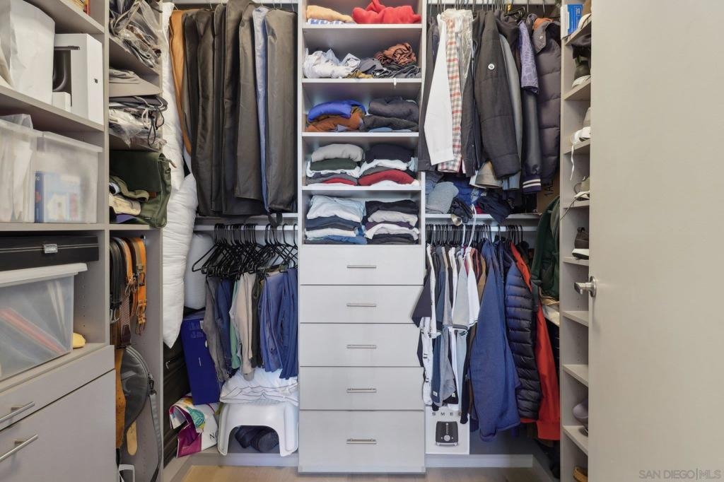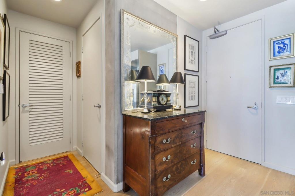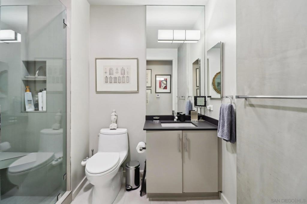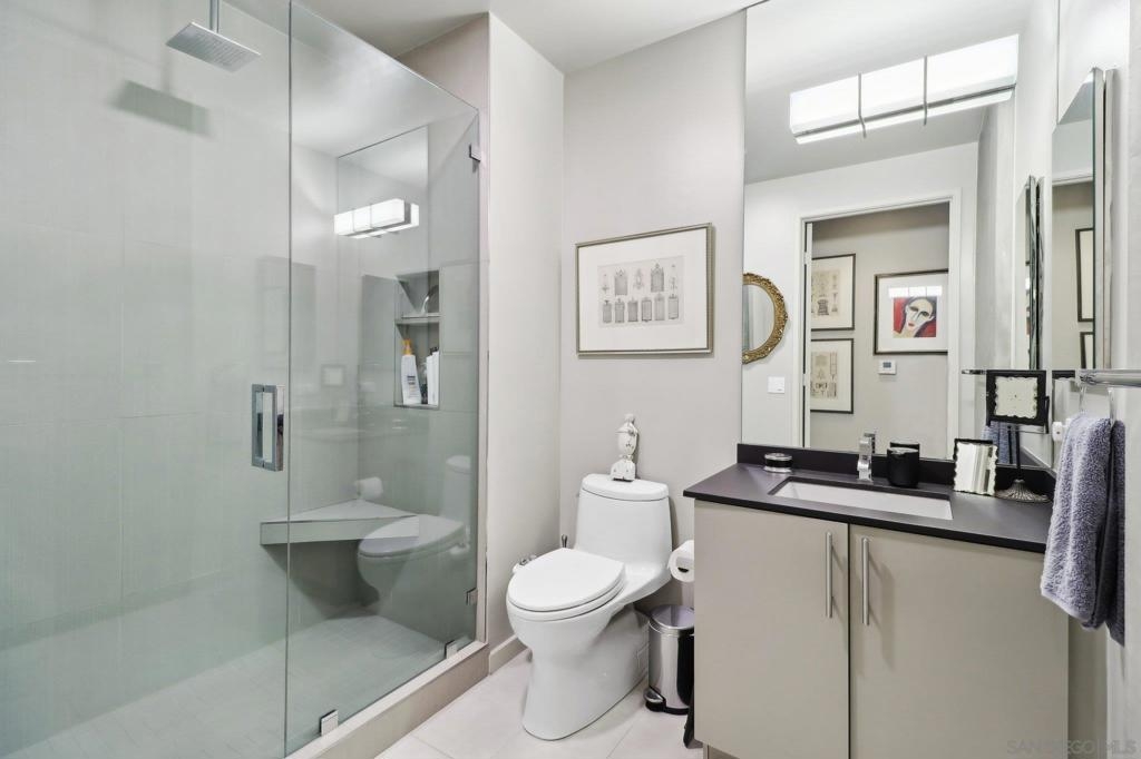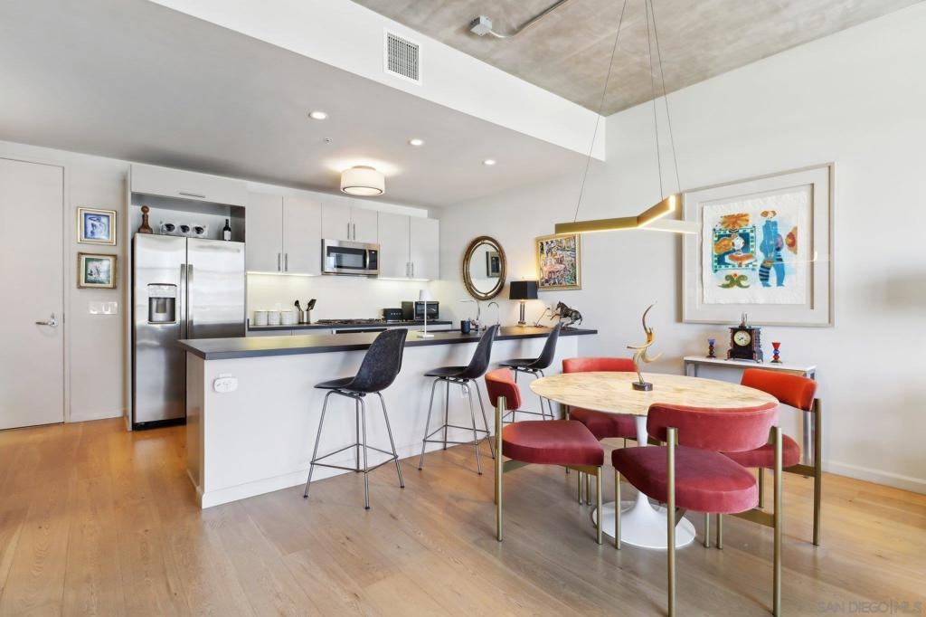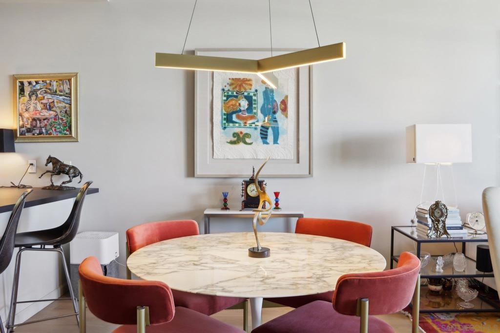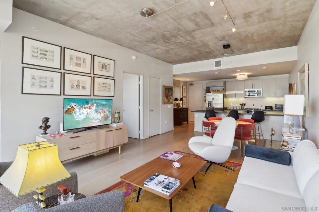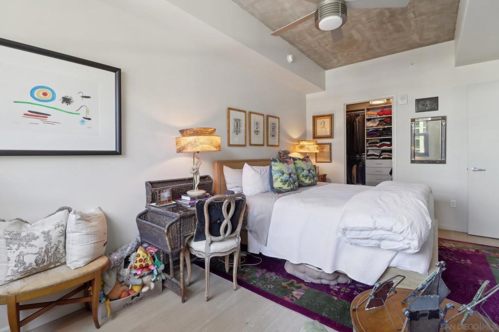Welcome to one of the most sought-after larger one-bedroom residences in Aperture, perfectly situated in Little Italy. This highly upgraded condo offers an ideal blend of vibrant city living and peaceful retreat and is located just steps from the farmer's market, restaurants, FIT gym and a Whole Foods to open early 2026. You will find a generous, open floor plan that showcases floor-to-ceiling windows framing stunning bay views and breathtaking sunsets. European oak hardwood floors throughout the space, a custom-built desk, window shades, and a statement light fixture in the dining area. The balcony has plenty of room for a cafe table and chairs, including a custom screen door to enjoy the western breezes. The large, modern and updated kitchen features newer appliances, sleek high end Dekton countertops (modern stone material of glass, porcelain, and natural quartz create a high-quality, durable surface), high-end fixtures, custom backsplash, and updated lighting. Relax in the king-sized bedroom with a cozy sitting area and partial bay views. The spacious, custom walk-in closet boasts built-in drawers, a hamper, and floor-to-ceiling shoe rack, with plenty of additional storage. The remodeled bathroom has a glass-enclosed stand-up shower, Toto toilet, bidet, Dekton countertops, designer fixtures, and new tile flooring. Additional features include a full-size stackable washer & dryer, one secure, underground parking space and a relatively low HOA fee. This beautifully appointed, turnkey condo is an exceptional opportunity for sophisticated urban living.
