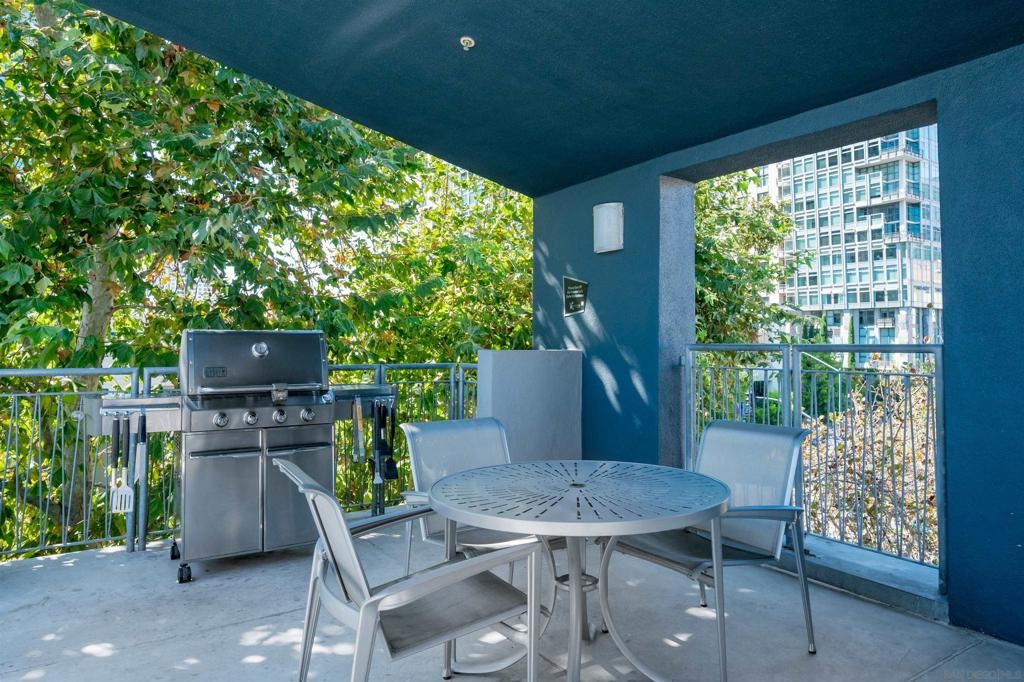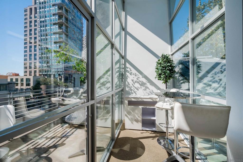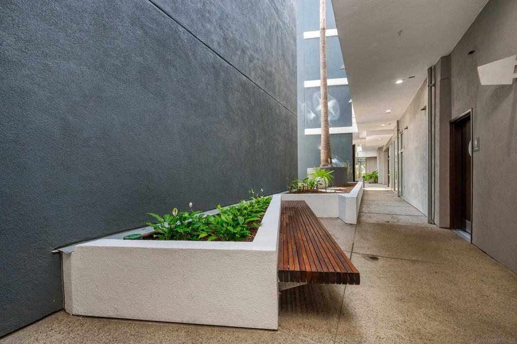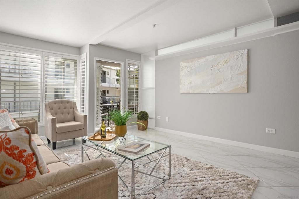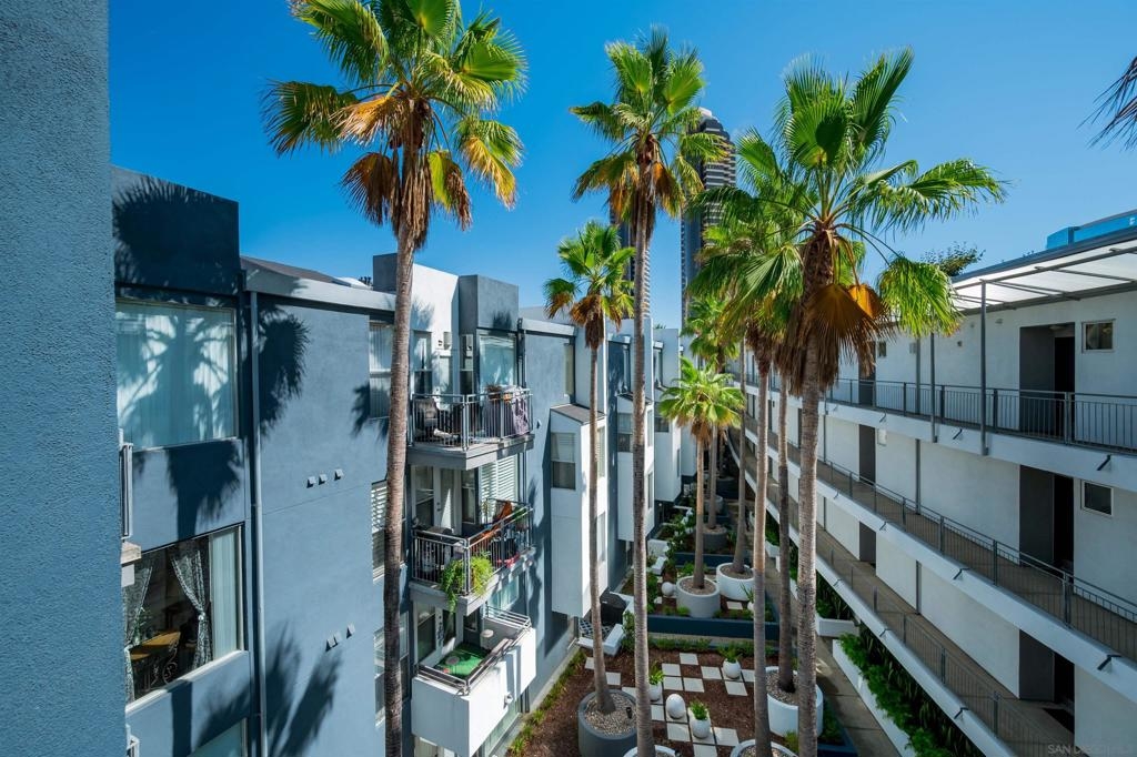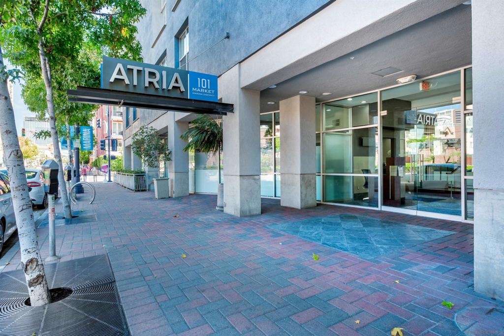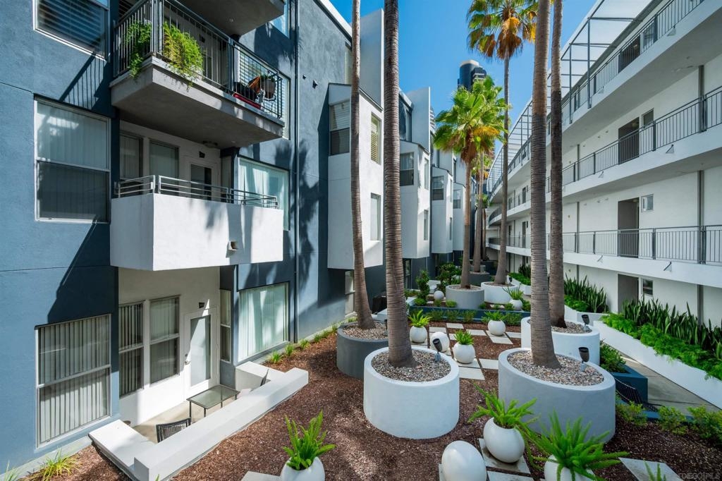 Discover prime living in this upscale 1-bedroom ATRIA residence, ideally located on the 3rd floor with a serene courtyard view. Enjoy seamless indoor/outdoor living and entertaining on the delightful sunny private patio. This unit boasts custom luxury upgrades, including sleek porcelain tile floors, plantation shutters, and designer paint. The gorgeous kitchen features granite countertops, stainless steel appliances, and ample cabinet space. Additionally, a new HVAC system was installed in January 2024. The residence also offers the convenience of in-unit laundry. Atria centrally located in the highly sought after Marina District. Completed in 2002, Atria features 149 residences in two 4-story mid-rise buildings which include 101 Market Street and 120 Island Avenue These ultimate addresses offers easy access to the best the city has to offer, including Petco Park, Seaport Village, and the Gaslamp District for entertainment, dining, and shopping. Atria amenities include contemporary lobby, Secure Gated Building, state-of-the-art fitness center, business center, meeting room, two rooftop lounges with BBQ's, gated underground parking, bike storage and security, and on-site property manager.