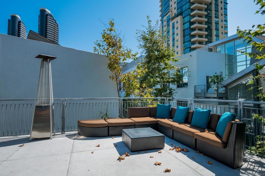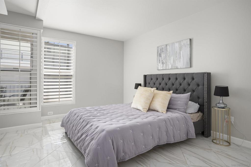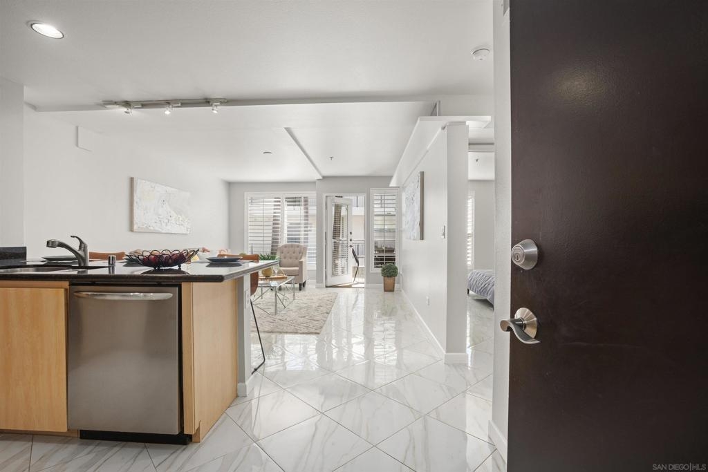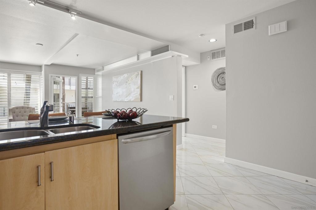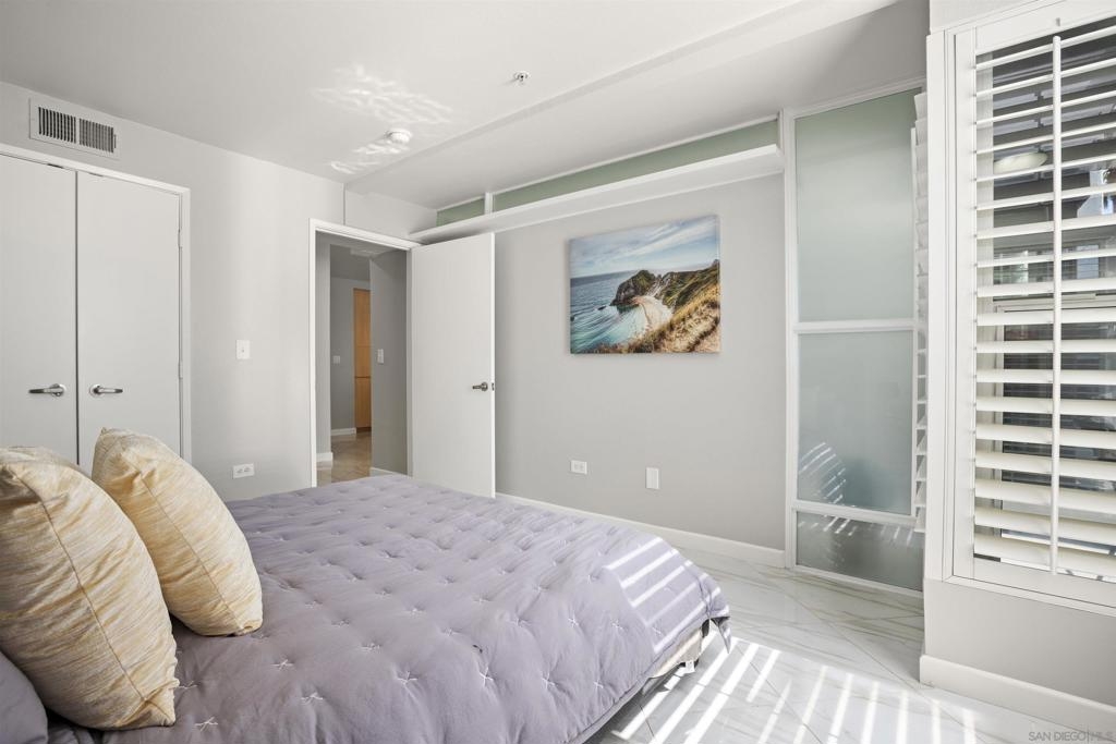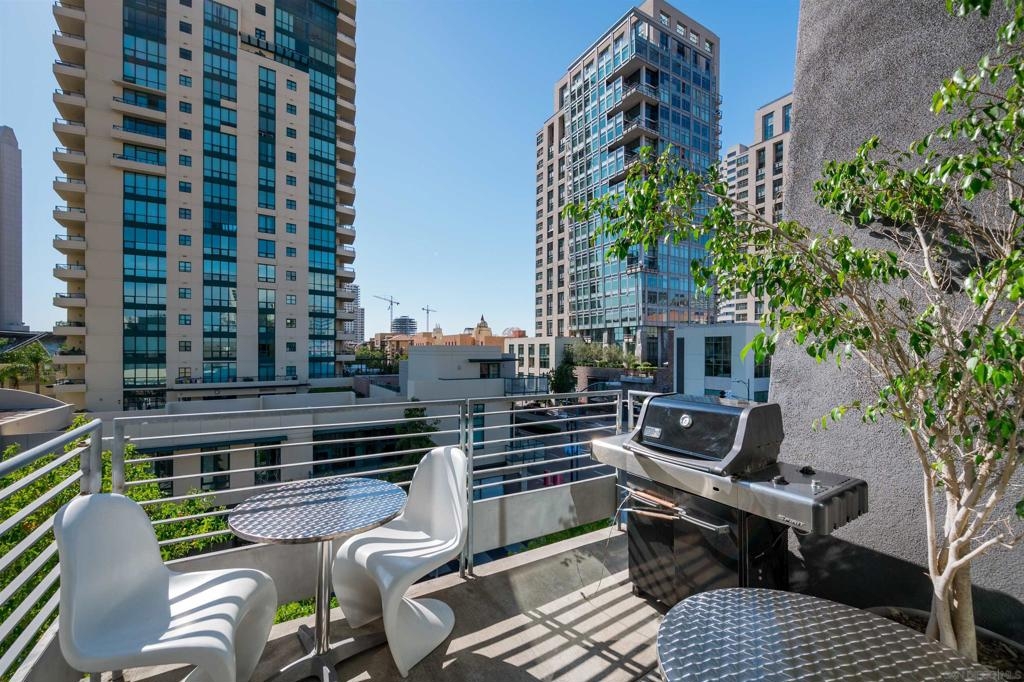 Discover prime living in this upscale 1-bedroom ATRIA residence, ideally located on the 3rd floor with a serene courtyard view. Enjoy seamless indoor/outdoor living and entertaining on the delightful sunny private patio. This unit boasts custom luxury upgrades, including sleek porcelain tile floors, plantation shutters, and designer paint. The gorgeous kitchen features granite countertops, stainless steel appliances, and ample cabinet space. Additionally, a new HVAC system was installed in January 2024. The residence also offers the convenience of in-unit laundry. Atria centrally located in the highly sought after Marina District. Completed in 2002, Atria features 149 residences in two 4-story mid-rise buildings which include 101 Market Street and 120 Island Avenue These ultimate addresses offers easy access to the best the city has to offer, including Petco Park, Seaport Village, and the Gaslamp District for entertainment, dining, and shopping. Atria amenities include contemporary lobby, Secure Gated Building, state-of-the-art fitness center, business center, meeting room, two rooftop lounges with BBQ's, gated underground parking, bike storage and security, and on-site property manager.