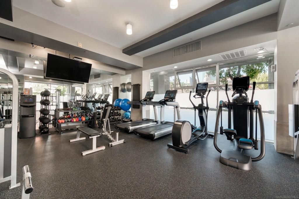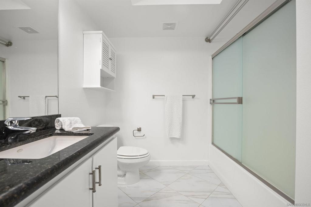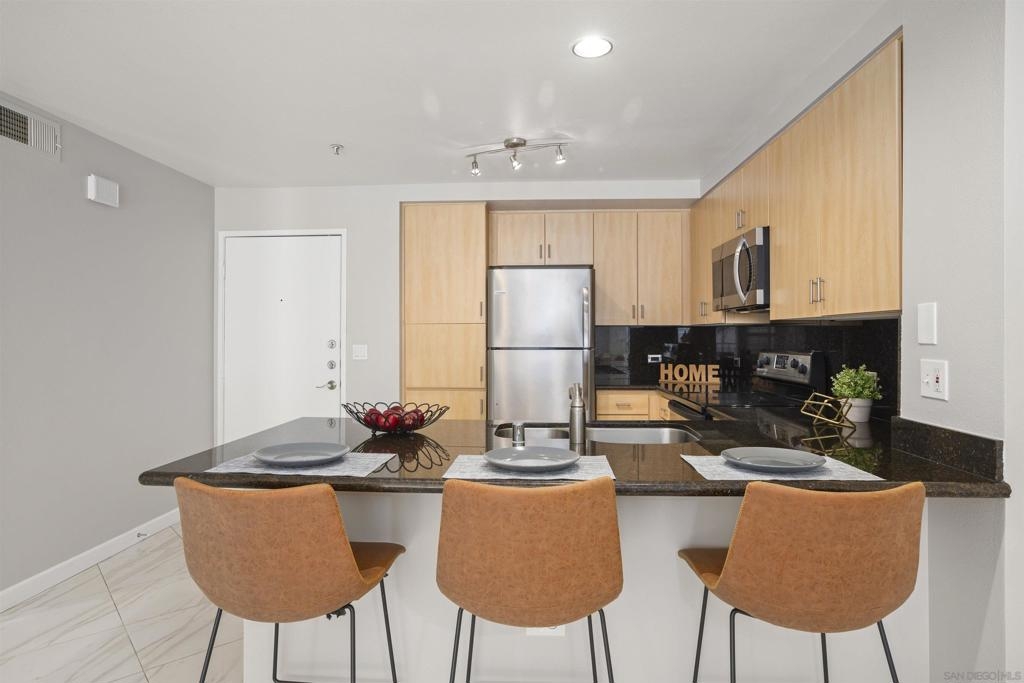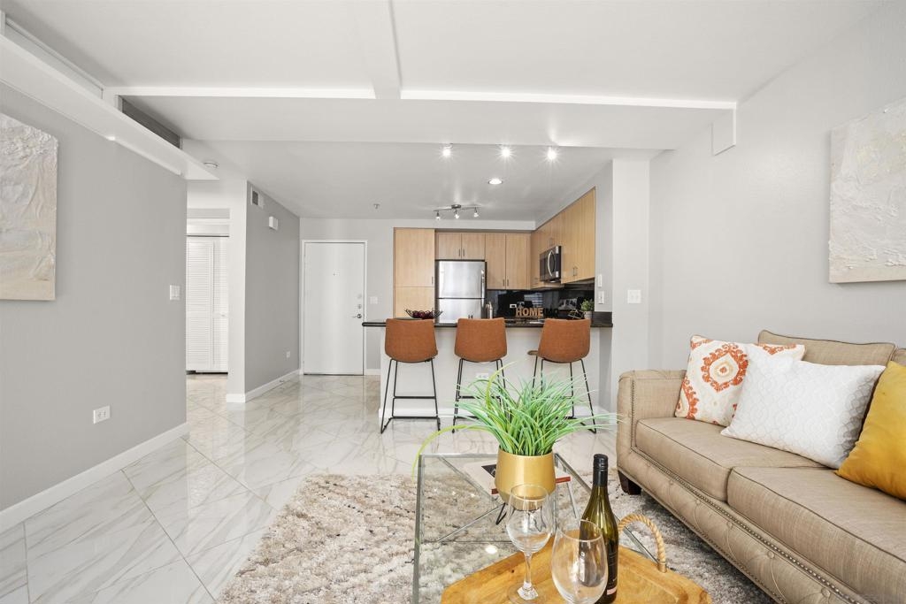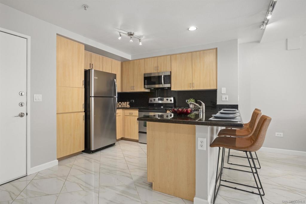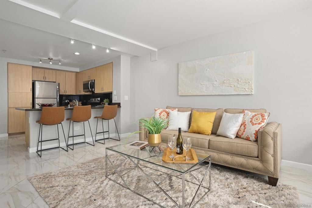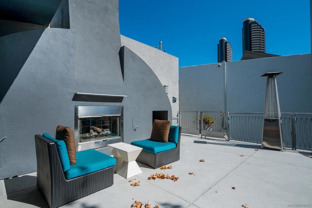Discover prime living in this upscale 1-bedroom ATRIA residence, ideally located on the 3rd floor with a serene courtyard view. Enjoy seamless indoor/outdoor living and entertaining on the delightful sunny private patio. This unit boasts custom luxury upgrades, including sleek porcelain tile floors, plantation shutters, and designer paint. The gorgeous kitchen features granite countertops, stainless steel appliances, and ample cabinet space. Additionally, a new HVAC system was installed in January 2024. The residence also offers the convenience of in-unit laundry. Atria centrally located in the highly sought after Marina District. Completed in 2002, Atria features 149 residences in two 4-story mid-rise buildings which include 101 Market Street and 120 Island Avenue These ultimate addresses offers easy access to the best the city has to offer, including Petco Park, Seaport Village, and the Gaslamp District for entertainment, dining, and shopping. Atria amenities include contemporary lobby, Secure Gated Building, state-of-the-art fitness center, business center, meeting room, two rooftop lounges with BBQ's, gated underground parking, bike storage and security, and on-site property manager.