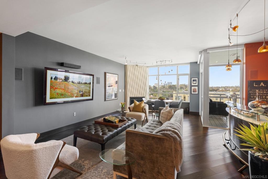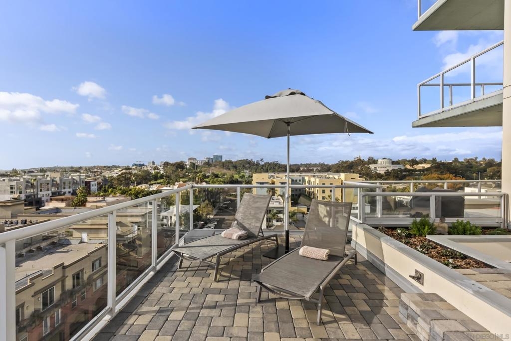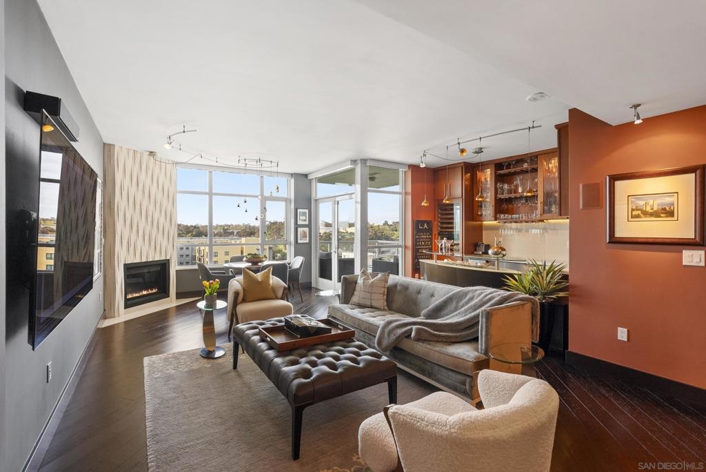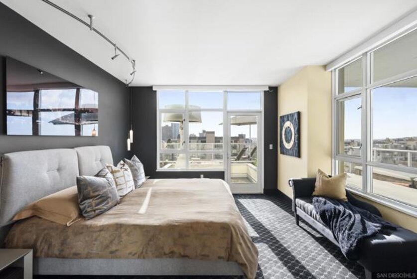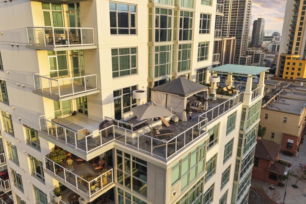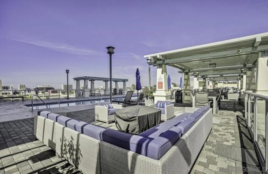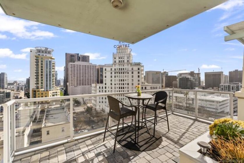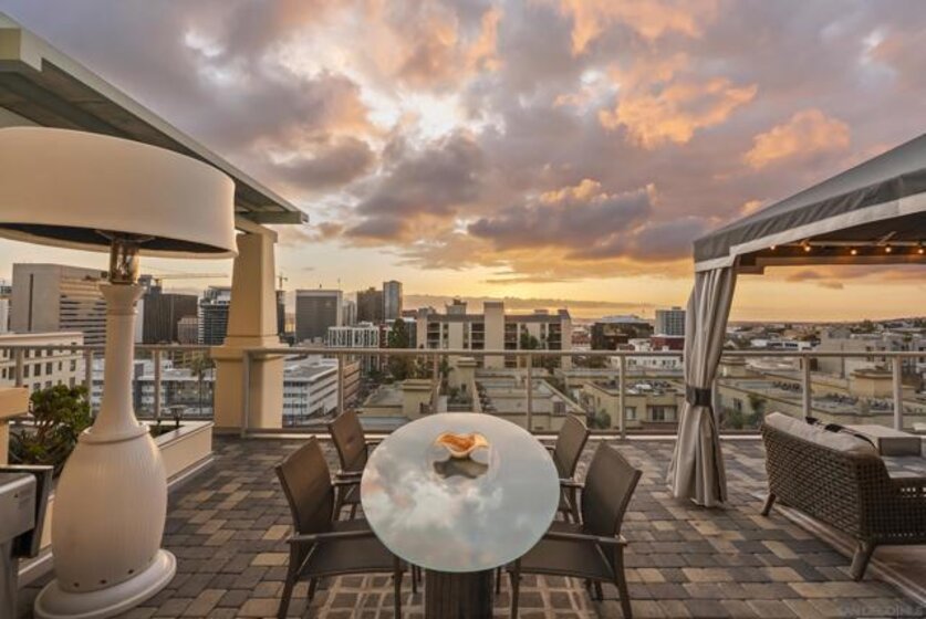 Experience year-round indoor-outdoor living in this rare luxury residence, highlighted by a spacious wraparound terrace with multiple seating areas, BBQ, firepit, cabana, garden, and sweeping views of the city, landmarks, parks, and mountains. Inside, no detail has been overlooked—custom Italian doors, bamboo espresso flooring, designer shades, art lighting, and two elegant fireplaces create a refined ambiance, enhanced by a Denon audio system. The versatile floor plan showcases a striking entry, an art gallery flex space with accordion doors to the terrace, formal living and dining rooms, a den/family room, and split bedrooms for privacy. Two primary suites boast spa-like baths and walk-in closets, with the main suite offering direct terrace access. The den features a wet bar, wine fridge, ice maker, and private balcony—perfect for entertaining. The modern kitchen impresses with stone counters, sleek cabinetry, Miele appliances, dual sinks, and an island with seating. Located in the prestigious Discovery building, enjoy concierge service, a rooftop pool, spa, gym, lounge, and BBQs. Nestled in tranquil Cortez Hill yet minutes from Little Italy, the Marina District, Gaslamp, and East Village, this home blends luxury, comfort, and an unbeatable location.