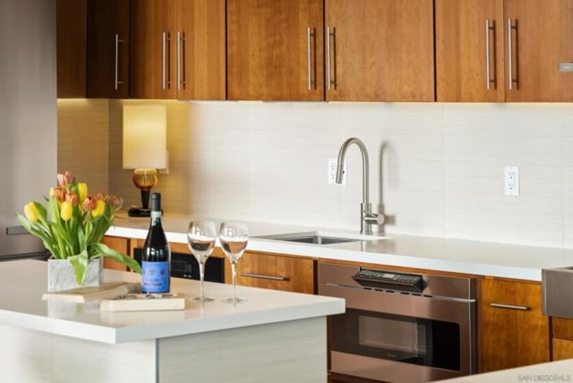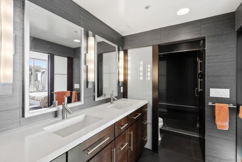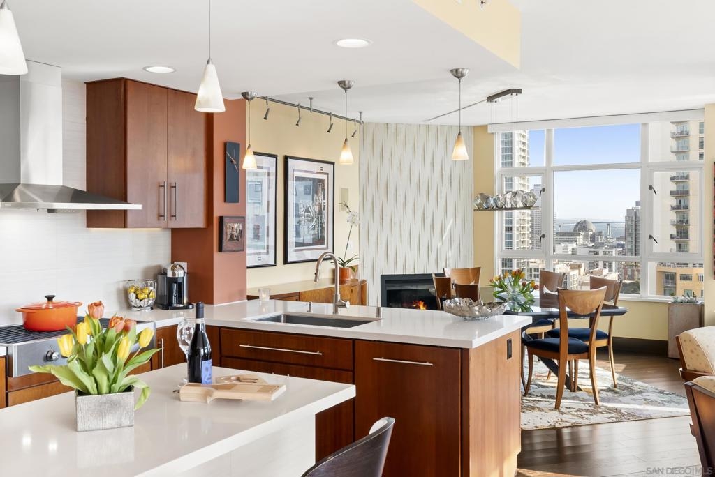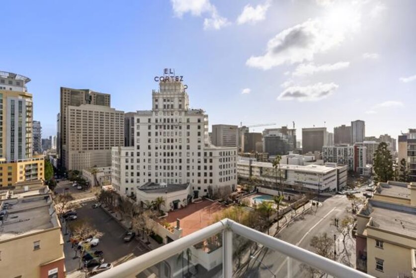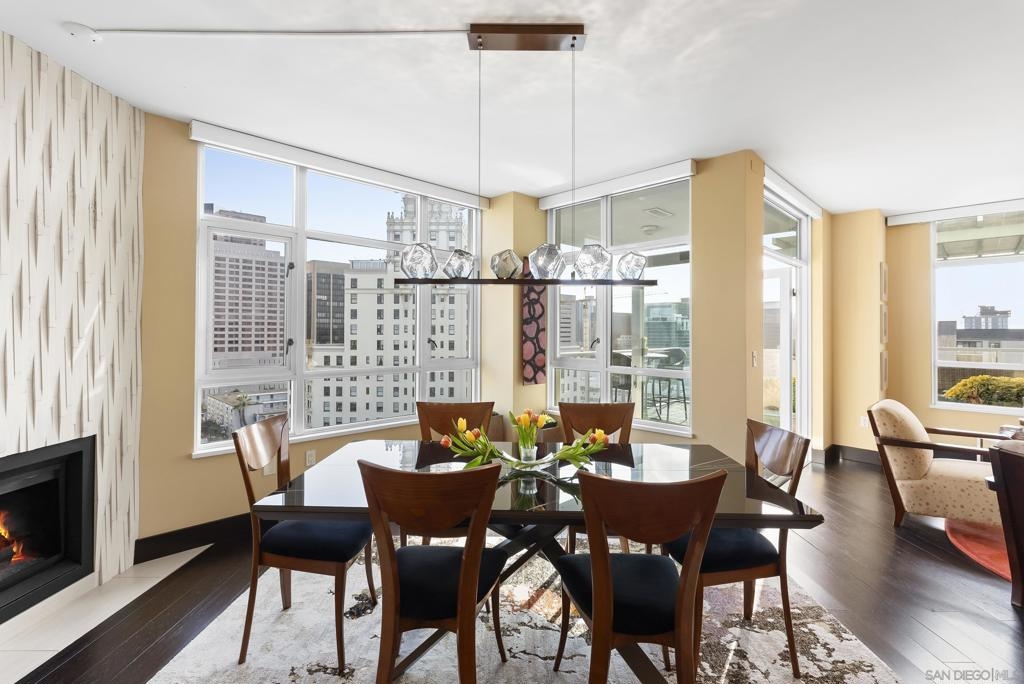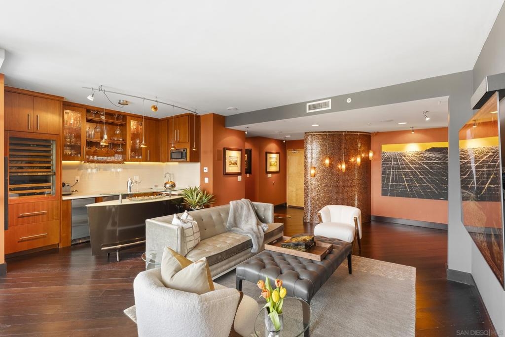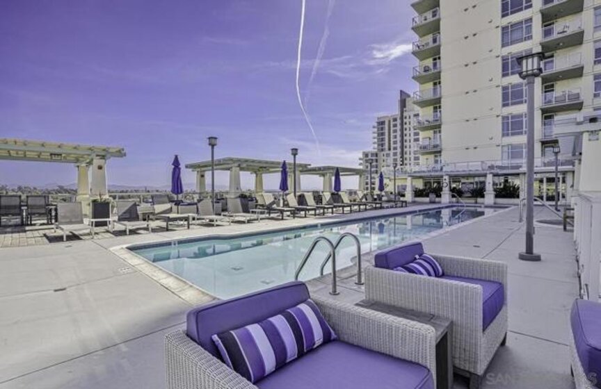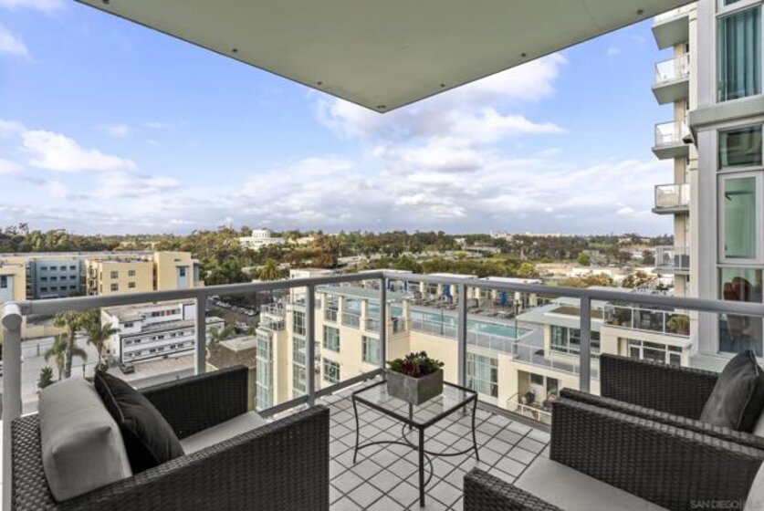 Experience year-round indoor-outdoor living in this rare luxury residence, highlighted by a spacious wraparound terrace with multiple seating areas, BBQ, firepit, cabana, garden, and sweeping views of the city, landmarks, parks, and mountains. Inside, no detail has been overlooked—custom Italian doors, bamboo espresso flooring, designer shades, art lighting, and two elegant fireplaces create a refined ambiance, enhanced by a Denon audio system. The versatile floor plan showcases a striking entry, an art gallery flex space with accordion doors to the terrace, formal living and dining rooms, a den/family room, and split bedrooms for privacy. Two primary suites boast spa-like baths and walk-in closets, with the main suite offering direct terrace access. The den features a wet bar, wine fridge, ice maker, and private balcony—perfect for entertaining. The modern kitchen impresses with stone counters, sleek cabinetry, Miele appliances, dual sinks, and an island with seating. Located in the prestigious Discovery building, enjoy concierge service, a rooftop pool, spa, gym, lounge, and BBQs. Nestled in tranquil Cortez Hill yet minutes from Little Italy, the Marina District, Gaslamp, and East Village, this home blends luxury, comfort, and an unbeatable location.