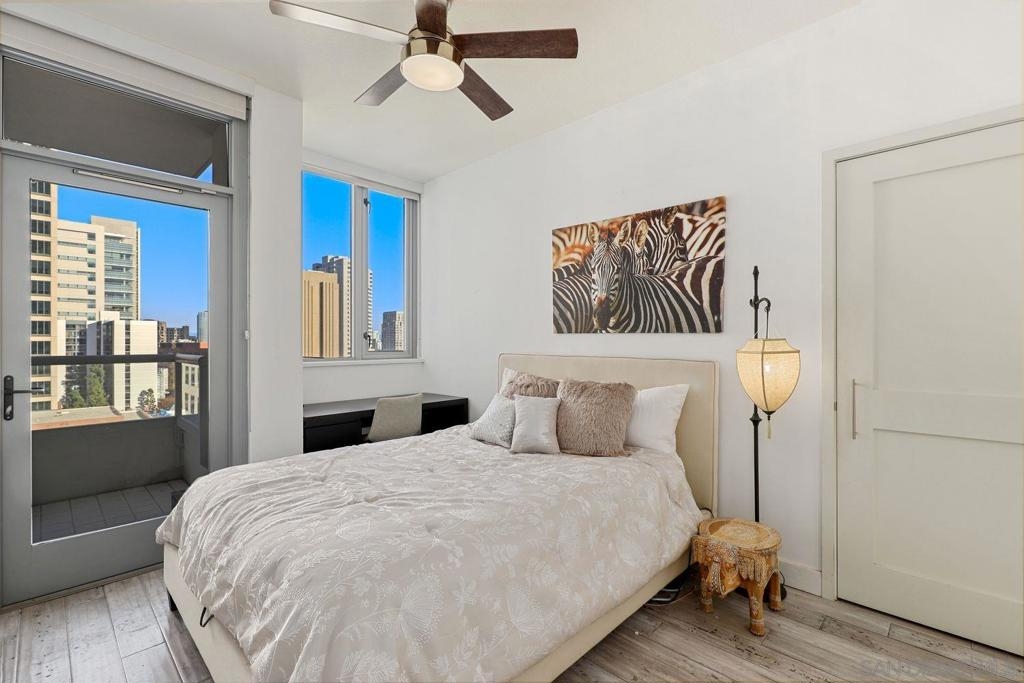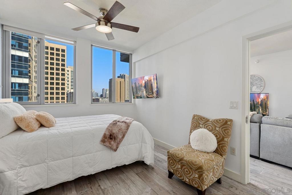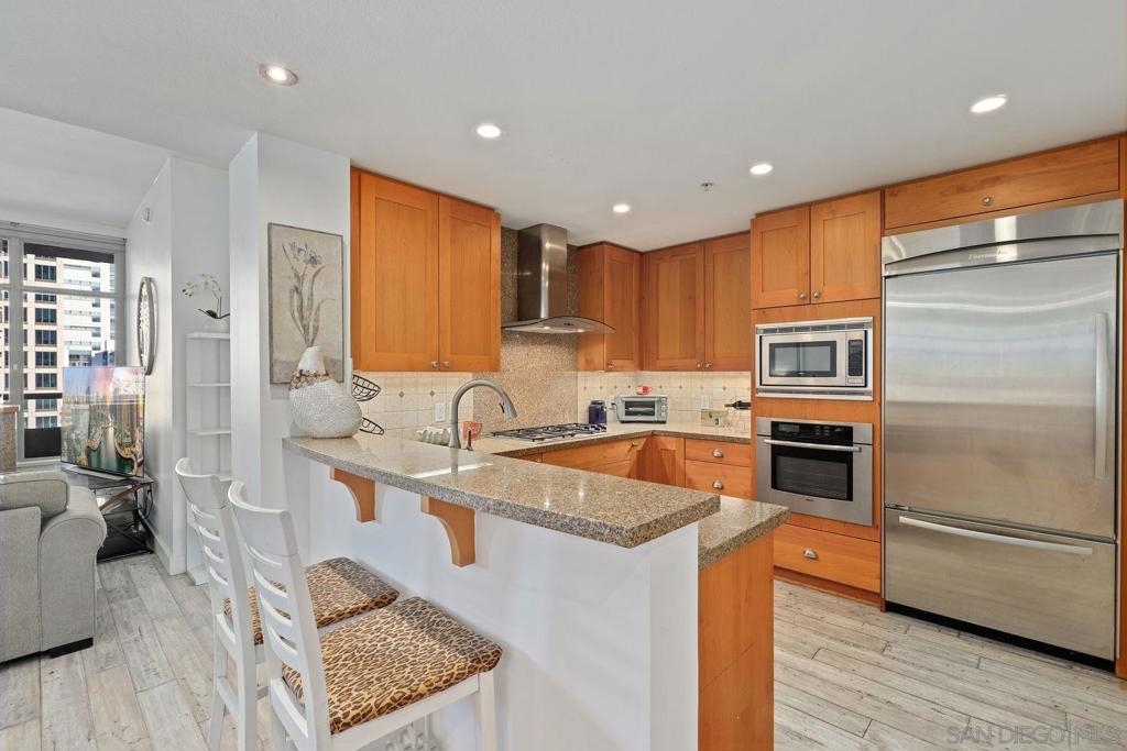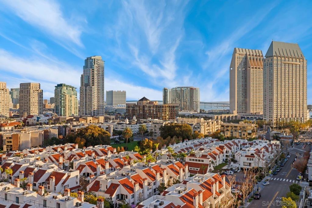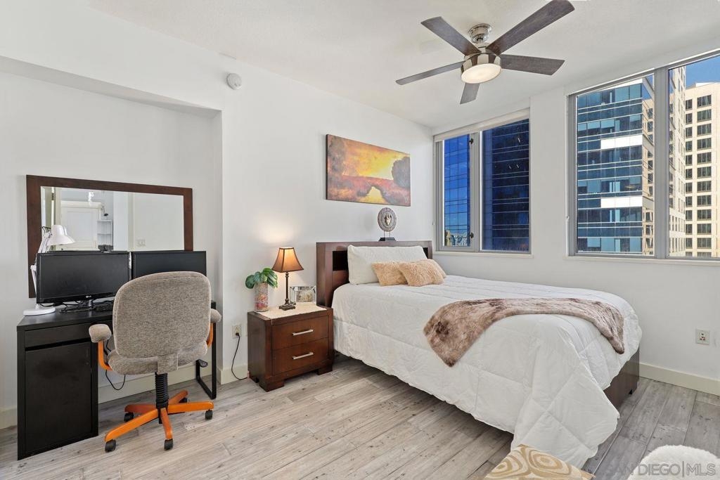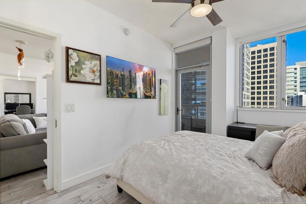 Take this opportunity to live your best life in the lap of luxury at the historical Electra building in the heart of the Marina District! This 13th floor unit enjoys sweeping views of Downtown providing spectacular sunsets and twinkling city lights all year long. Exquisite designer finishes surround you with luxurious living. The light and bright open floor plan is surrounded by windows that bathe the interior in natural light and provide commanding city views. The kitchen, dining area and living room with a cozy fireplace flow seamlessly together for ease of daily living and entertaining. A beautifully appointed kitchen boasting recessed lighting, granite countertops, stainless steel appliances, and warm honey-hued cabinetry with breakfast counter seating that opens to the living area. Sit on the balcony, day or night, sip your favorite beverage while taking in the idyllic San Diego weather. The primary bedroom offers two walk-in closets and its own en-suite bathroom. The secondary bedroom is a generous size, has a walk-in closet, and balcony access. The full-size stackable washer and dryer will take the chore out of laundry day. Electra offers its residents unparalleled amenities and services including a sparkling pools and hot tub, sauna, fully-equipped fitness center, outdoor grilling area, on-site guard, and Concierge. Dog and cat friendly complex. Parking is a breeze with one assigned space with an EV charger in the community garage. In the heart of Downtown, you have all that makes living in San Diego great at your fingertips. To see it is to love it!