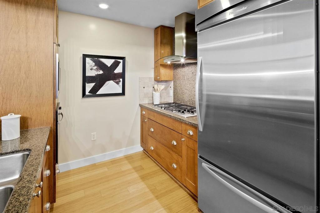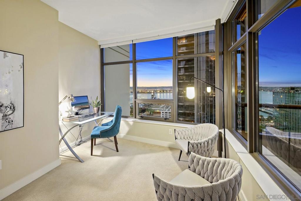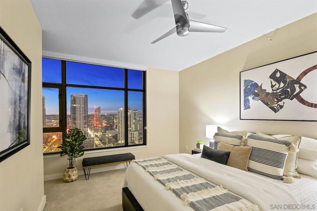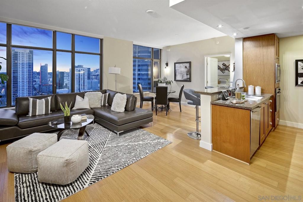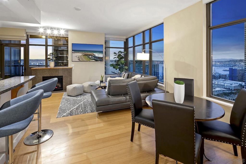 Welcome to Electra 2103! Located in one of Downtown San Diego's most luxurious condo high-rises, Electra 2103 showcases beautiful, panoramic water views to the West, & city skyline views to the North. This '03 orientation is highly sought after for its split bedroom layout, and open living area. This home is one of the few that received stylish bamboo hardwood flooring in the living area. The modern kitchen is outfitted with recessed lighting and stainless steel appliances. The in-unit, full sized, stacked washer & dryer has its own designated room. 2 parking spaces + an additional private storage cage in in the garage. Electra is widely considered as Downtown's preeminent luxury condo high-rise. Originally home to the SDGE power plant, this historical landmark was renovated, and built up in 2008. Electra amenities include: 24 hour door person, fitness center, rooftop pool & spa deck with designated BBQ area, steamroom, sauna, and community conservatory with ample seating spaces and extra kitchen. Complex Features: ,,,,,,,, Equipment: Dryer,Fire Sprinklers,Garage Door Opener, Range/Oven, Washer Sewer: Sewer Connected Topography: LL