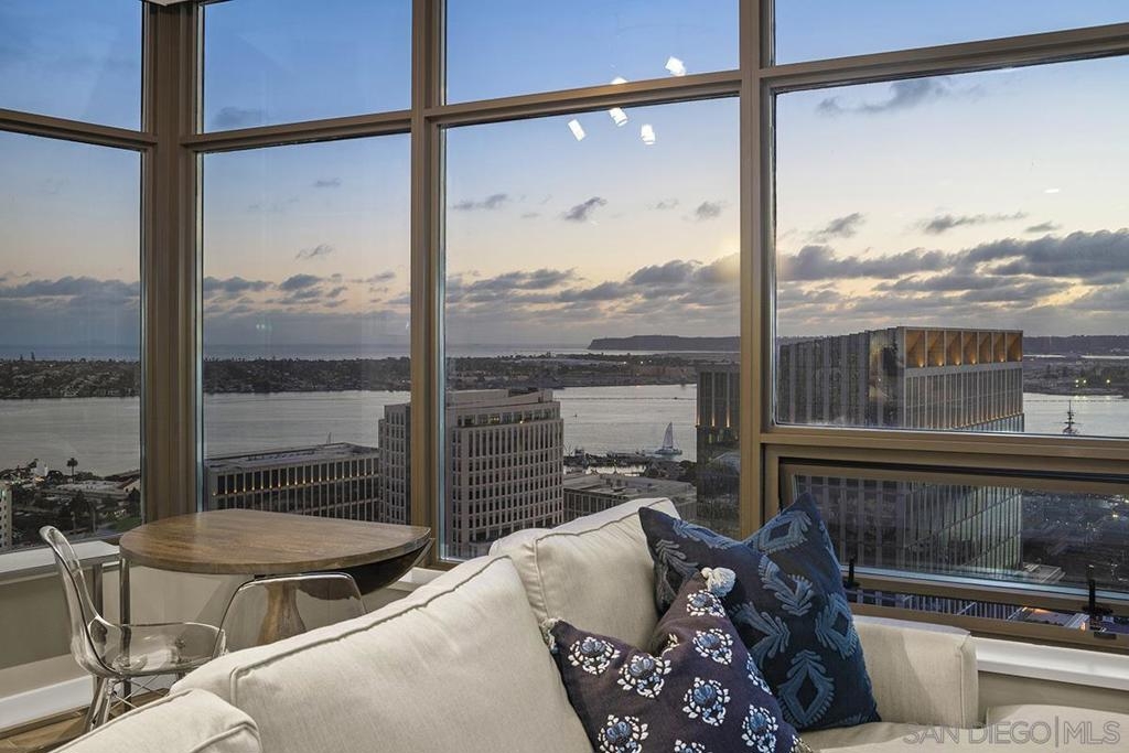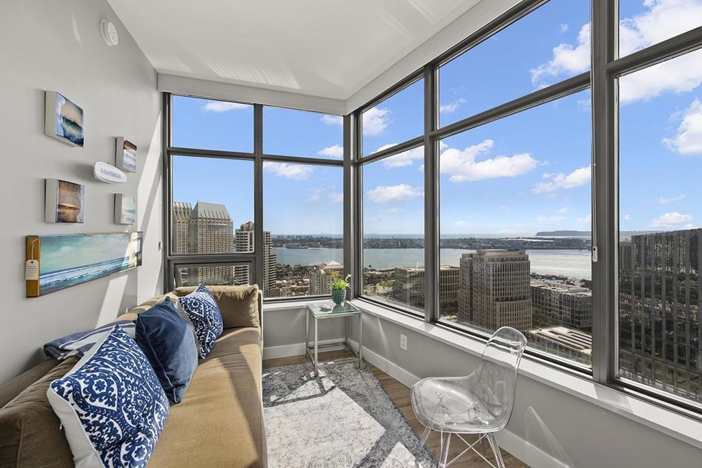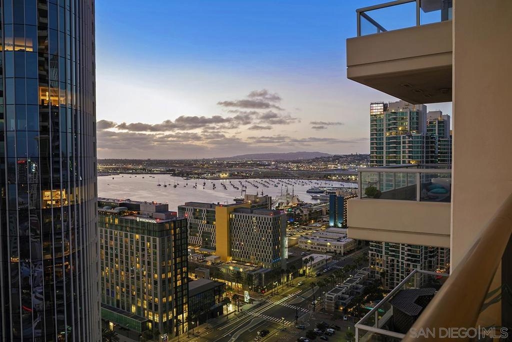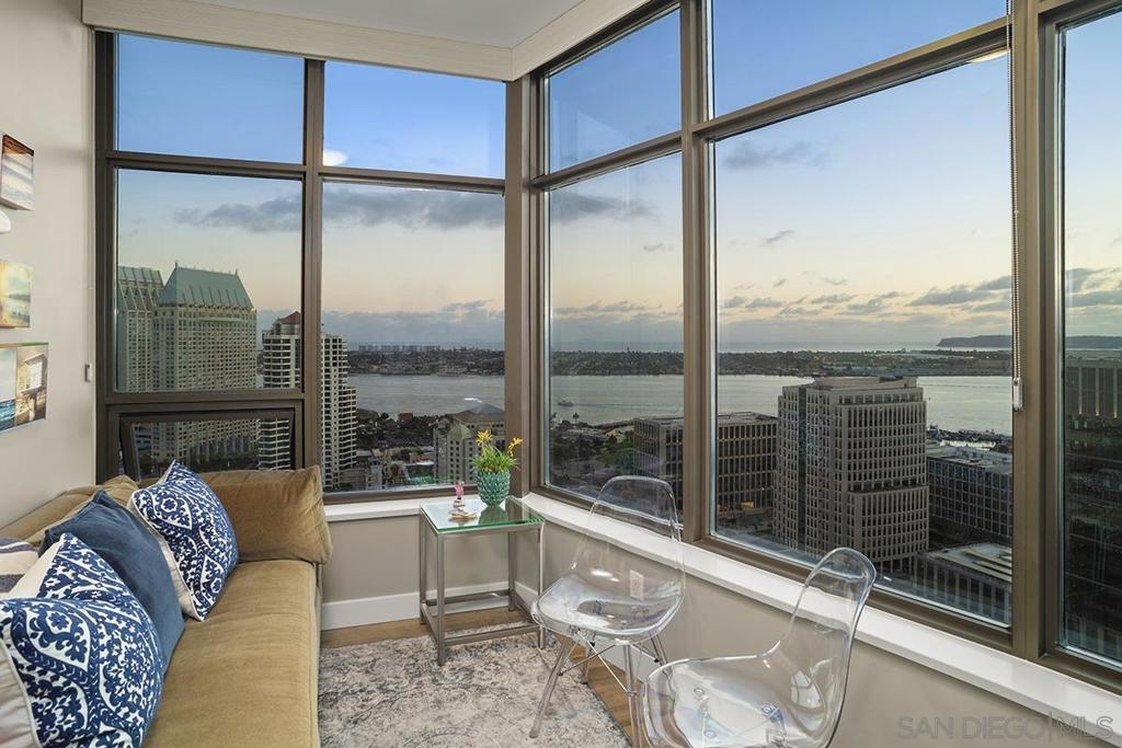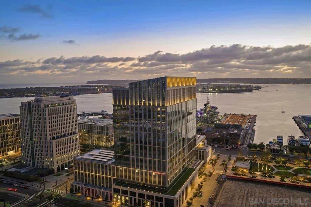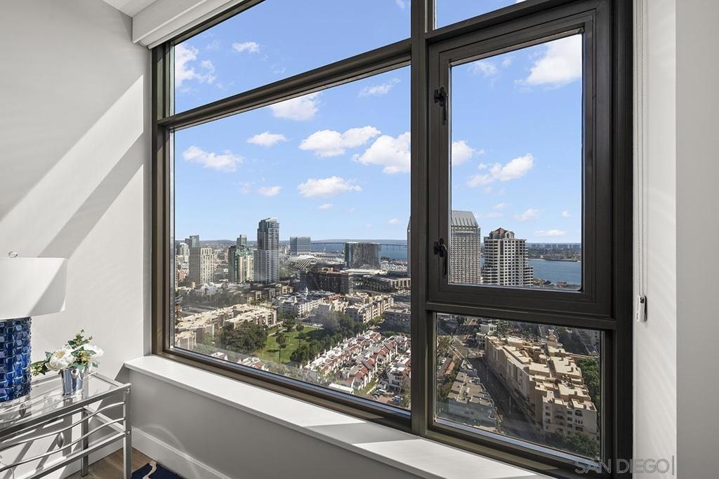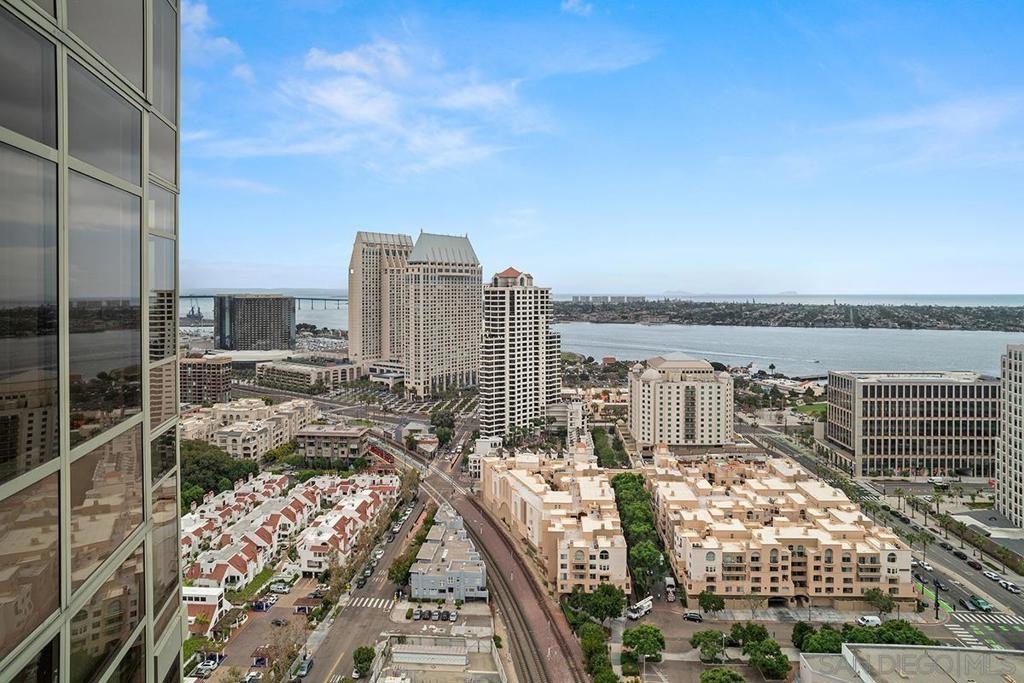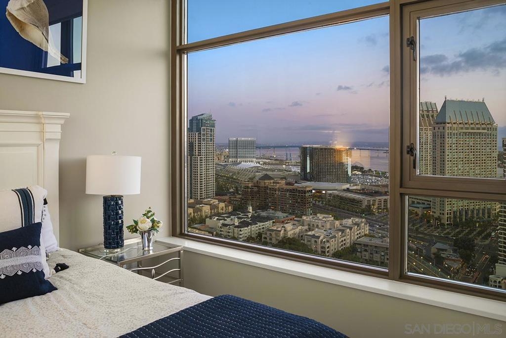 Elevated high above San Diego Bay, this exquisitely reimagined residence 2 bedroom + office/den offers breathtaking views of the vibrant cityscape and iconic waterfront. Thoughtfully and thoroughly remodeled, the home showcases elegant upgrades, including porcelain tile flooring, custom built-in cabinetry with quartz countertops, and a private balcony—perfect for enjoying San Diego's spectacular sunsets. The fully renovated kitchen is a culinary haven, equipped with premium Bosch stainless appliances, a Thermador refrigerator, quartz countertops, a custom tile backsplash, recessed lighting, and a breakfast bar for casual dining. The adjacent living area features custom built-ins offering ample storage, a wine chiller, motorized shades, and a ceiling fan for added comfort. The serene primary bedroom is adorned with designer wall treatments and includes a spacious walk-in closet with custom organization, blackout shades, and an ensuite bathroom featuring an oversized soaking tub, step-in shower, dual vanities, and quartz countertops. An additional generously sized bedroom, complete with dual closets and blackout shades, along with a versatile den/home office space, adds to the home's appeal. The unit also includes a dedicated storage space and two highly coveted side-by-side parking spaces. With its seamless blend of style and functionality, this home epitomizes refined urban living in the heart of San Diego. Offering a fabulous location in the coveted Columbia District, you will love being only a short walk to Waterfront Park, Seaport Village, The Headquarters, and the brand-new Rady’s Shell at Jacobs Park, a unique live music venue and home of the San Diego Symphony! Also enjoy proximity to the future life science and biotechnology research development The Research and Development District (The RaDD) at the Embarcadero and the sustainable tech-focused Horton Plaza Redevelopment in the center of the city. Electra has the unique distinction of being built around the historical 1928 SDG&E Station B. Residents can take advantage of an array of services including a concierge, top notch security, and guest parking spaces available by reservation through a simple mobile app. Luxuriate in a steam room, resort-style pool and spa, fitness center, and Electra Park on the 5th floor where you may seek respite from the hustle and bustle surrounded by lush landscaping and a romantic outdoor fireplace and top-of-the-line barbecues.