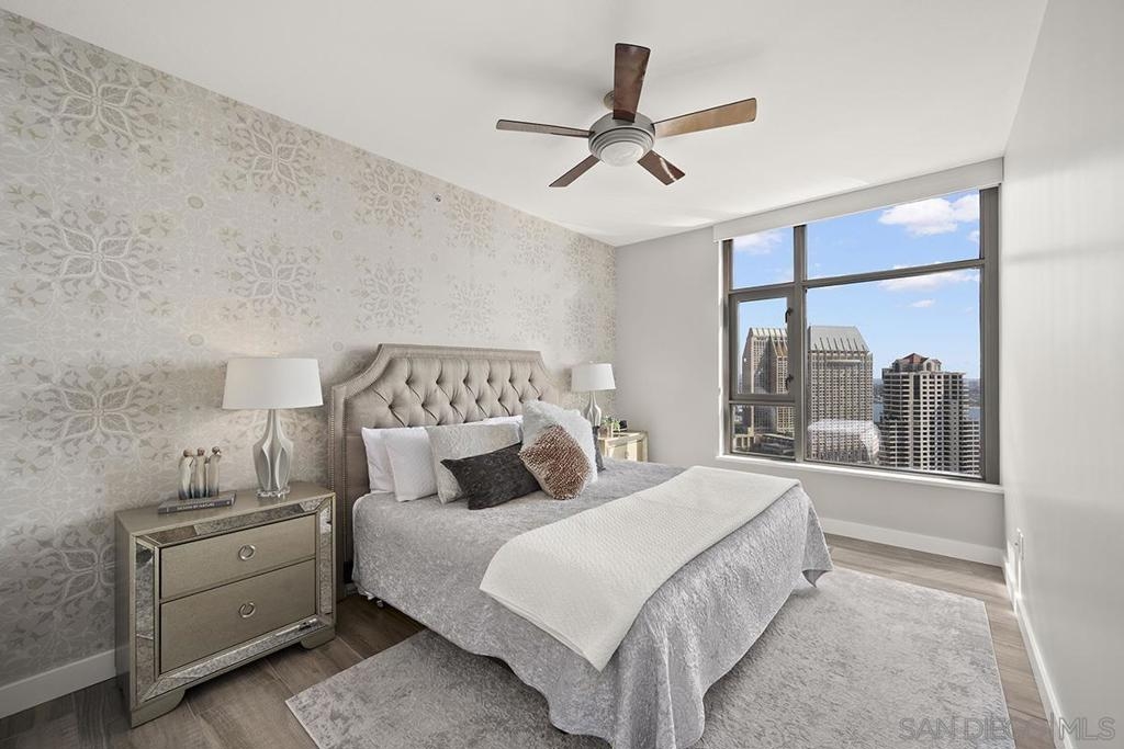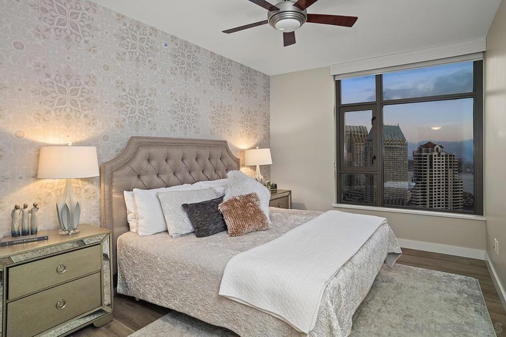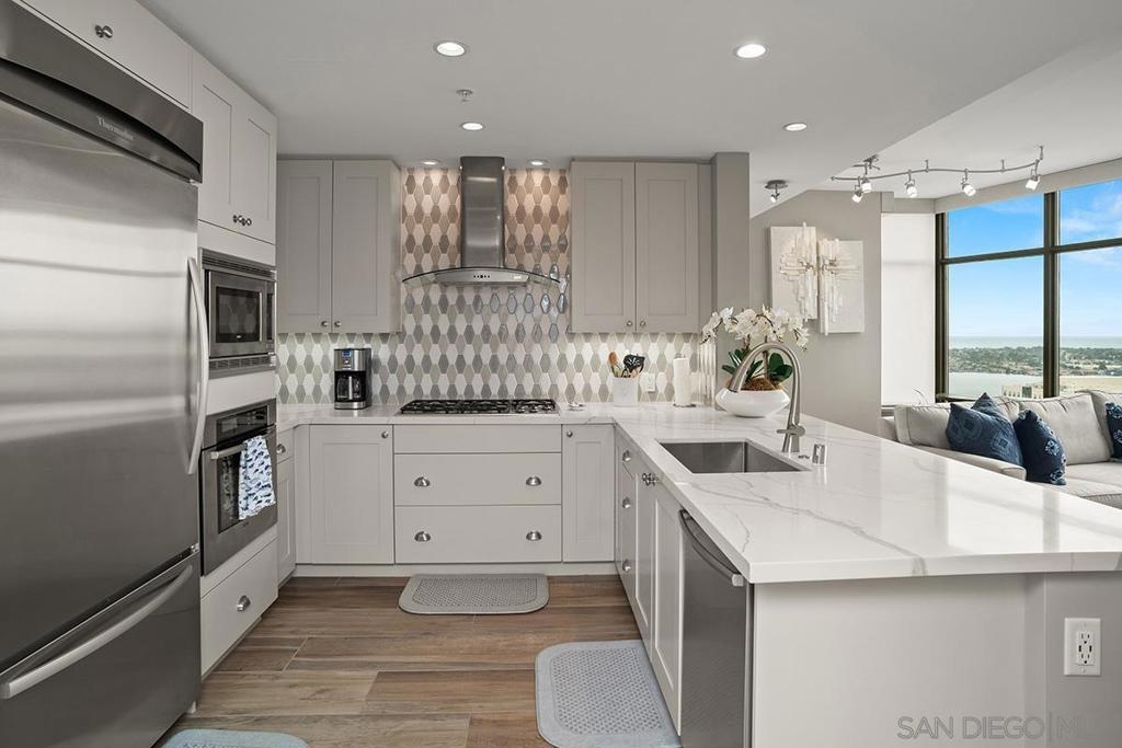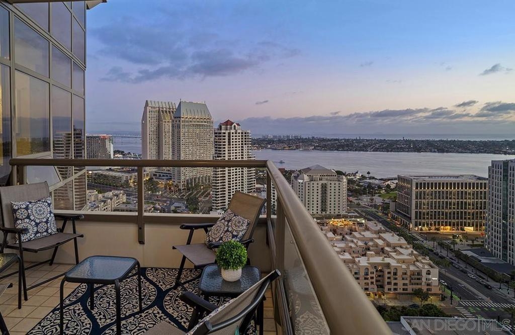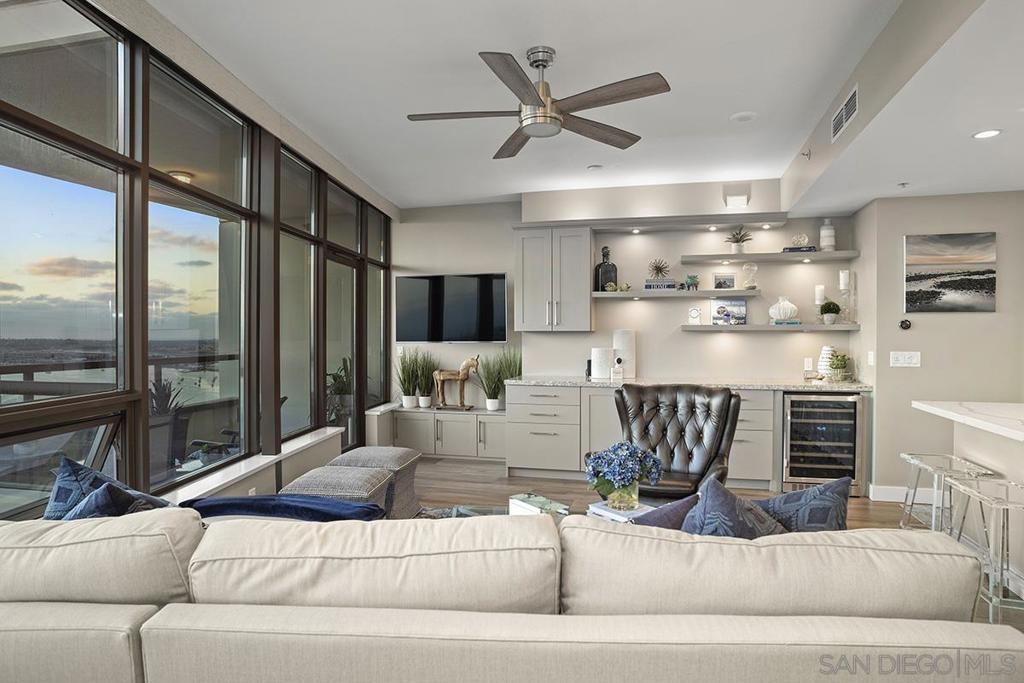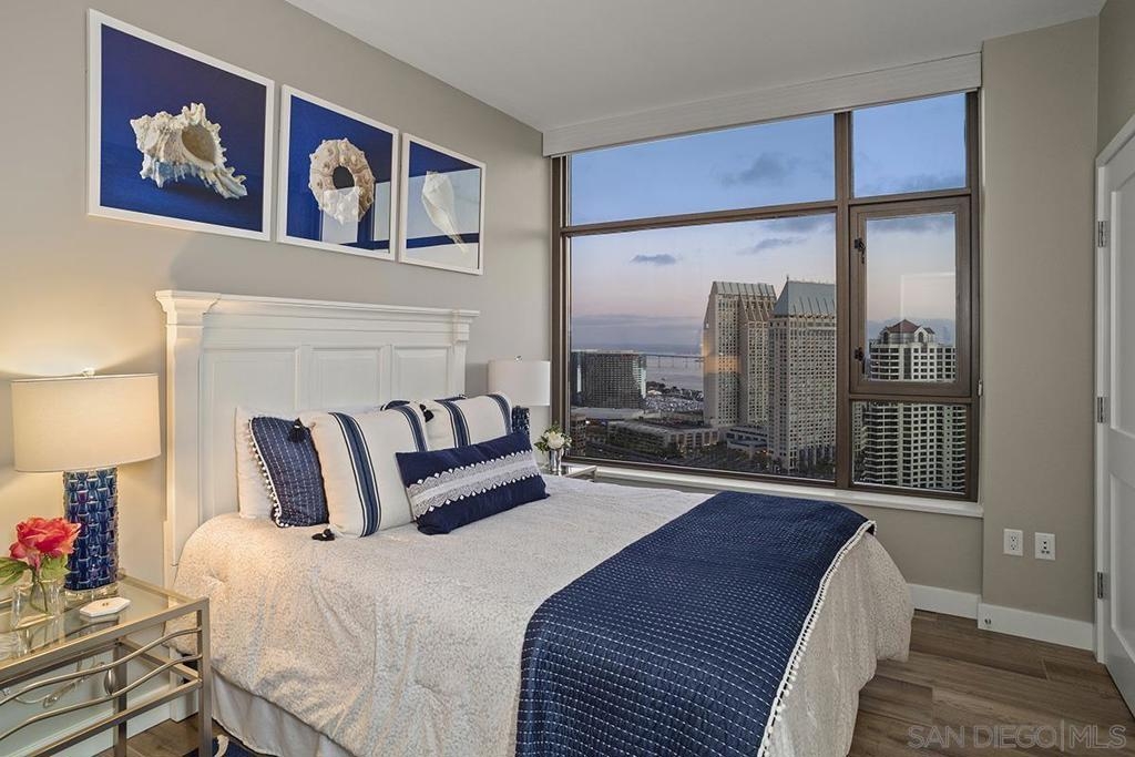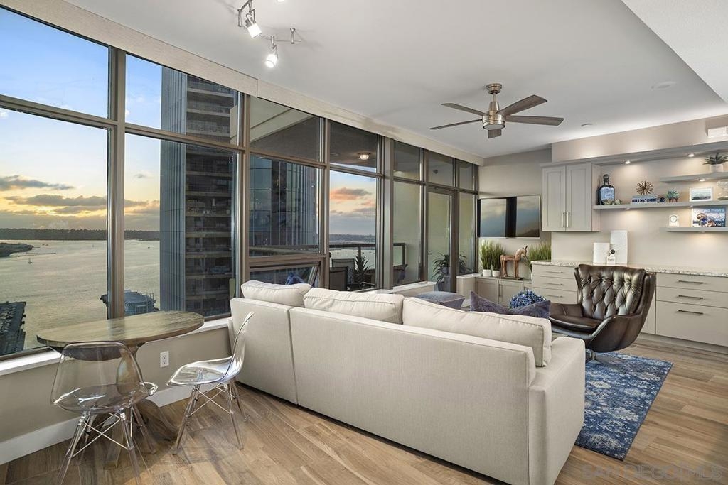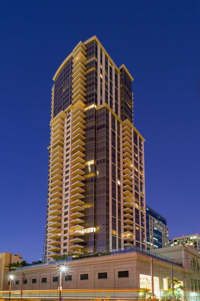 Elevated high above San Diego Bay, this exquisitely reimagined residence 2 bedroom + office/den offers breathtaking views of the vibrant cityscape and iconic waterfront. Thoughtfully and thoroughly remodeled, the home showcases elegant upgrades, including porcelain tile flooring, custom built-in cabinetry with quartz countertops, and a private balcony—perfect for enjoying San Diego's spectacular sunsets. The fully renovated kitchen is a culinary haven, equipped with premium Bosch stainless appliances, a Thermador refrigerator, quartz countertops, a custom tile backsplash, recessed lighting, and a breakfast bar for casual dining. The adjacent living area features custom built-ins offering ample storage, a wine chiller, motorized shades, and a ceiling fan for added comfort. The serene primary bedroom is adorned with designer wall treatments and includes a spacious walk-in closet with custom organization, blackout shades, and an ensuite bathroom featuring an oversized soaking tub, step-in shower, dual vanities, and quartz countertops. An additional generously sized bedroom, complete with dual closets and blackout shades, along with a versatile den/home office space, adds to the home's appeal. The unit also includes a dedicated storage space and two highly coveted side-by-side parking spaces. With its seamless blend of style and functionality, this home epitomizes refined urban living in the heart of San Diego. Offering a fabulous location in the coveted Columbia District, you will love being only a short walk to Waterfront Park, Seaport Village, The Headquarters, and the brand-new Rady’s Shell at Jacobs Park, a unique live music venue and home of the San Diego Symphony! Also enjoy proximity to the future life science and biotechnology research development The Research and Development District (The RaDD) at the Embarcadero and the sustainable tech-focused Horton Plaza Redevelopment in the center of the city. Electra has the unique distinction of being built around the historical 1928 SDG&E Station B. Residents can take advantage of an array of services including a concierge, top notch security, and guest parking spaces available by reservation through a simple mobile app. Luxuriate in a steam room, resort-style pool and spa, fitness center, and Electra Park on the 5th floor where you may seek respite from the hustle and bustle surrounded by lush landscaping and a romantic outdoor fireplace and top-of-the-line barbecues.