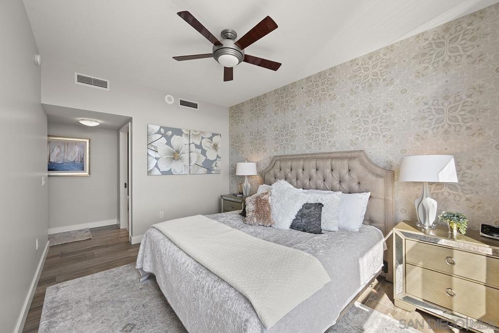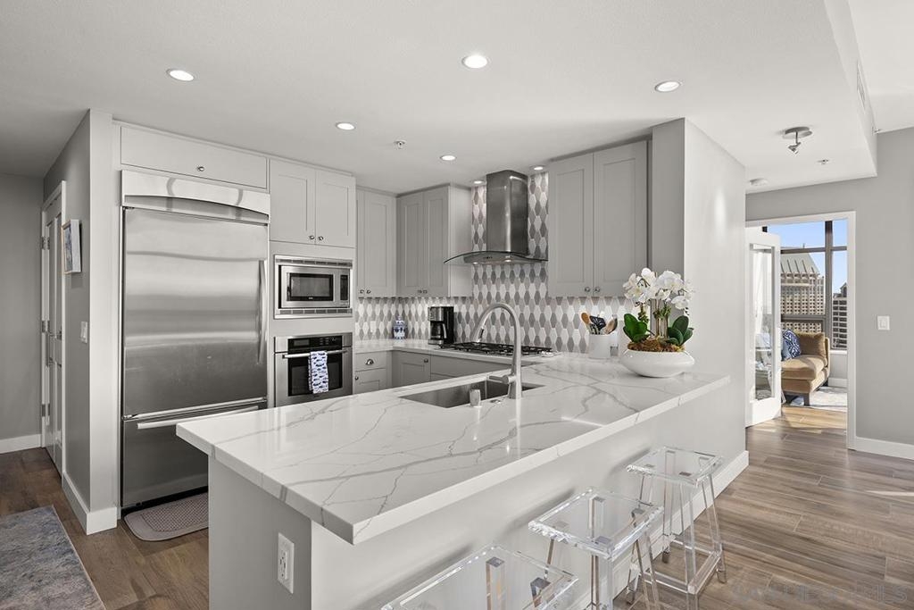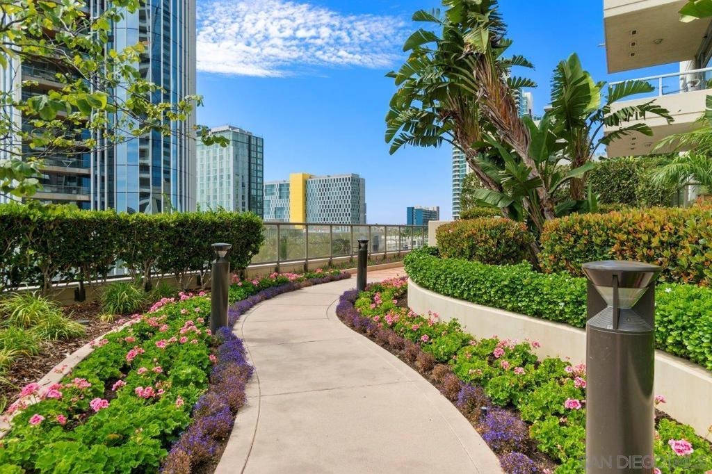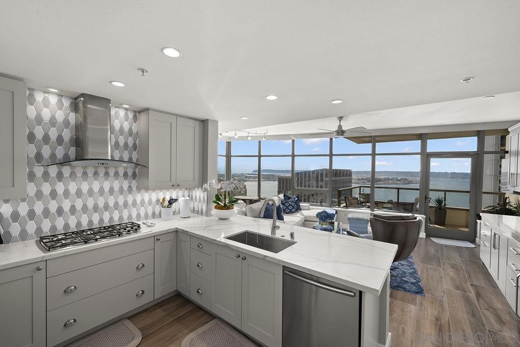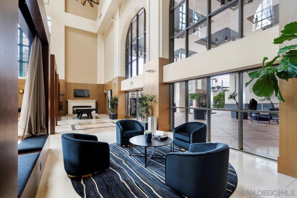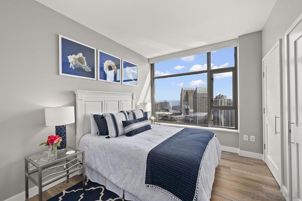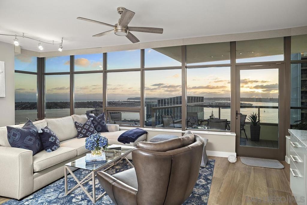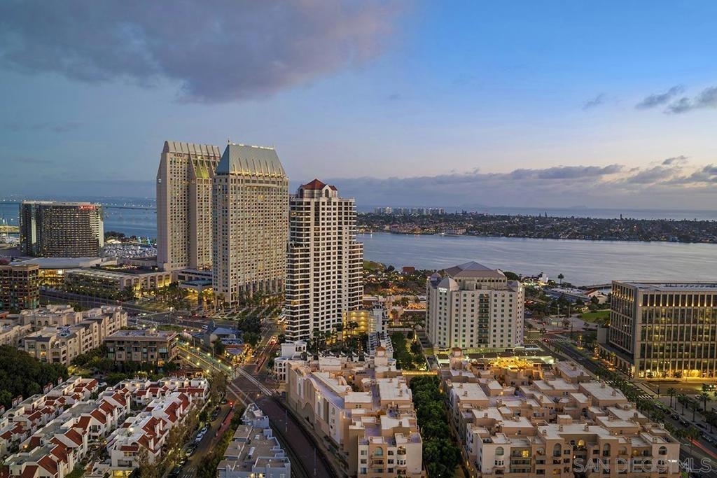 Elevated high above San Diego Bay, this exquisitely reimagined residence 2 bedroom + office/den offers breathtaking views of the vibrant cityscape and iconic waterfront. Thoughtfully and thoroughly remodeled, the home showcases elegant upgrades, including porcelain tile flooring, custom built-in cabinetry with quartz countertops, and a private balcony—perfect for enjoying San Diego's spectacular sunsets. The fully renovated kitchen is a culinary haven, equipped with premium Bosch stainless appliances, a Thermador refrigerator, quartz countertops, a custom tile backsplash, recessed lighting, and a breakfast bar for casual dining. The adjacent living area features custom built-ins offering ample storage, a wine chiller, motorized shades, and a ceiling fan for added comfort. The serene primary bedroom is adorned with designer wall treatments and includes a spacious walk-in closet with custom organization, blackout shades, and an ensuite bathroom featuring an oversized soaking tub, step-in shower, dual vanities, and quartz countertops. An additional generously sized bedroom, complete with dual closets and blackout shades, along with a versatile den/home office space, adds to the home's appeal. The unit also includes a dedicated storage space and two highly coveted side-by-side parking spaces. With its seamless blend of style and functionality, this home epitomizes refined urban living in the heart of San Diego. Offering a fabulous location in the coveted Columbia District, you will love being only a short walk to Waterfront Park, Seaport Village, The Headquarters, and the brand-new Rady’s Shell at Jacobs Park, a unique live music venue and home of the San Diego Symphony! Also enjoy proximity to the future life science and biotechnology research development The Research and Development District (The RaDD) at the Embarcadero and the sustainable tech-focused Horton Plaza Redevelopment in the center of the city. Electra has the unique distinction of being built around the historical 1928 SDG&E Station B. Residents can take advantage of an array of services including a concierge, top notch security, and guest parking spaces available by reservation through a simple mobile app. Luxuriate in a steam room, resort-style pool and spa, fitness center, and Electra Park on the 5th floor where you may seek respite from the hustle and bustle surrounded by lush landscaping and a romantic outdoor fireplace and top-of-the-line barbecues.