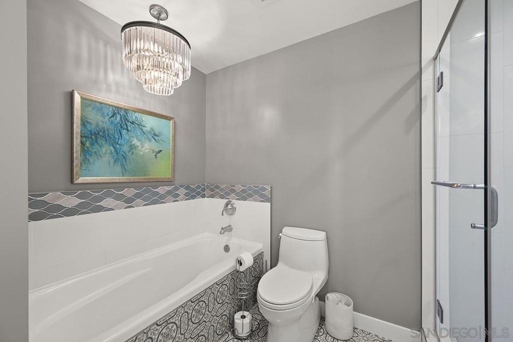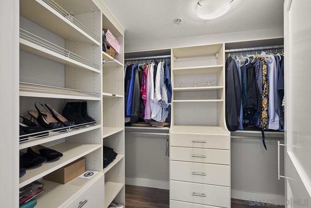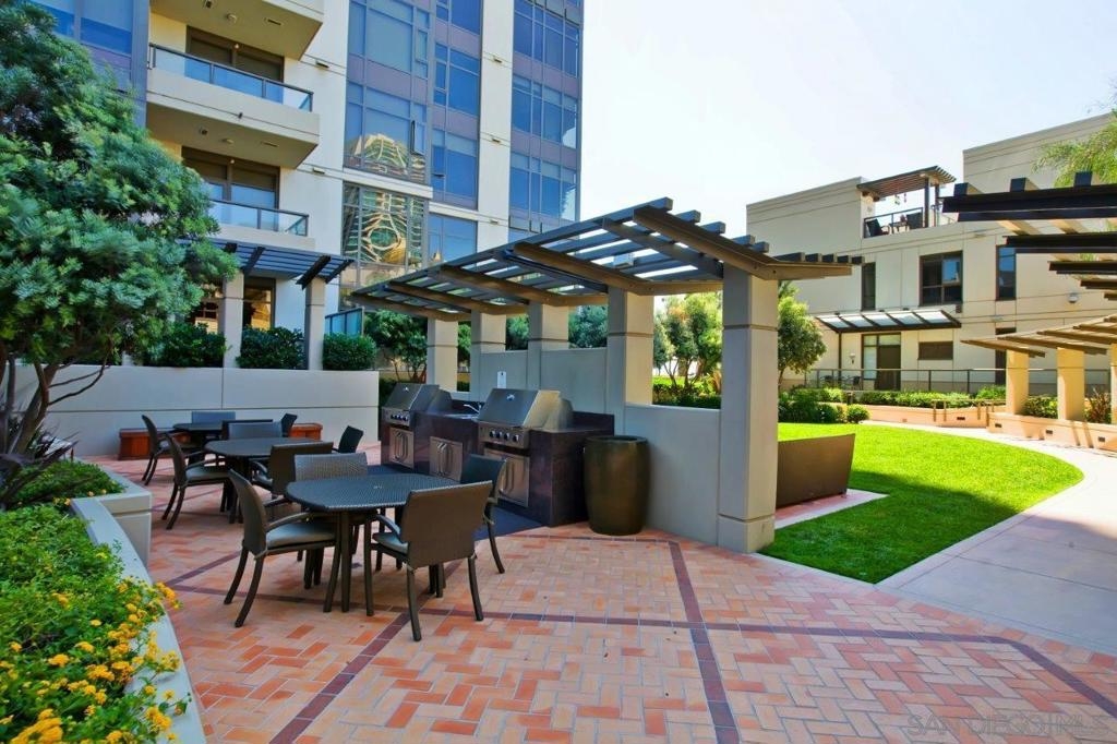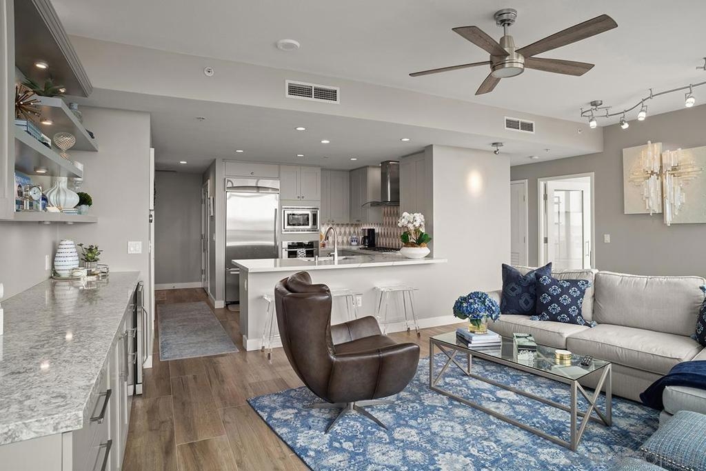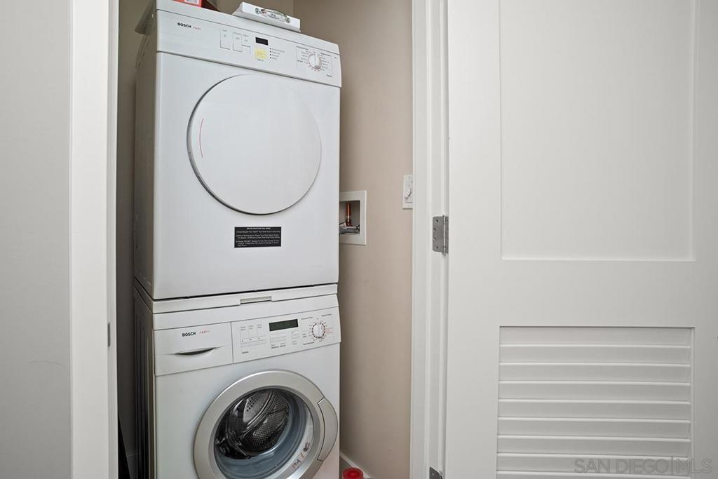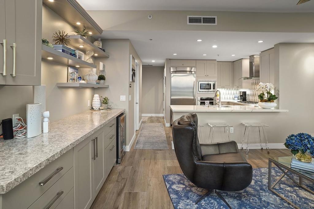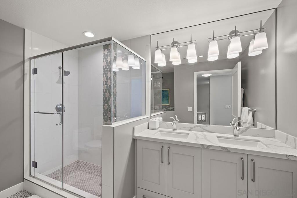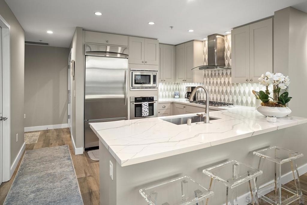 Elevated high above San Diego Bay, this exquisitely reimagined residence 2 bedroom + office/den offers breathtaking views of the vibrant cityscape and iconic waterfront. Thoughtfully and thoroughly remodeled, the home showcases elegant upgrades, including porcelain tile flooring, custom built-in cabinetry with quartz countertops, and a private balcony—perfect for enjoying San Diego's spectacular sunsets. The fully renovated kitchen is a culinary haven, equipped with premium Bosch stainless appliances, a Thermador refrigerator, quartz countertops, a custom tile backsplash, recessed lighting, and a breakfast bar for casual dining. The adjacent living area features custom built-ins offering ample storage, a wine chiller, motorized shades, and a ceiling fan for added comfort. The serene primary bedroom is adorned with designer wall treatments and includes a spacious walk-in closet with custom organization, blackout shades, and an ensuite bathroom featuring an oversized soaking tub, step-in shower, dual vanities, and quartz countertops. An additional generously sized bedroom, complete with dual closets and blackout shades, along with a versatile den/home office space, adds to the home's appeal. The unit also includes a dedicated storage space and two highly coveted side-by-side parking spaces. With its seamless blend of style and functionality, this home epitomizes refined urban living in the heart of San Diego. Offering a fabulous location in the coveted Columbia District, you will love being only a short walk to Waterfront Park, Seaport Village, The Headquarters, and the brand-new Rady’s Shell at Jacobs Park, a unique live music venue and home of the San Diego Symphony! Also enjoy proximity to the future life science and biotechnology research development The Research and Development District (The RaDD) at the Embarcadero and the sustainable tech-focused Horton Plaza Redevelopment in the center of the city. Electra has the unique distinction of being built around the historical 1928 SDG&E Station B. Residents can take advantage of an array of services including a concierge, top notch security, and guest parking spaces available by reservation through a simple mobile app. Luxuriate in a steam room, resort-style pool and spa, fitness center, and Electra Park on the 5th floor where you may seek respite from the hustle and bustle surrounded by lush landscaping and a romantic outdoor fireplace and top-of-the-line barbecues.