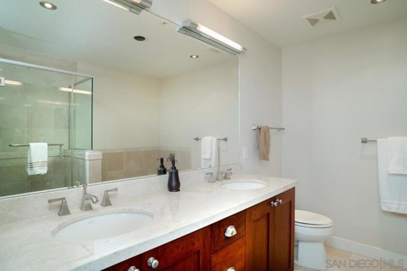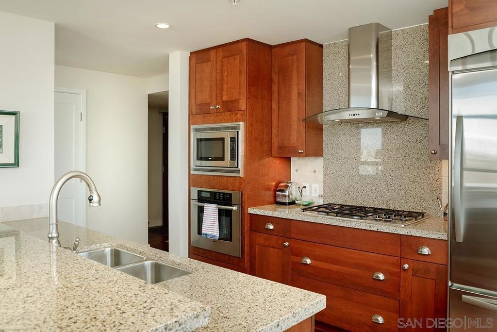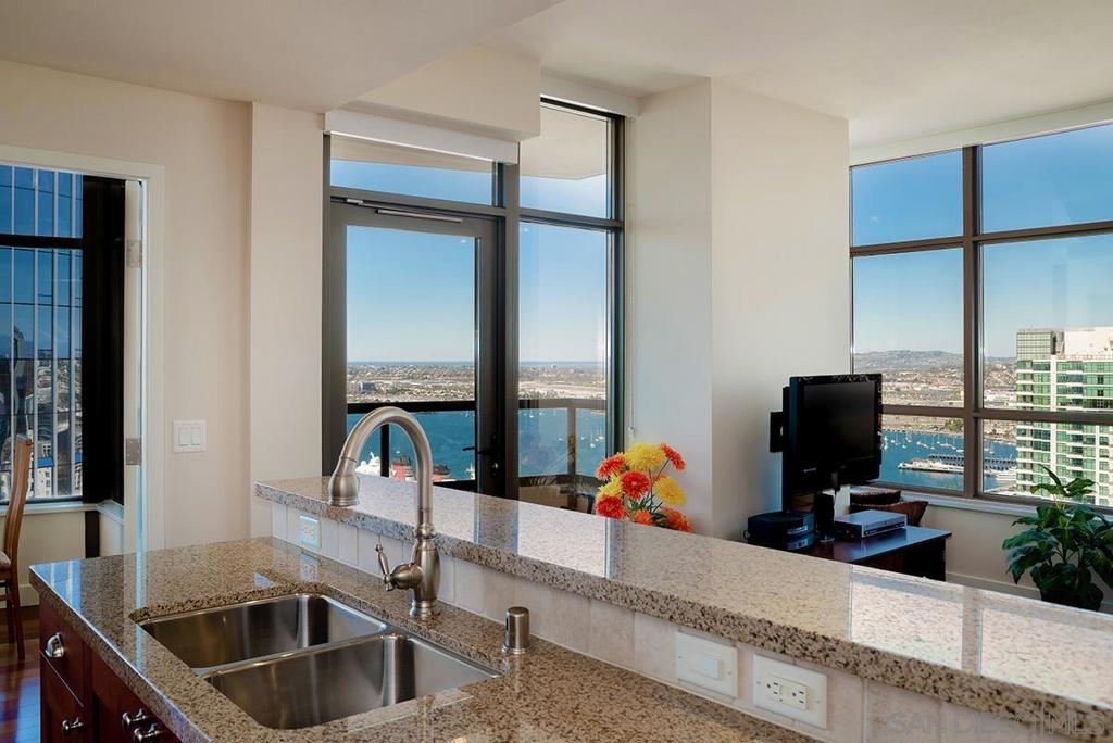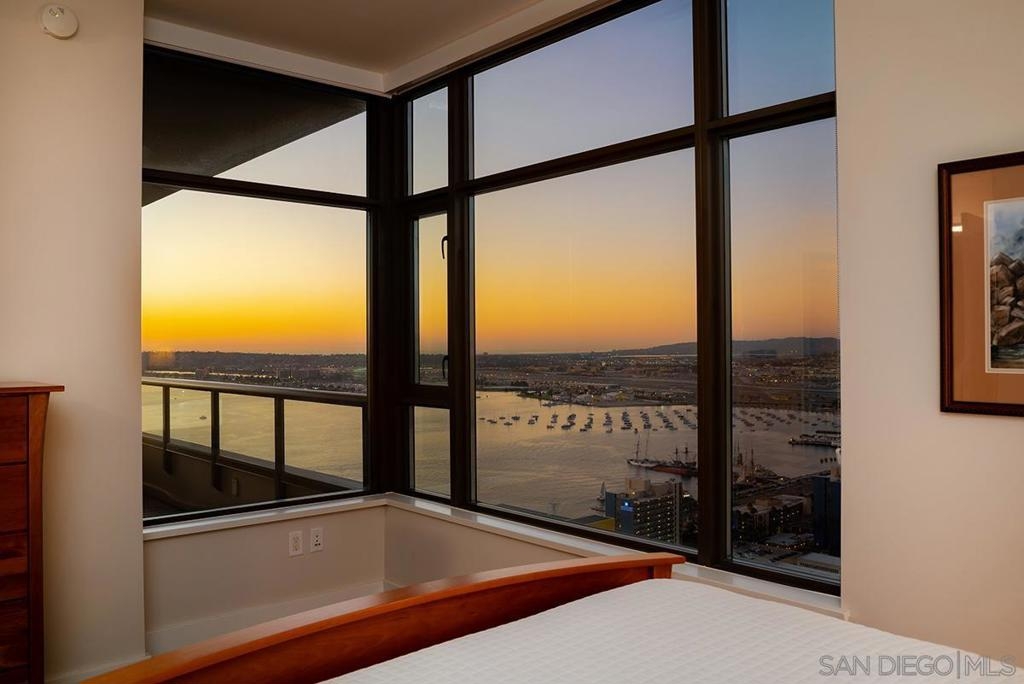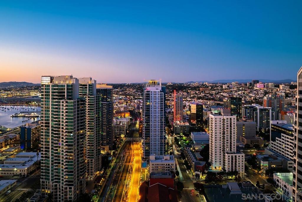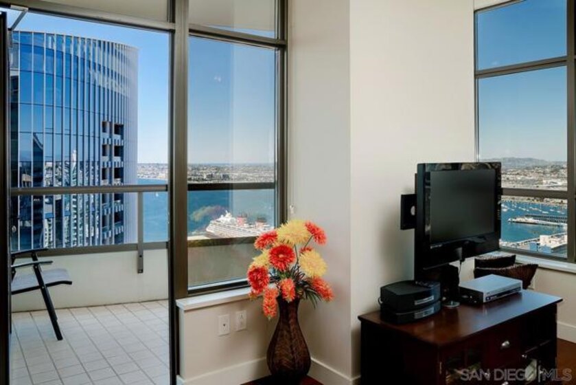SOARING ABOVE THE CITY! Revel in sprawling San Diego Bay and city views from this premium northwest corner residence on the 38th floor of Electra! This exceptional condo features luminous hardwood floors, expansive windows, ambient fireplace, and two balconies- including a west-facing one for those iconic sunset skies. The gourmet kitchen boasts stainless Bosch and Thermador appliances, granite surfaces, recessed lighting, and a convenient breakfast bar for casual dining. Wanting a little more formality? The adjacent den could easily serve as a dining room- the perfect spot for your “table with a view”. The spacious primary bedroom is complete with blue water views, an organized walk-in closet, and a plush ensuite bathroom with soaking tub, frameless shower, and dual vanity. With a roomy second bedroom overlooking Point Loma, two side-by-side parking spaces including an electric charging station, a storage unit, and all of Electra’s world-class amenities, this is the epitome of luxurious metropolitan living! Find luxury high-rise living unlike any other Downtown! With its 38th floor location, this home offers amazing views from every room and BOTH balconies! The incomparable views are only matched by this home’s high-end fixtures and thoughtful features, including radiant wood flooring and premium Thermador and Bosch stainless kitchen appliances. The huge primary bedroom is large enough to comfortably house a California King bed and boasts lovely views. The second bedroom is tailormade for a guest room or even that coveted home office. Complete with two side-by-side parking spaces, this is your chance at a truly elevated Downtown lifestyle! Offering a fabulous location in the coveted Columbia District, you will love being only a short walk to Waterfront Park, Seaport Village, The Headquarters, vibrant Little Italy, and much more! Electra has the unique distinction of being built around the historical 1928 SDG&E Station B. Residents enjoy an array of services and amenities including a concierge, steam room, resort-style pool and spa, fitness center, and Electra Park on the 5th floor where you may seek respite from the hustle and bustle surrounded by lush landscaping and a romantic outdoor fireplace and top-of-the-line barbecues. Electra is VA approved Complex Features: ,,,,,,,,,, Equipment: Dryer,Fire Sprinklers, Range/Oven, Washer Sewer: Sewer Connected Topography: LL