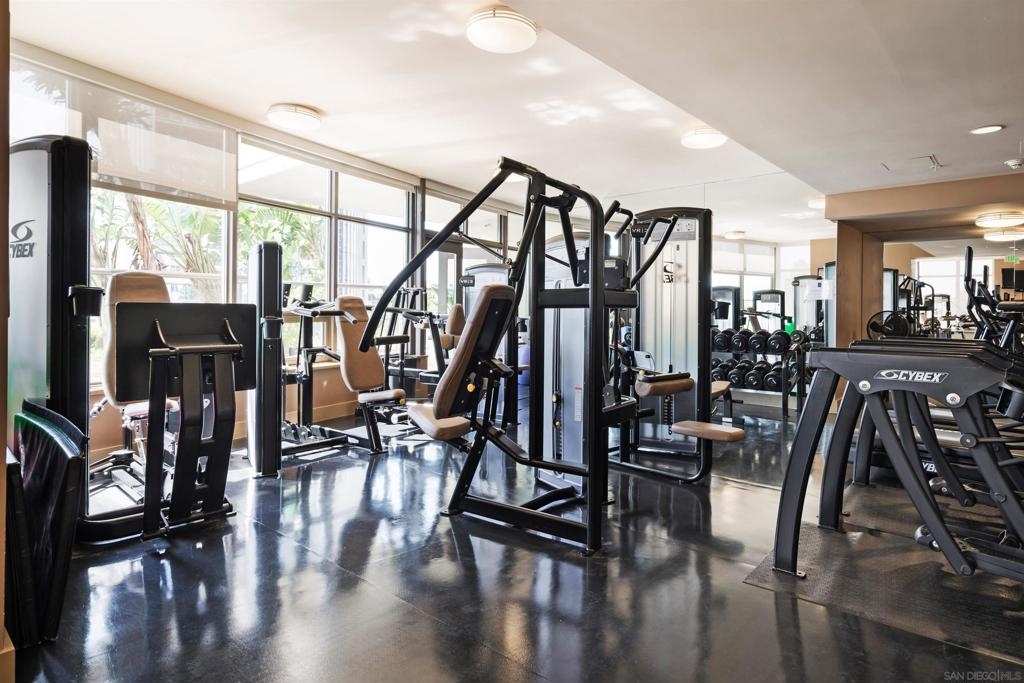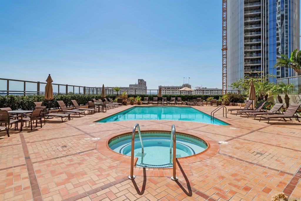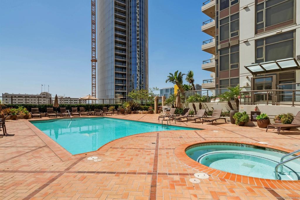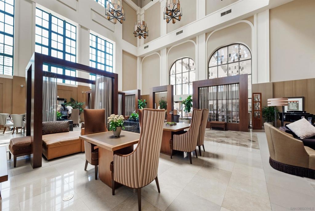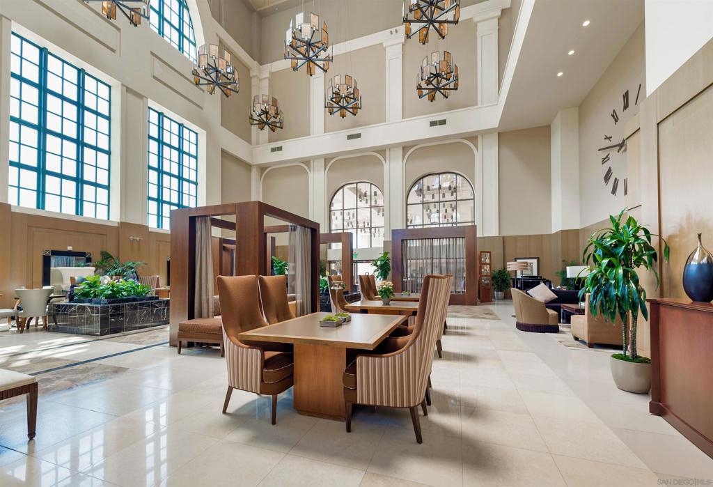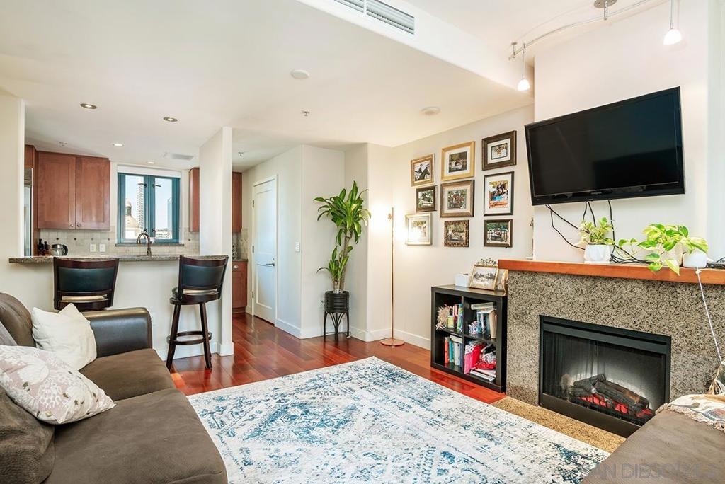Don't miss this beautiful townhome in the prestigious Electra building just 2 blocks from the bay. Fifth flr location near grass park, pool & BBQ. Interior finishes include gorgeous Brazilian cherrywood floors, kitchen with granite countertop, tile backsplash, modern cherrywood cabinets, stainless steel appliances. Electric fireplace in living room. Two TV's convey. Property features a private third floor rooftop terrace that is wonderful for entertaining. One car garage space #381 plus large storage space #111-both on 3rd floor. Top notch amenities include 24 hour concierge and... security, community room, pool, spa, fitness center, sauna, steam room , outdoor fireplace, barbeque and more.  Electra was originally the 1928 SDGE building and has been transformed into Art Deco style.  Enjoy the luxurious conservatory with an intricate glass dome ceiling, sophisticated furnishings, artwork and library.  Old MLS listing cited assessor’s record for 1057 sq ft but settled lawsuit now has assessor’s record showing 843 sq ft. Complex Features: ,,,,,, Equipment: Dryer, Washer Sewer: Sewer Connected Topography: LL