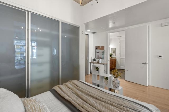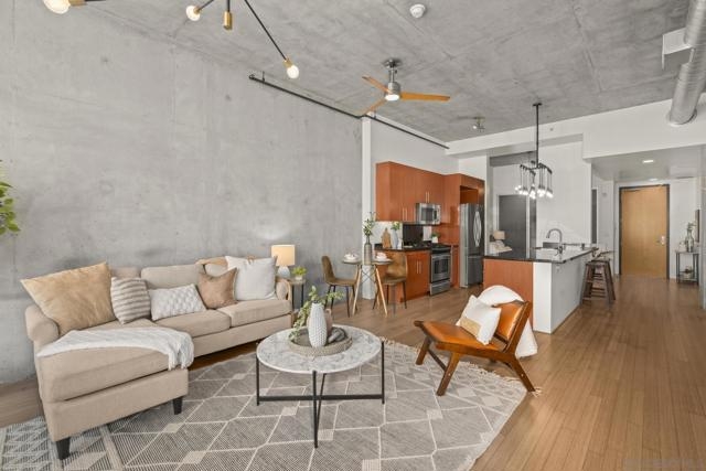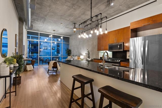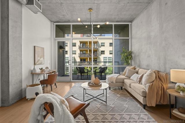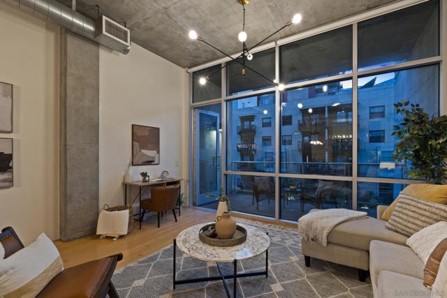 Step into the epitome of downtown living at Fahrenheit, where modern design meets San Diego's vibrant city pulse. This industrial-chic loft spans 726 sq. ft. with soaring concrete walls, sleek finishes, and floor-to-ceiling windows that flood the space with natural light. The open layout provides endless flexibility—whether you prefer a creative studio, stylish one-bed conversion, or entertainer's retreat. From your private balcony, enjoy a unique peek-a-boo view of Petco Park while overlooking the energy of East Village, placing you just steps from world-class dining, craft breweries, and the city's best nightlife. Beyond your front door, Fahrenheit offers residents exclusive amenities, including a secure lobby, underground gated parking, and dedicated secured parking area for bicycles. High-speed fiber internet is included with HOA services, ensuring seamless connectivity for work or play. Whether you're a sports fan walking to the game, a professional craving a lock-and-leave lifestyle, or a first-time buyer looking to own a piece of the city, this home delivers the perfect balance of style, convenience, and location. Live where the action is—Unit 407 invites you to experience East Village at its finest.
