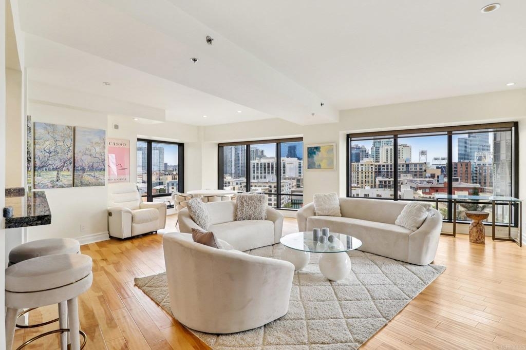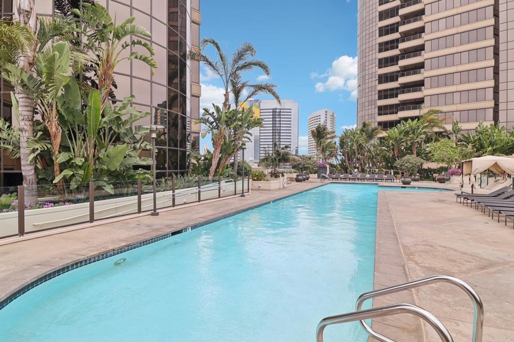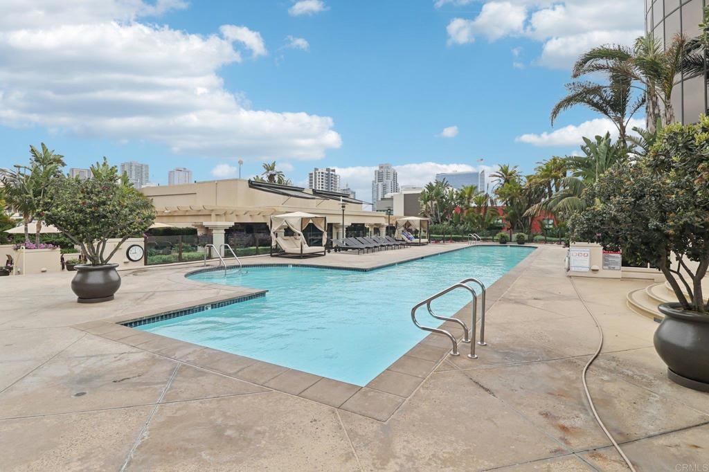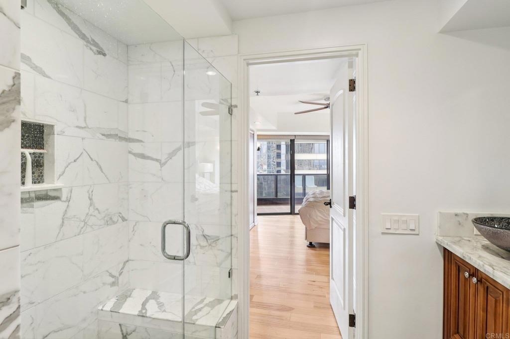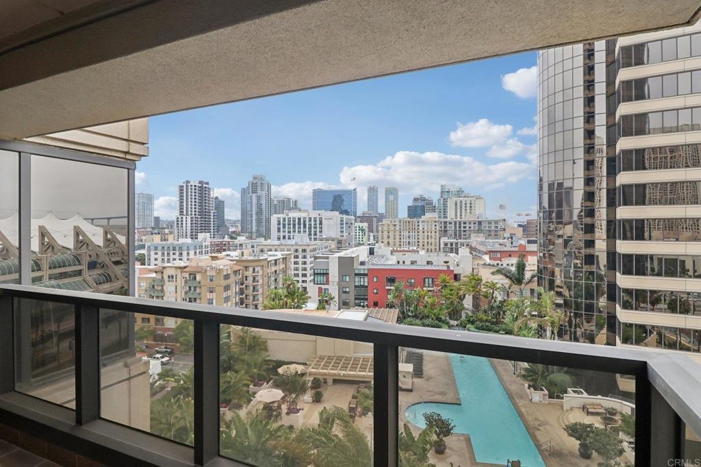 Remodeled 11th Floor Harbor Club Residence with Stunning Bay & City Views Beautifully upgraded residence in the prestigious Harbor Club, located on the 11th floor with spectacular views of San Diego Bay, Coronado Bridge, and the city skyline. This light-filled 1BR/1BA unit features hardwood flooring throughout, recessed lighting, and floor-to-ceiling windows with motorized roller shades. The modern kitchen has been fully remodeled with GE stainless steel appliances, Amazonite countertops, and a breakfast bar. The updated bathroom includes a frameless glass shower with marble wall surround and dual vessel sinks. The spacious primary bedroom offers custom built-in cabinetry, an entertainment center, and direct access to the southeast-facing private balcony. In-unit stackable washer/dryer included. Harbor Club offers luxury amenities including 24-hour front desk/security, a fully equipped fitness center, a beautifully landscaped pool deck with 95-foot lap pool and spa, club room, business center, and more. Prime Marina District location with walkability to Petco Park, Gaslamp Quarter, Embarcadero, dining, shopping, and public transportation.