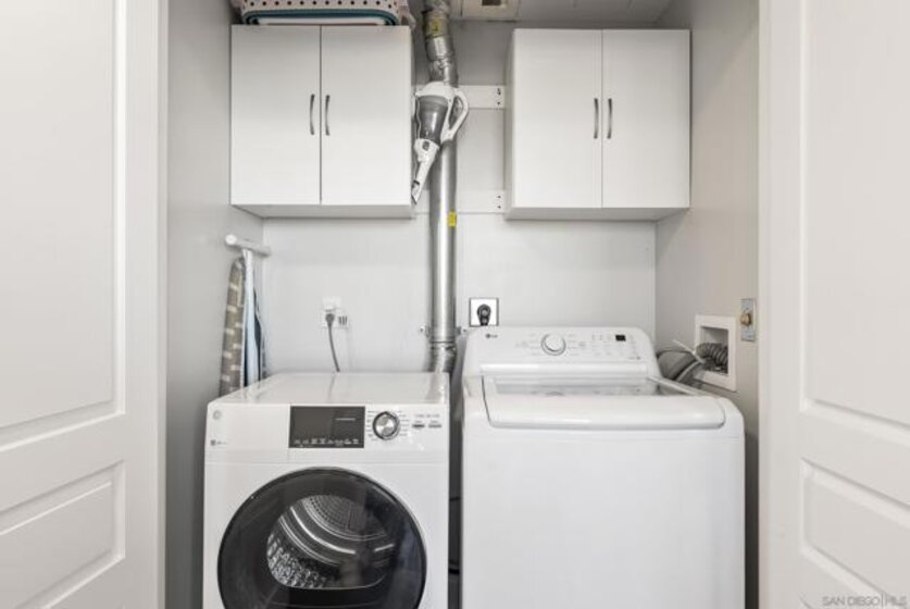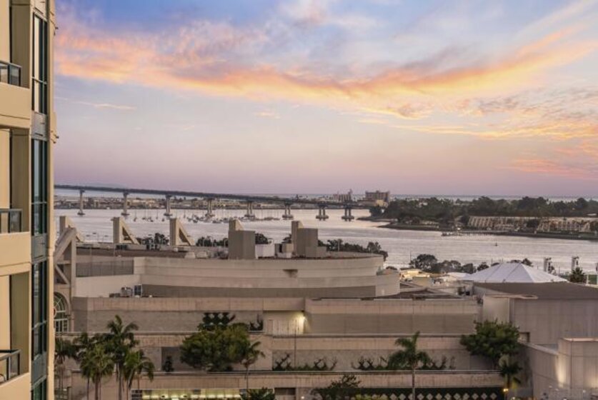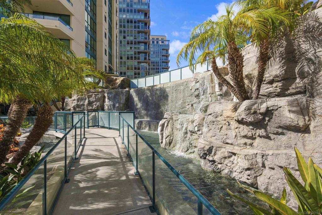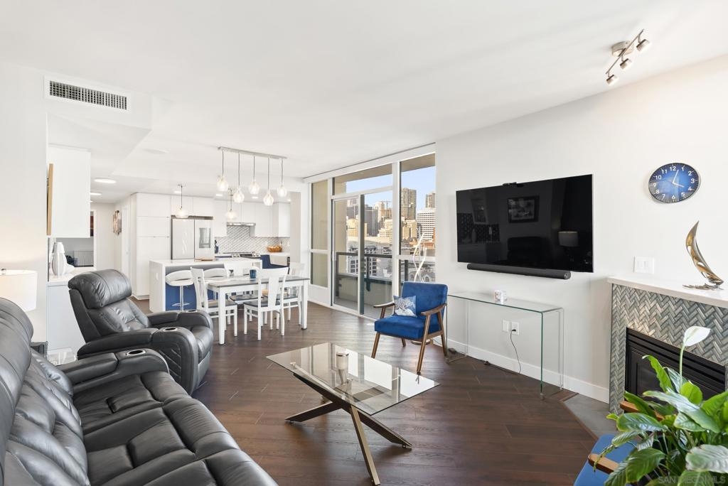 Beautifully remodeled Marina District residence showcasing sweeping bay and city views. This spacious 2-bedroom, 2-bath home offers two private patios and two parking spaces, each equipped with its own EV charger. Over $200,000 in high-end upgrades completed in 2023 include custom cabinetry with enhanced storage, continuous flooring throughout, updated lighting and plumbing fixtures, and premium appliances. The modern kitchen features luxury tile finishes, quartz countertops, a large pantry, an Alexa-enabled refrigerator, and a smart oven. Additional highlights include a custom walk-in closet, fireplace, blackout shades, and Wi-Fi/Bluetooth color-changing ceiling lights controlled via SmartLife or SmartThings. Ideally located in the heart of the Marina District, Horizons offers easy access to Petco Park, the Gaslamp Quarter, San Diego Bay, the Marina, shopping, dining, and entertainment. Community amenities include a pool, spa, BBQ area, fitness center, conference room, club room, and 16 guest parking spaces. This residence includes two separate parking spots and a storage unit. Horizons has recently been refreshed with beautifully remodeled lobbies, upgraded hallways, and new unit doors with convenient keypad access.