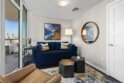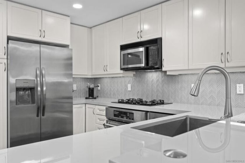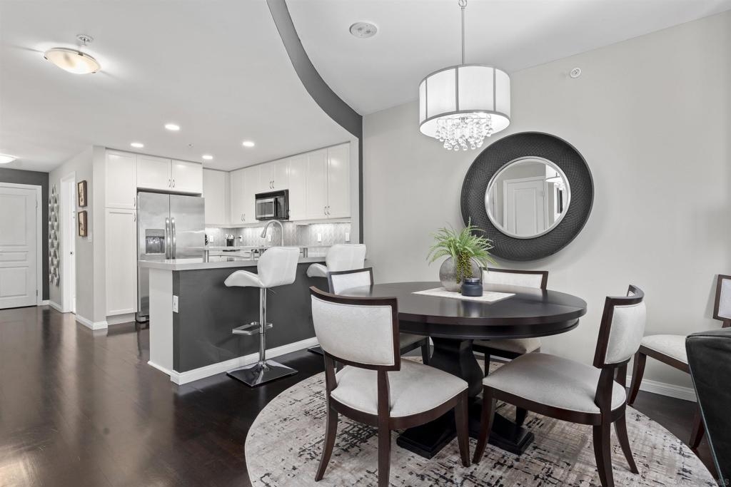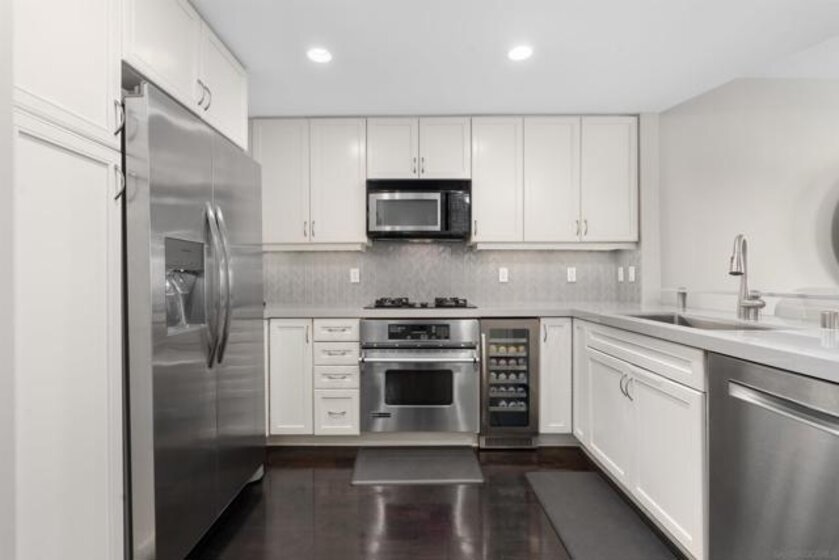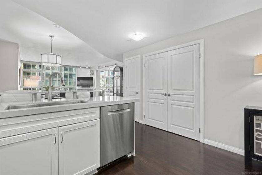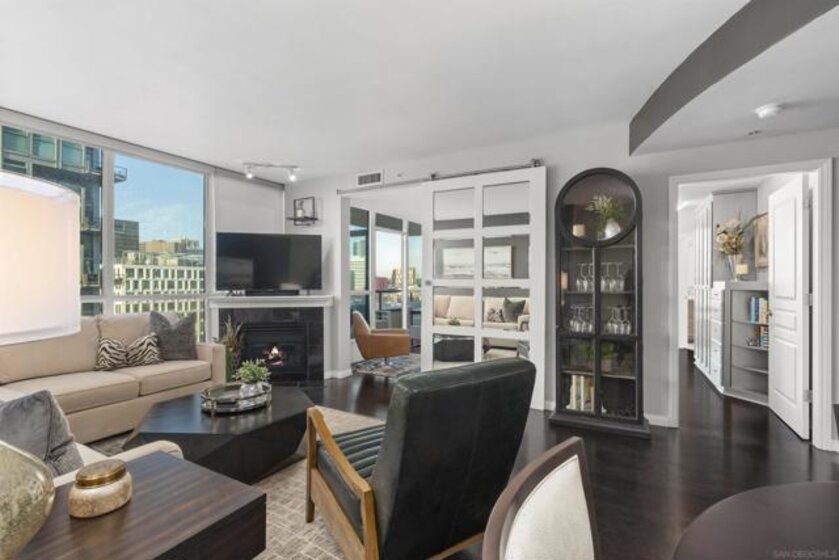 This beautiful, professionally designed one-bedroom plus Den, two-bath condo offers luxury, comfort, and stunning north-facing views of San Diego Bay and Downtown city skyline. Natural light fills the open living and dining areas, with large windows and a spacious patio to take in the scenery. The primary suite features floor-to-ceiling windows, generous closet space, built-ins, a workspace, patio access, and an ensuite bath with dual sinks and a walk-in shower. A versatile den off the living room - with direct patio access - functions as a cozy lounge by day and a guest bedroom with a queen sleeper sofa by night. Furnishings to be included in the purchase price at no additional cost to Buyer. Original cost of furnishings was approximately $30,000, with the majority sourced from Arhaus, Pottery Barn, and Crate & Barrel. All included items to be conveyed in their current condition at close of escrow. Ideally located in the heart of the Marina District, Horizons offers an unbeatable downtown lifestyle just steps from the New Children’s Museum, Martin Luther King Jr. Promenade, Seaport Village, Petco Park, the Gaslamp Quarter, San Diego Bay, and the Marina. A children’s park and dog park are located directly behind the community. Resort-style amenities include a pool, spa, BBQ area, fitness center, concierge, security, billiard room, conference and club rooms, and 16 guest parking spaces. Everyday convenience is built in with retailers just an elevator ride away, including a bank, dry cleaner, Postal Annex, coffee shop, and more. The building has been refreshed with beautifully remodeled lobbies, upgraded hallways, and new unit doors with keypad access, all within walking distance to transit, dining, shopping, and Ralphs Signature Market.