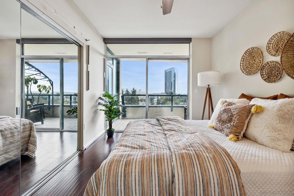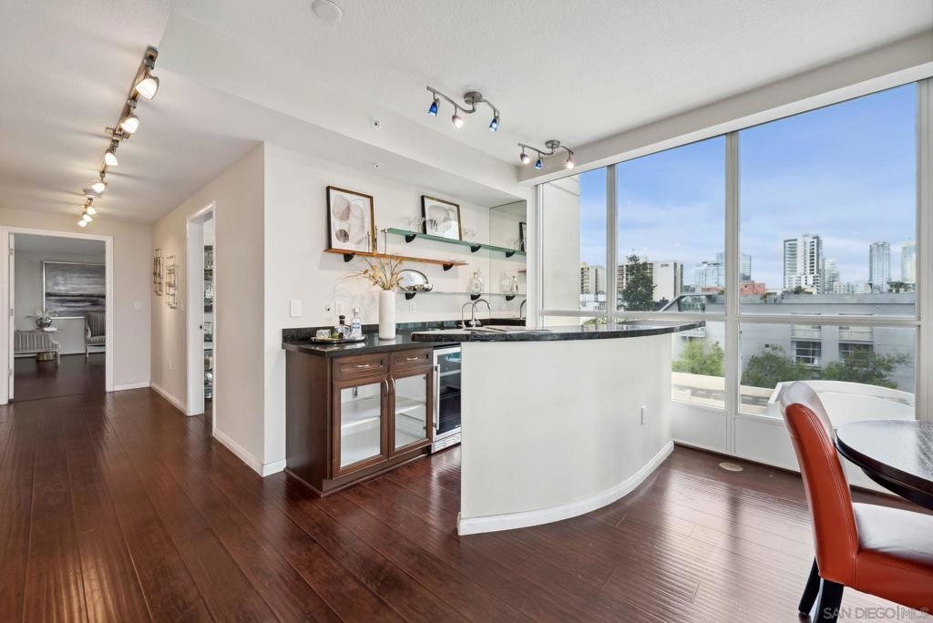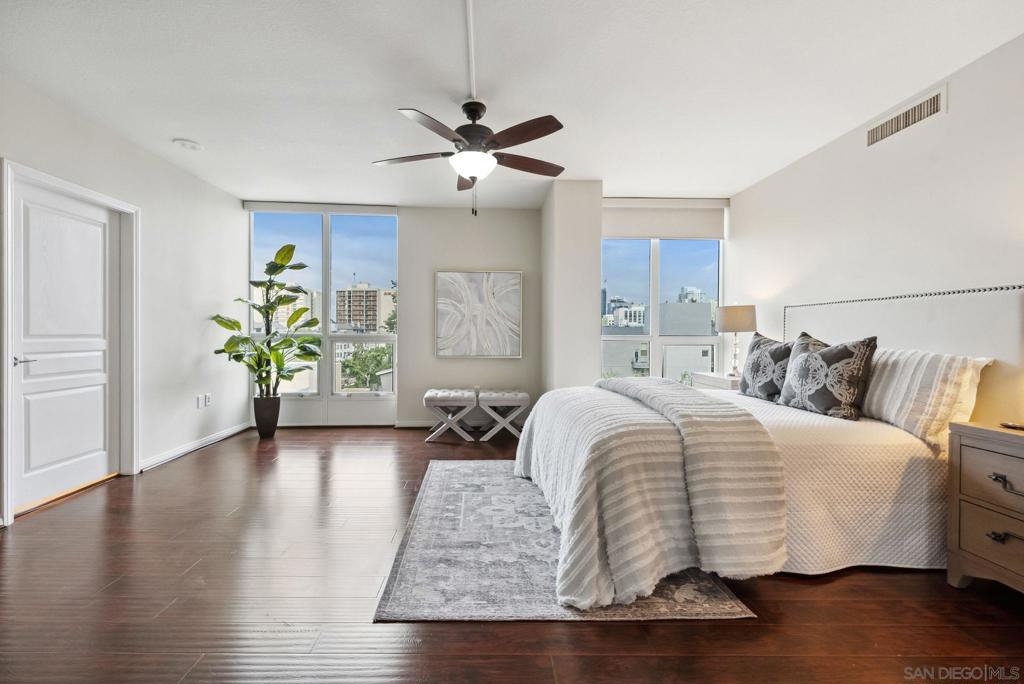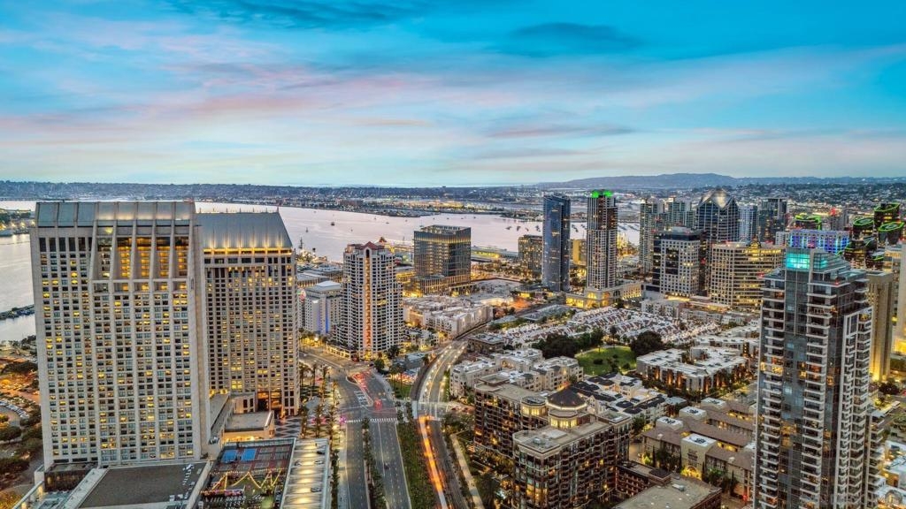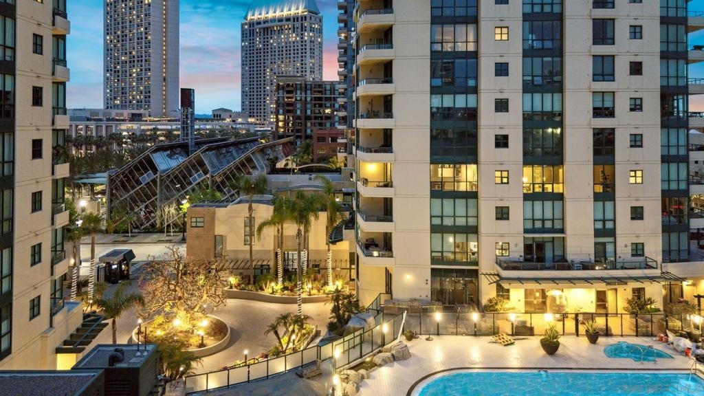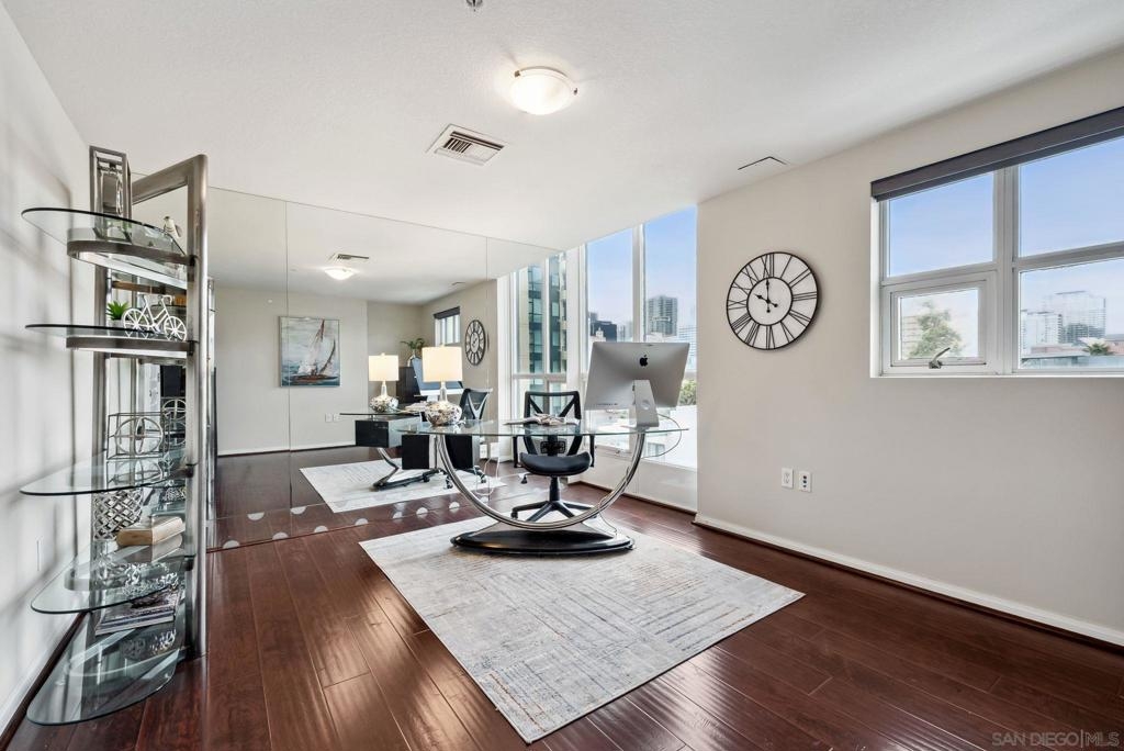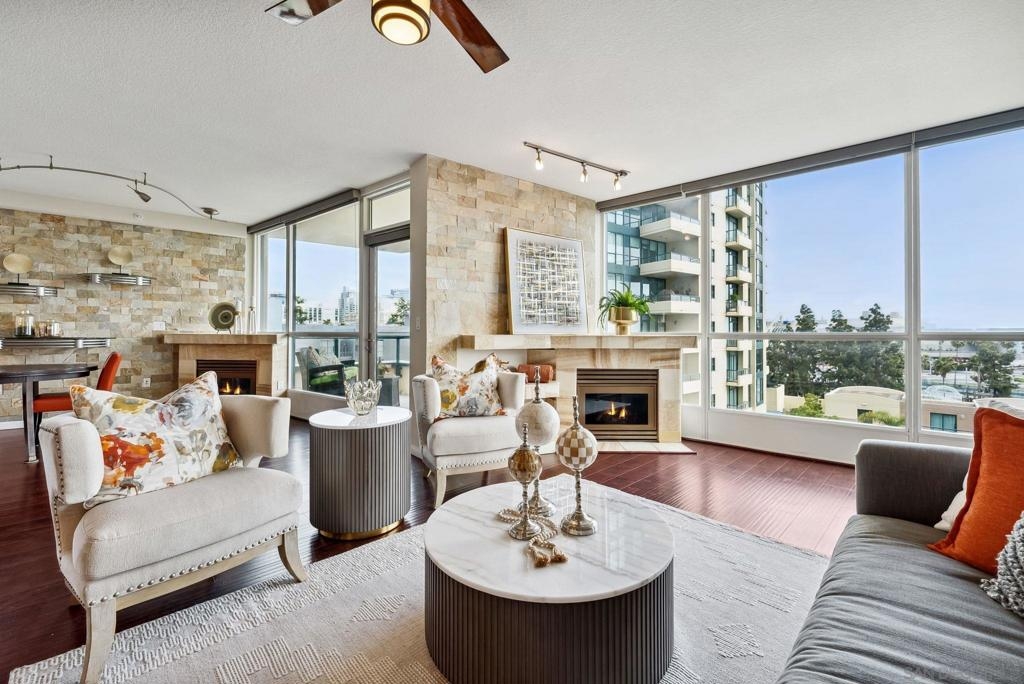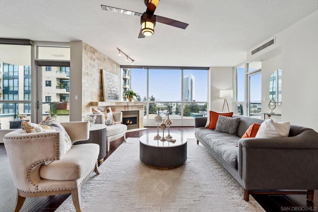 Welcome to luxurious downtown living in the iconic Horizons North Tower by BOSA. This expansive two-units combined residence offers over 2,300 sqft of sophisticated style and comfort in the heart of San Diego’s Marina District. Enjoy an open floorplan with floor-to-ceiling windows, two gas fireplaces, and two private balconies showcasing stunning city and bay views. The gourmet kitchen features upgraded appliances, a five-burner gas stove, and a walk-in pantry with a second refrigerator. Entertain with ease at the wet bar with a brand-new wine fridge. The layout includes two spacious primary suites with en-suite bathrooms, guest suite, plus a dedicated office and walk-in laundry room with storage. Custom Elfa and California Closets add function and elegance throughout. This rare offering includes four deeded parking spaces—two oversized, two near the elevators—one with an EV charger, two motorcycle spaces, and a double-sized storage unit. Horizons offers resort-style amenities: pool, spa, sauna, fitness center, entertainment lounge, BBQ area, 24-hour security, concierge, bike storage, and on-site HOA management. Impeccably maintained, just steps to Gaslamp, Seaport Village, Petco Park, and the Embarcadero—this is true luxury city living.