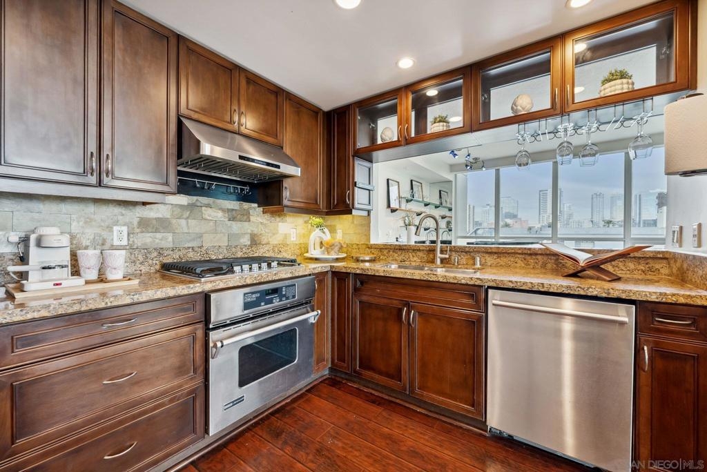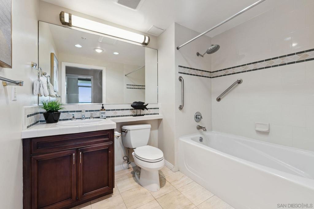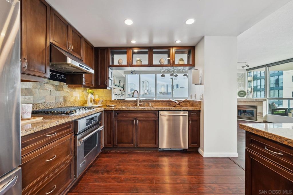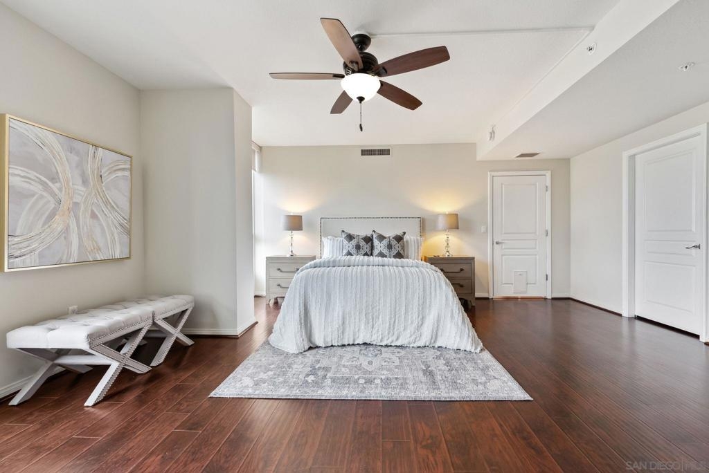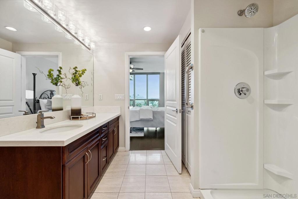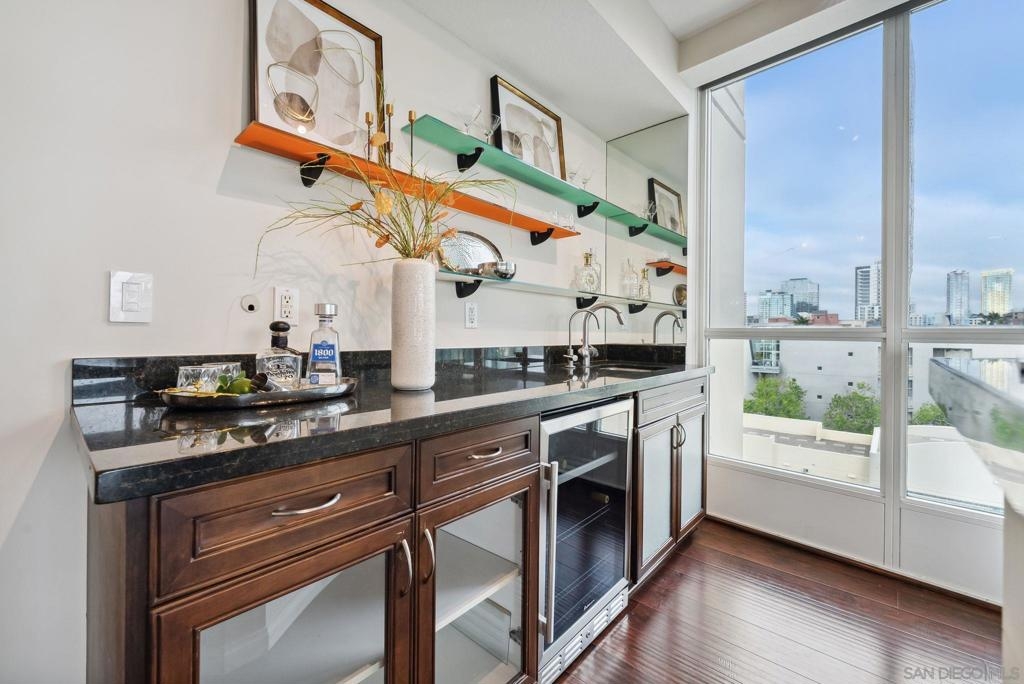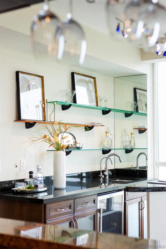 Welcome to luxurious downtown living in the iconic Horizons North Tower by BOSA. This expansive two-units combined residence offers over 2,300 sqft of sophisticated style and comfort in the heart of San Diego’s Marina District. Enjoy an open floorplan with floor-to-ceiling windows, two gas fireplaces, and two private balconies showcasing stunning city and bay views. The gourmet kitchen features upgraded appliances, a five-burner gas stove, and a walk-in pantry with a second refrigerator. Entertain with ease at the wet bar with a brand-new wine fridge. The layout includes two spacious primary suites with en-suite bathrooms, guest suite, plus a dedicated office and walk-in laundry room with storage. Custom Elfa and California Closets add function and elegance throughout. This rare offering includes four deeded parking spaces—two oversized, two near the elevators—one with an EV charger, two motorcycle spaces, and a double-sized storage unit. Horizons offers resort-style amenities: pool, spa, sauna, fitness center, entertainment lounge, BBQ area, 24-hour security, concierge, bike storage, and on-site HOA management. Impeccably maintained, just steps to Gaslamp, Seaport Village, Petco Park, and the Embarcadero—this is true luxury city living.