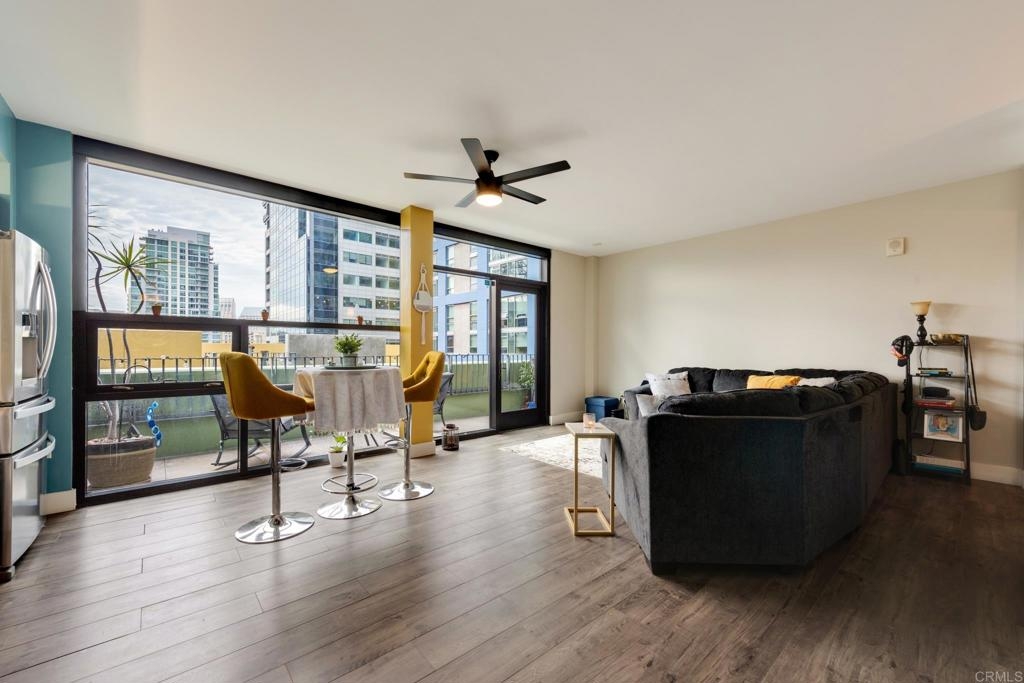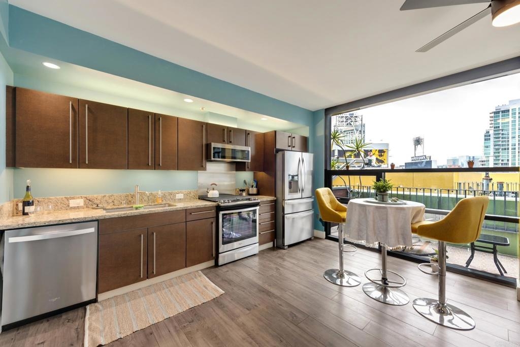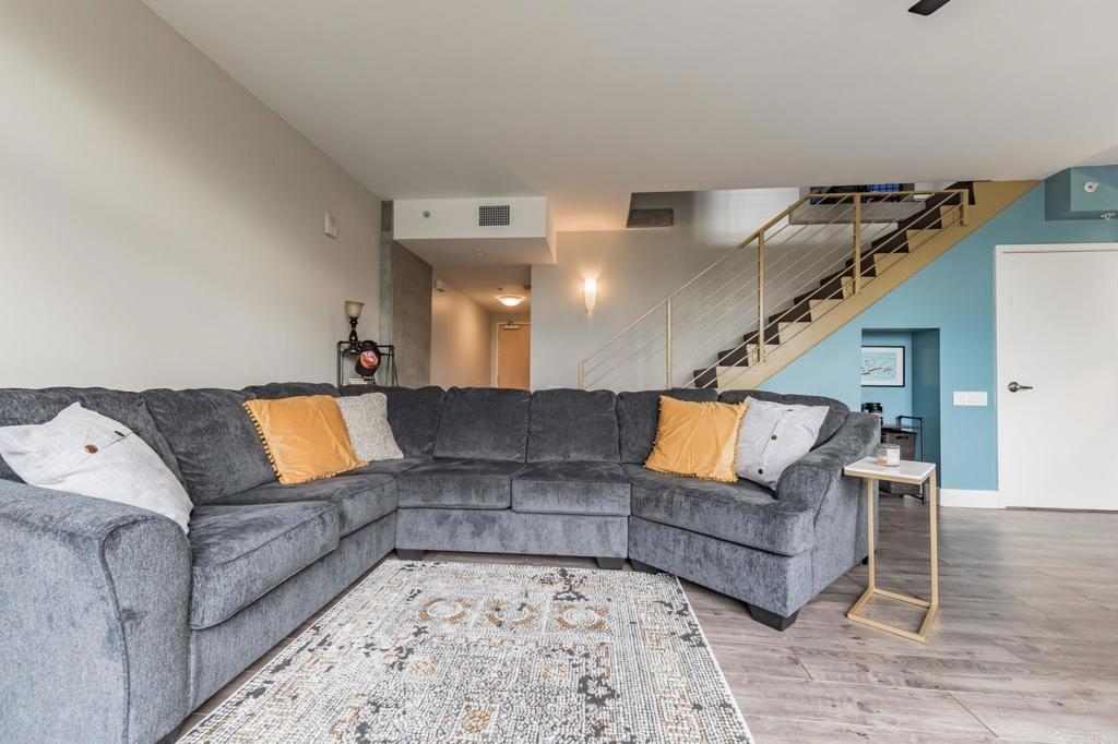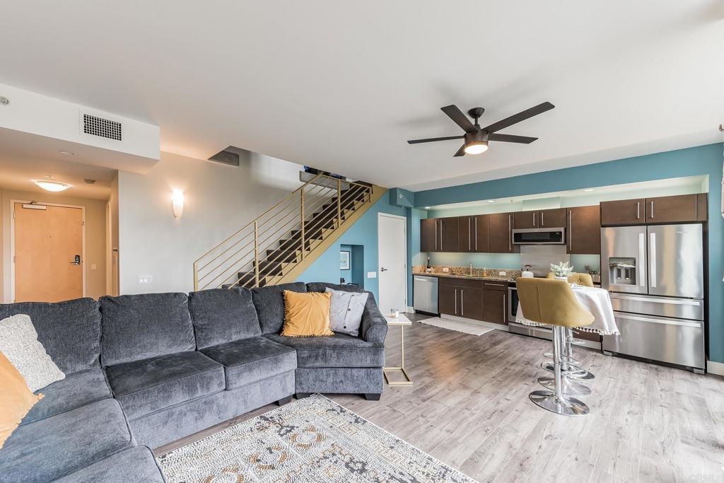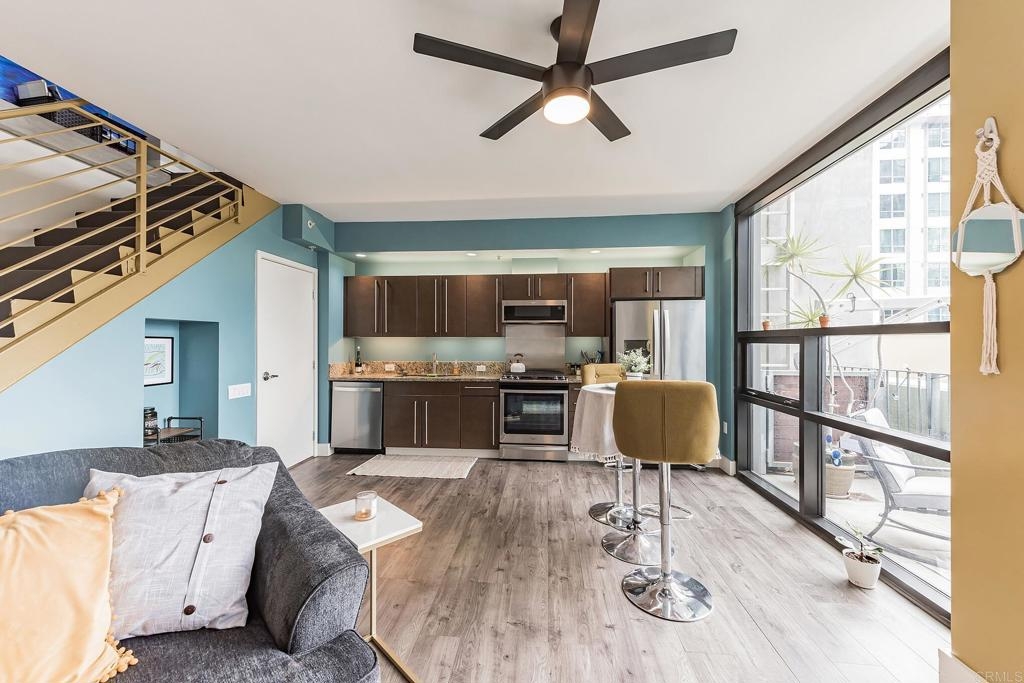 Modern 2 Story ICON Beauty Remodeled & Upgraded.High Ceilings on Both Floors,Fresh Paint,Laminate Flooring,Concrete Staircase,Granite Kitchen w/ all new appliances .Large Balcony,View of Petco Park From Both Levels.Very Open Floorplan w/Tons of Natural Light.1/2 Bath Downstairs, While Upstairs Boasts a Huge Open Space with Limitless Possibilities, Full Bath w/Dual Sinks Along with Washer & Dryer and 2 Closets. ICON Features Famed Rooftop Lounge, with BBQ's,Big Screen TV,Stadium Style Seating w/AmazingViews of The Coranado Bridge,Petco Park, & Downtown.Complex Also Features A Movie Theatre and Community Lounge.Unit includes One Assigned Parking Space. This is a Very Unique Unit, One to Not be Missed. Equipment: Dryer, Washer