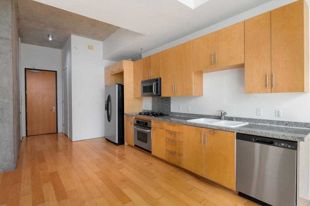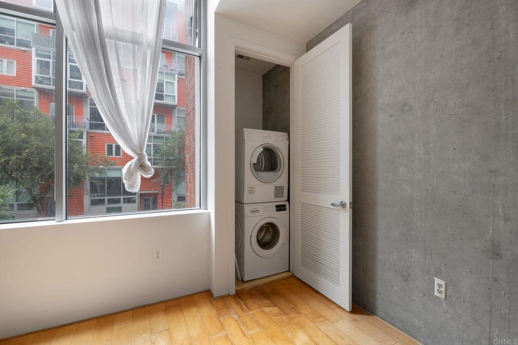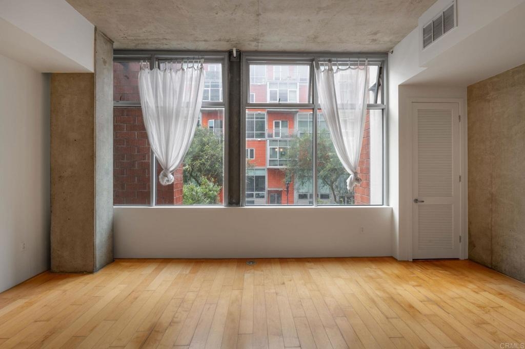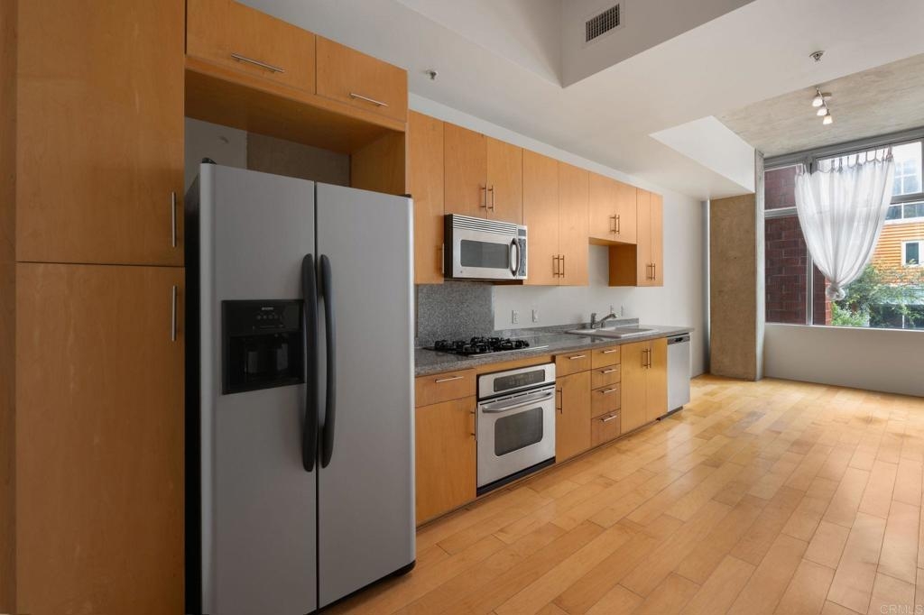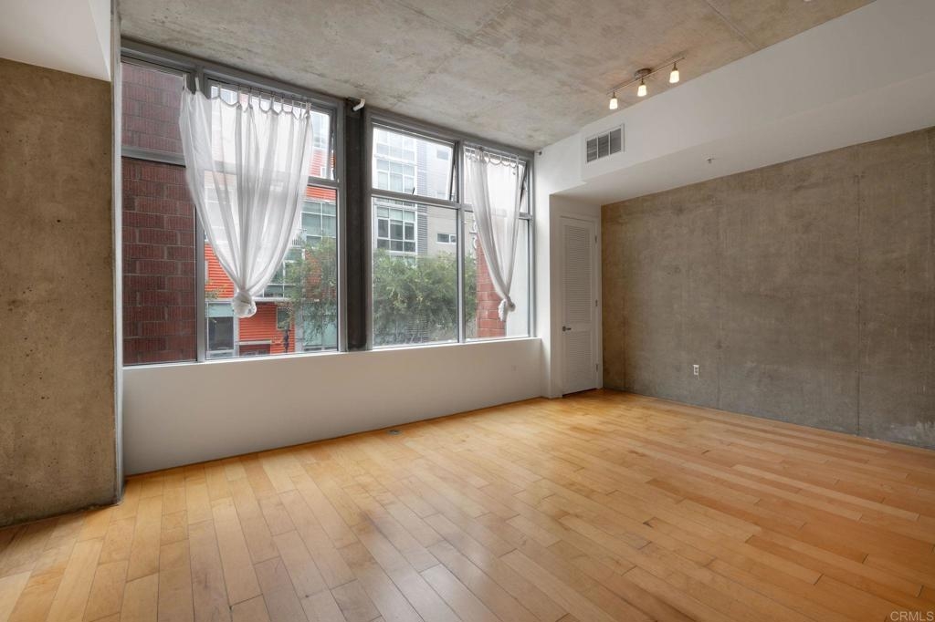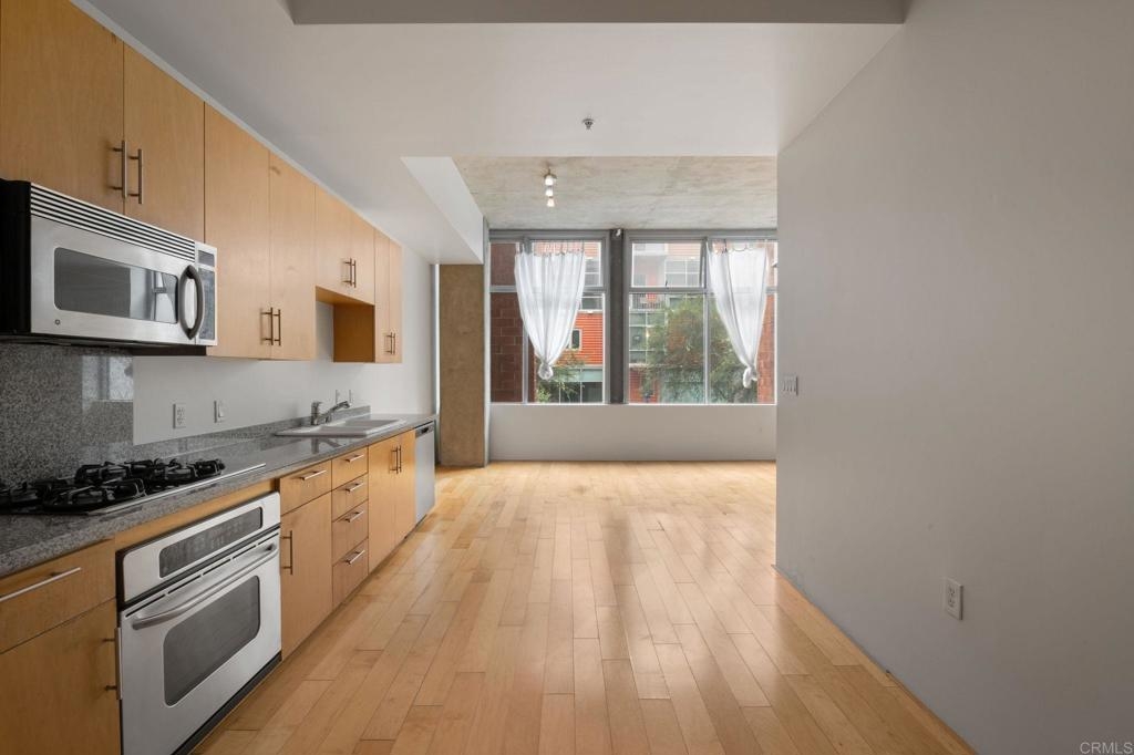 Exceptional Studio Living in East Village - This gem offers a wonderful floor plan with hardwood floors and raised 11-foot ceilings, creating a spacious and inviting atmosphere. The functional layout sets the bedroom area off to the side of the kitchen/living area, providing both privacy and convenience. Located just one block from Petco Park and the 'Park at the Park', this prime location offers easy walking access to the vibrant Gaslamp District, fine dining, and entertainment. The unit features central air-conditioning, a spacious walk-in closet, laundry facilities, and tall windows facing south for abundant natural light. The building amenities include a rooftop deck, fitness center, secure parking, and convenient trolley access just blocks away. With reduced pricing, this is a great value for a desirable section of downtown living. Don't miss out on this opportunity to own a piece of the dynamic East Village lifestyle!