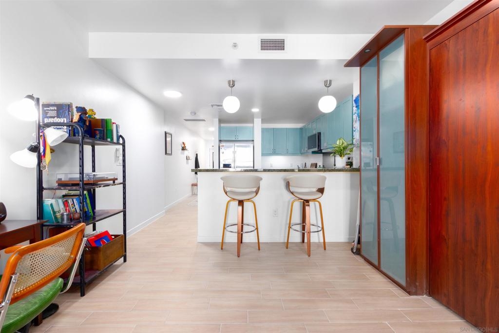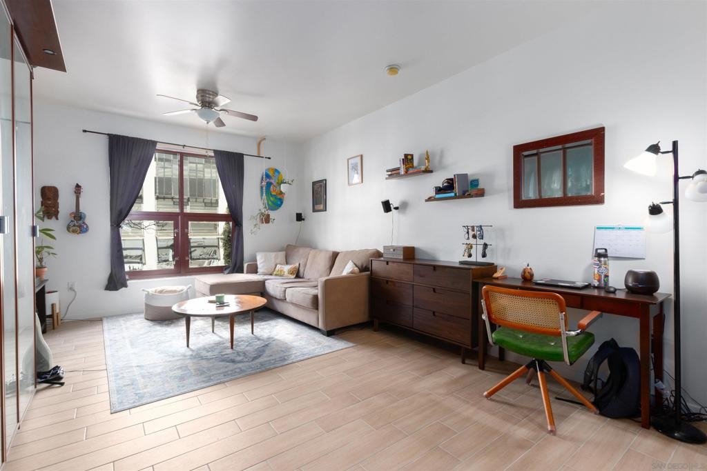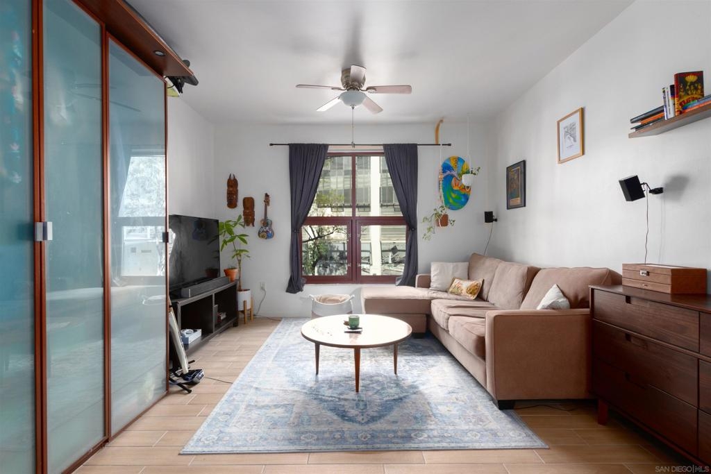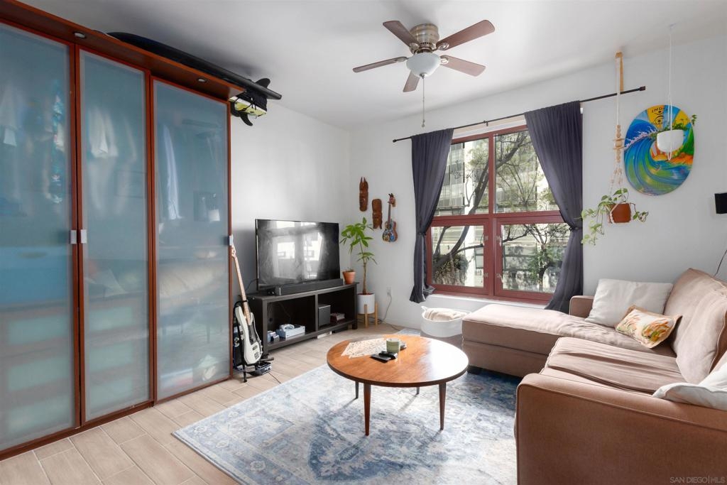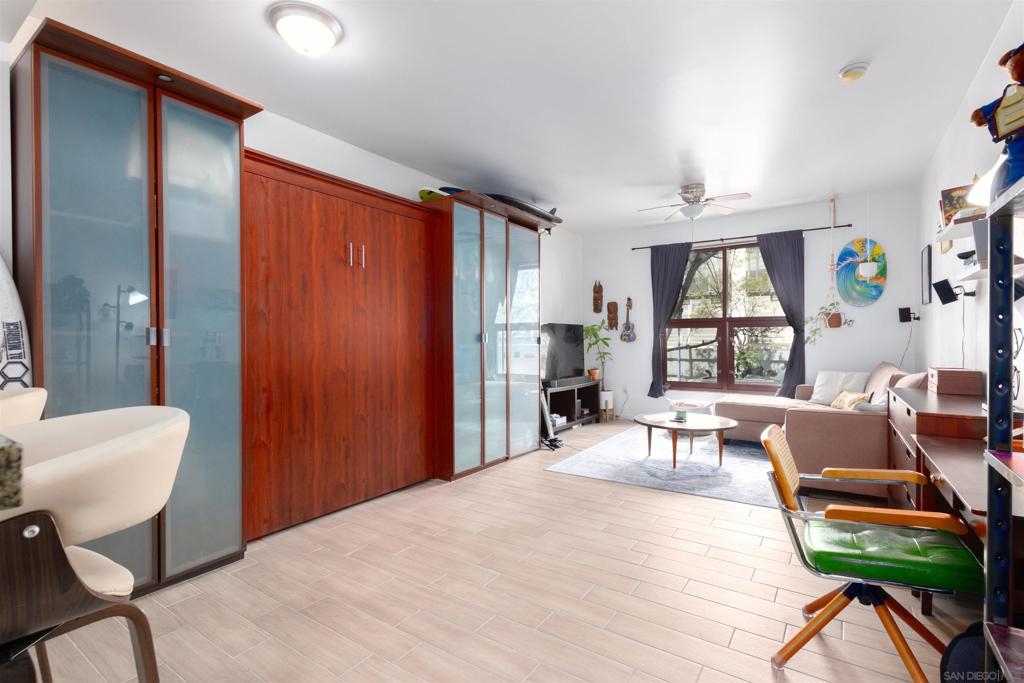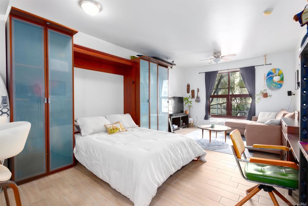 CONTINGENT BUT AVAILABLE TO SHOW! Check out this spacious studio in the heart of East Village, only 2 blocks to Petco Park! This is one of the largest studios in the complex and includes in-unit laundry, 1 dedicated parking space, a/c, second floor location, queen Murphy bed and a generous sized/ well appointed kitchen. Priced to sell and potential of VA loan assumption(2.25%) this won't last!
