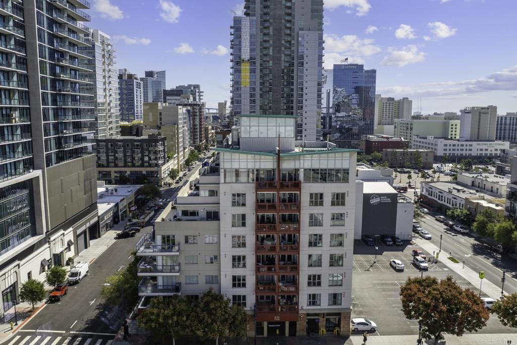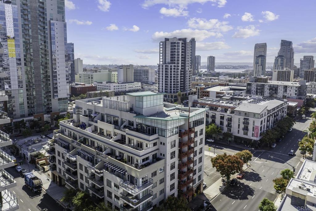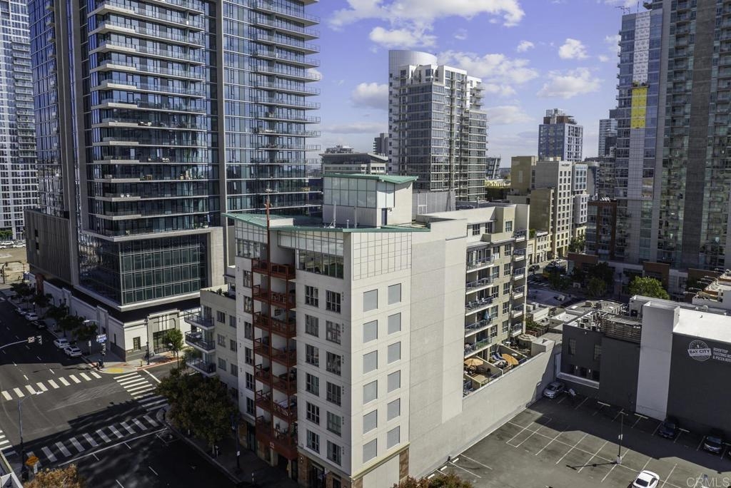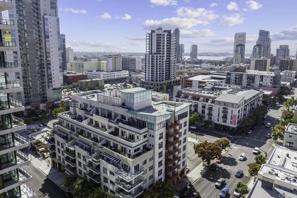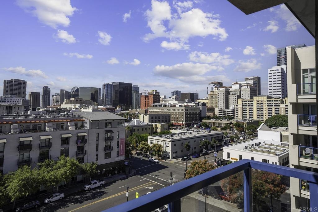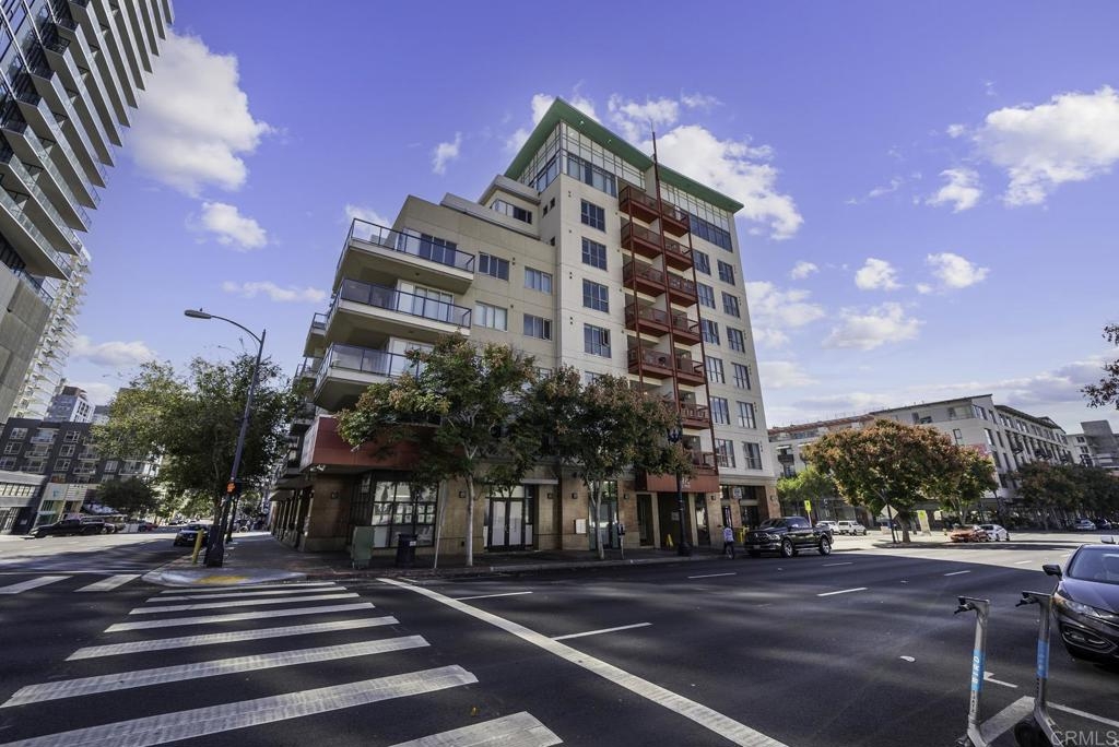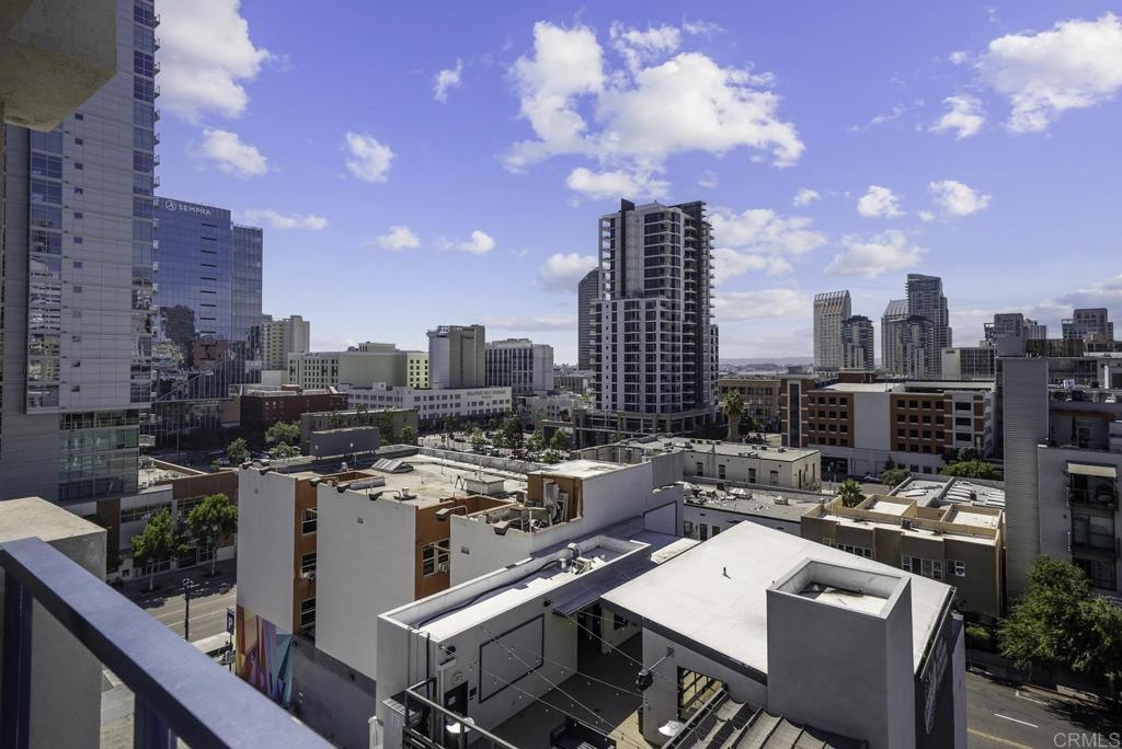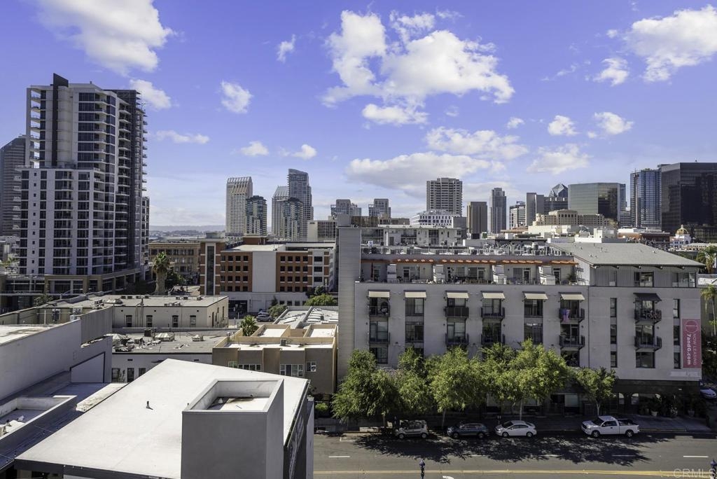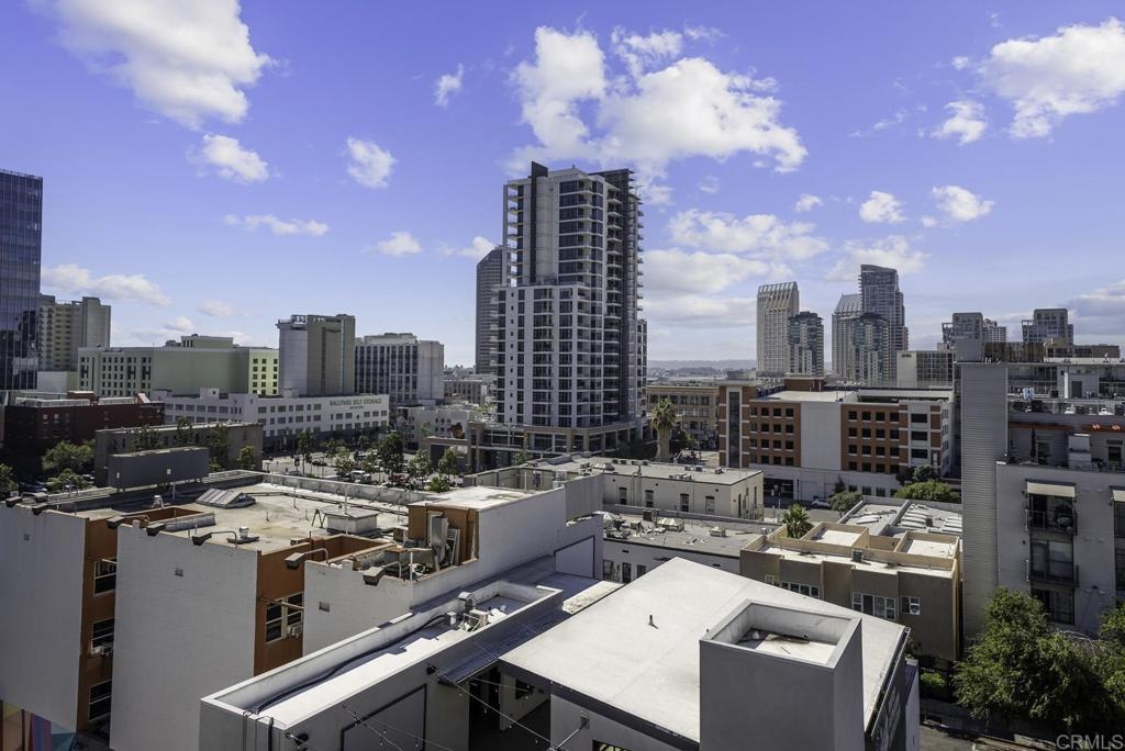 Introducing a breathtaking 7th-floor corner unit with stunning westward views of the downtown skyline and bay. Immerse yourself in the urban lifestyle, savoring the incredible cityscape and sunset vistas from your very own private balcony. This spacious studio boasts a distinct bedroom nook, complete with elegant kitchen cabinetry, stainless steel appliances, quartz countertops, and updated flooring. You'll also find the convenience of an in-unit washer and dryer. In addition, this unit offers a premium parking space on the first level and a separate storage locker. The location is simply ideal, just moments away from Petco Park, the vibrant Gaslamp District, and an array of fantastic restaurants and shops. Building amenities include a welcoming lobby, a fully equipped fitness room, a secure area for bike storage, one designated parking space in the gated underground lot, and a rooftop patio with a communal barbecue. This opportunity is not to be missed.