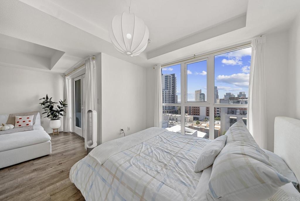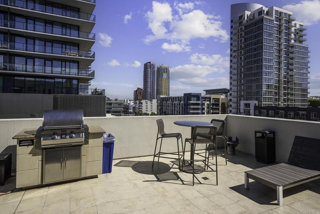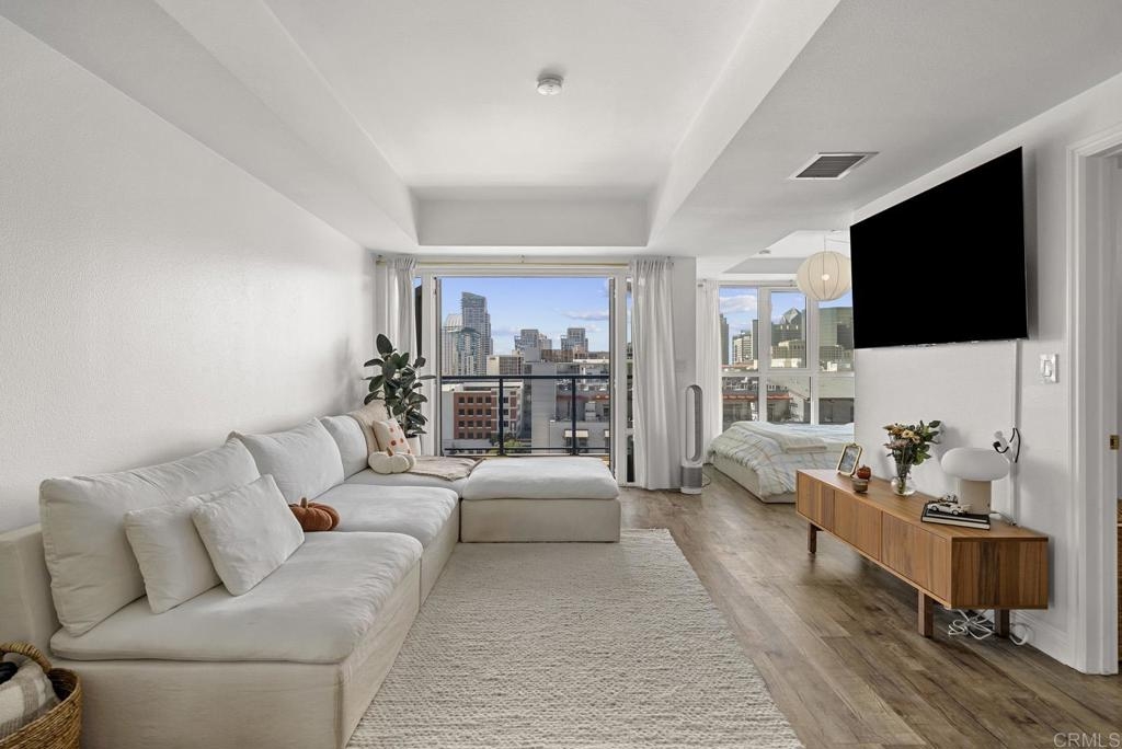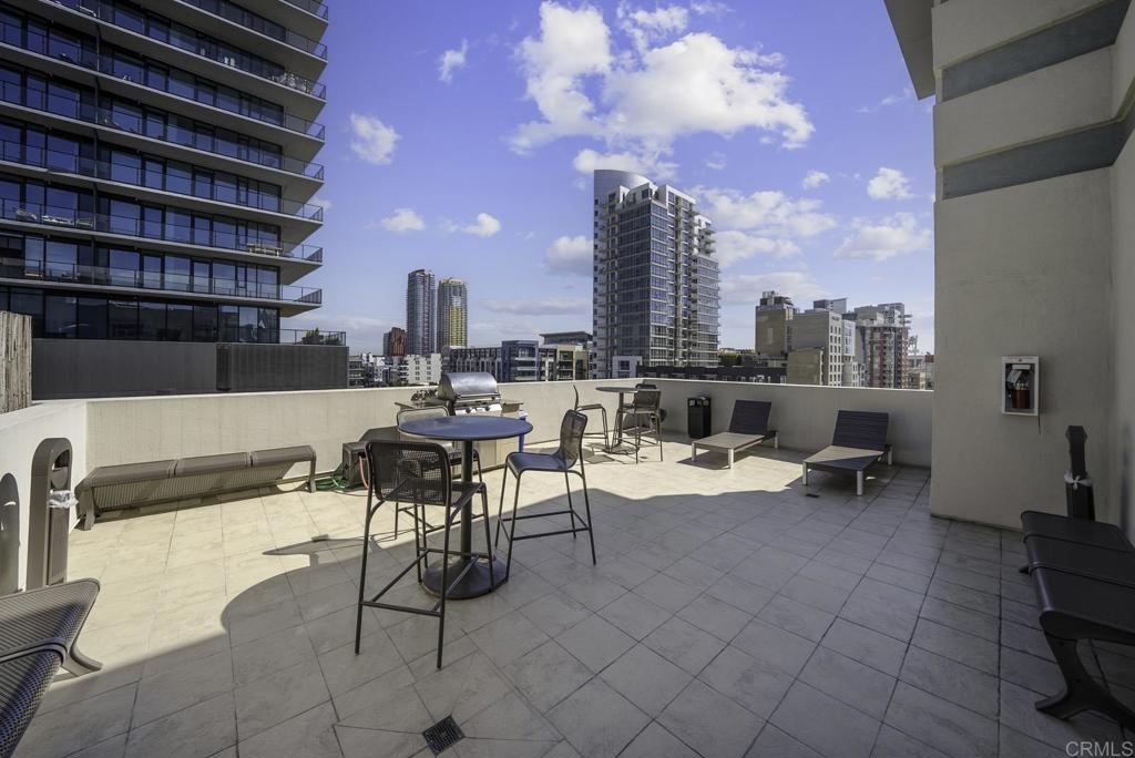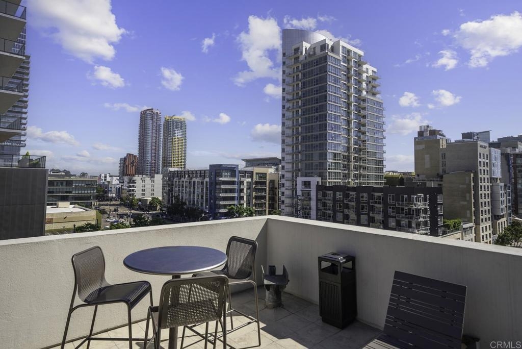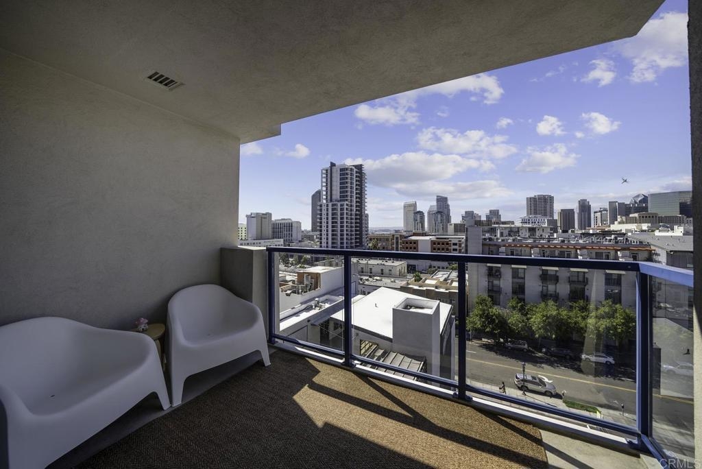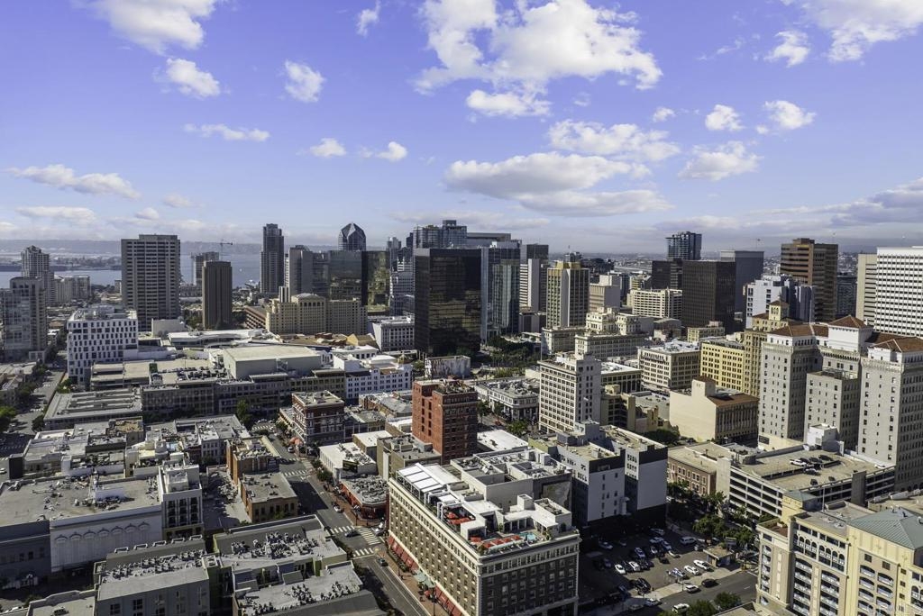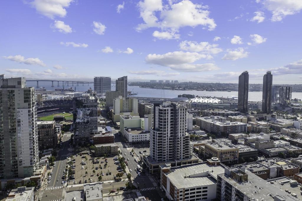 Introducing a breathtaking 7th-floor corner unit with stunning westward views of the downtown skyline and bay. Immerse yourself in the urban lifestyle, savoring the incredible cityscape and sunset vistas from your very own private balcony. This spacious studio boasts a distinct bedroom nook, complete with elegant kitchen cabinetry, stainless steel appliances, quartz countertops, and updated flooring. You'll also find the convenience of an in-unit washer and dryer. In addition, this unit offers a premium parking space on the first level and a separate storage locker. The location is simply ideal, just moments away from Petco Park, the vibrant Gaslamp District, and an array of fantastic restaurants and shops. Building amenities include a welcoming lobby, a fully equipped fitness room, a secure area for bike storage, one designated parking space in the gated underground lot, and a rooftop patio with a communal barbecue. This opportunity is not to be missed.