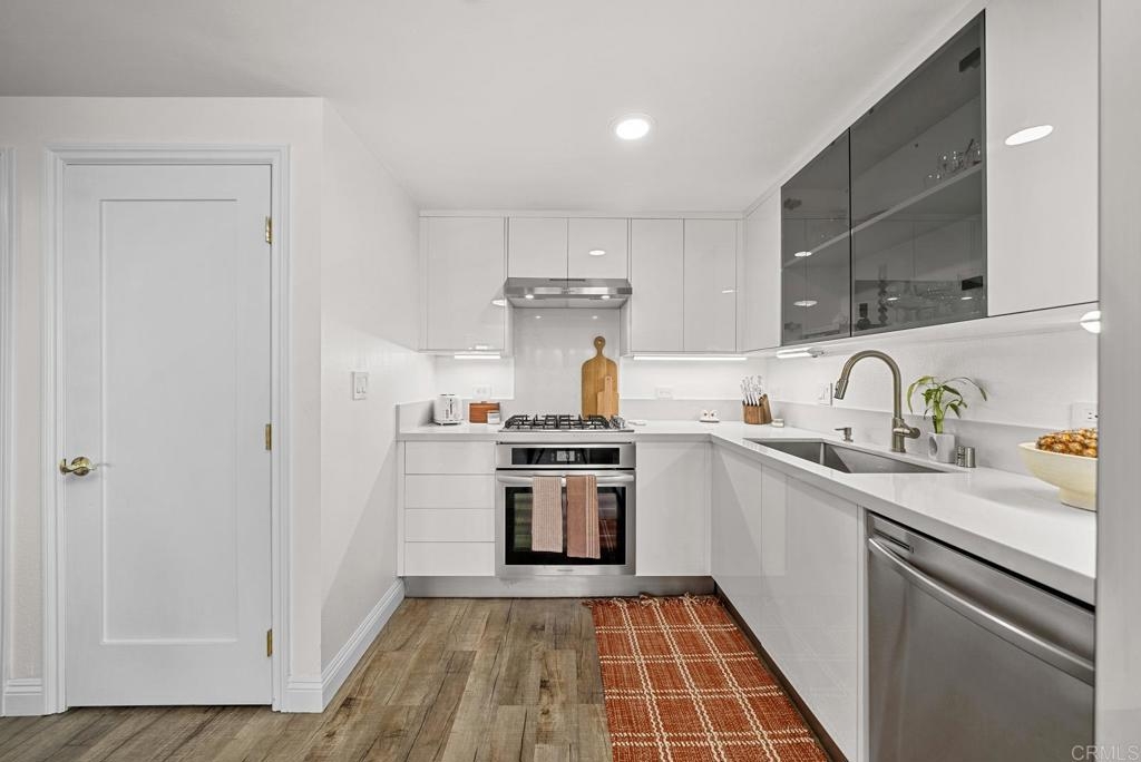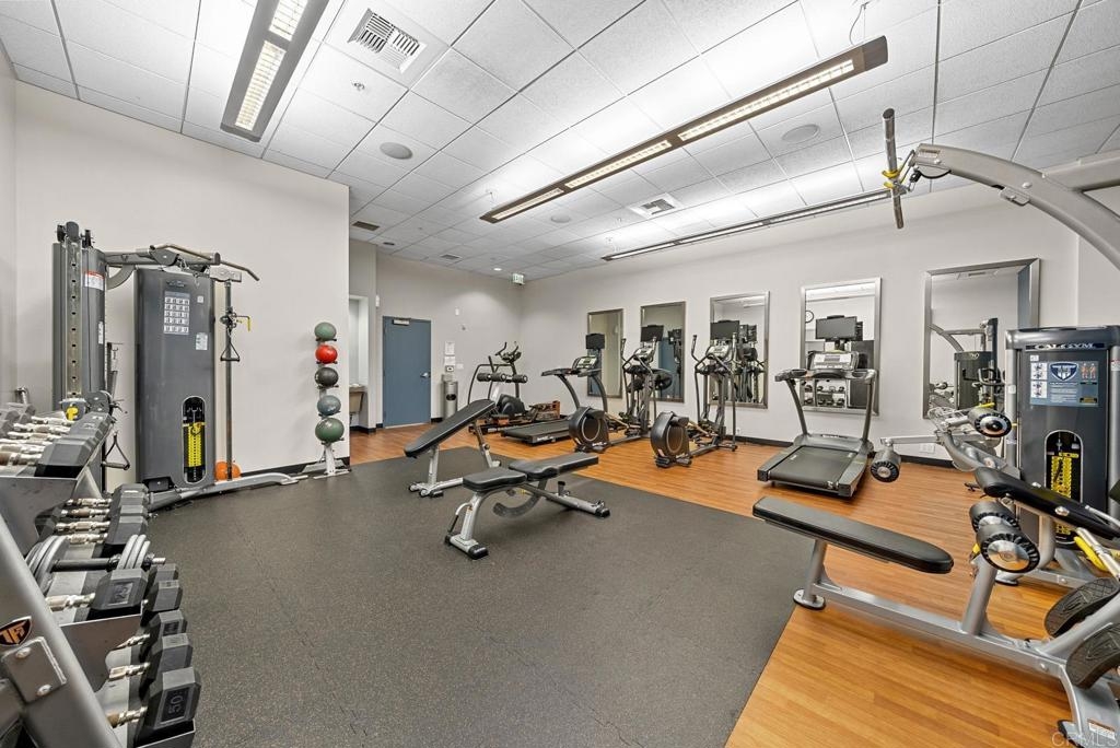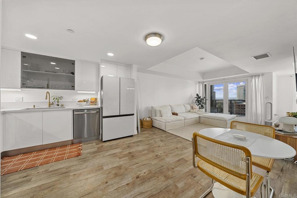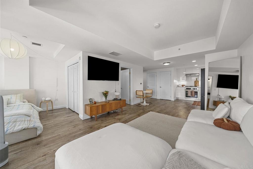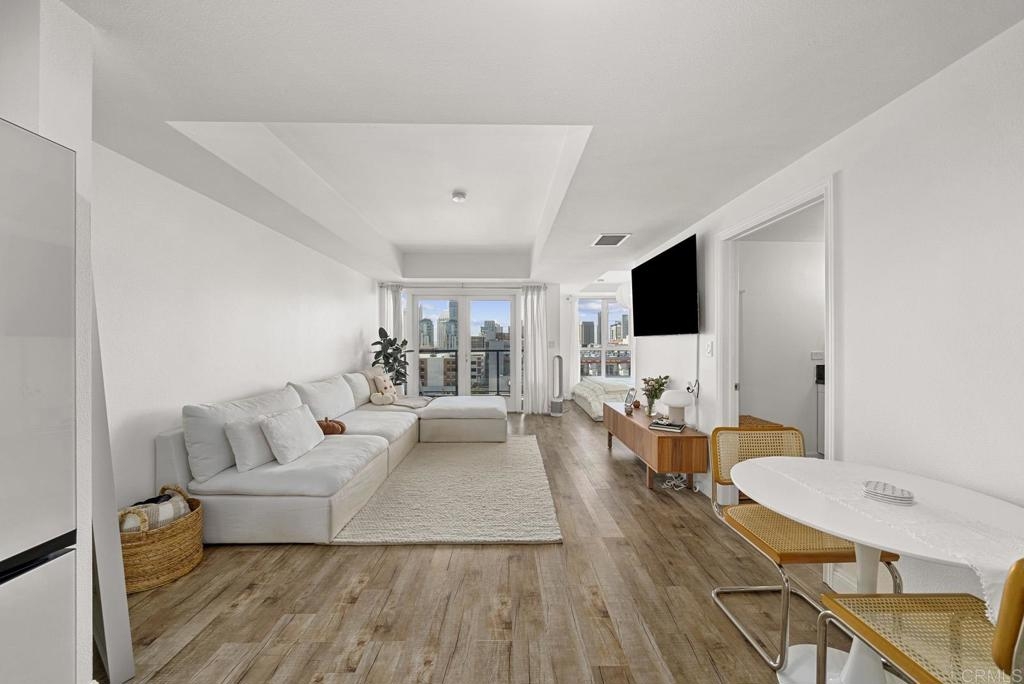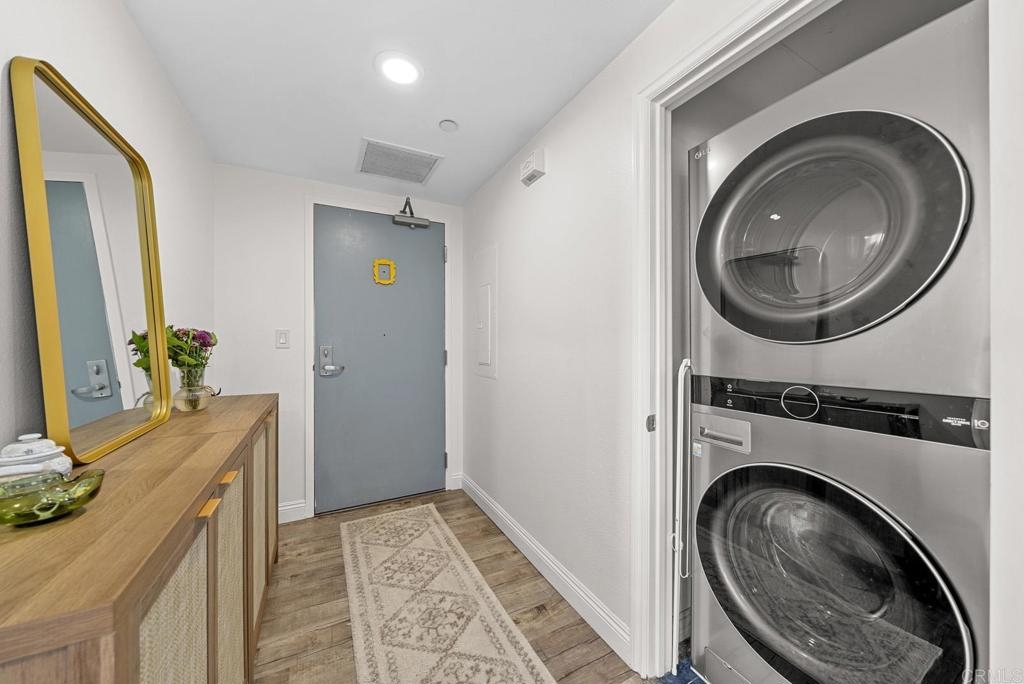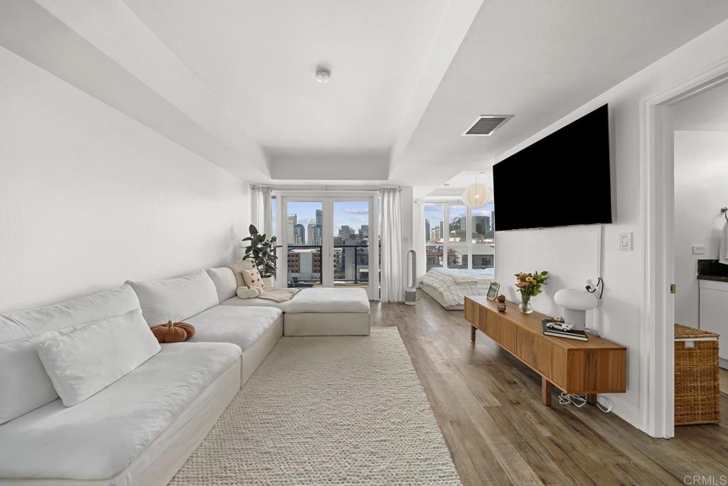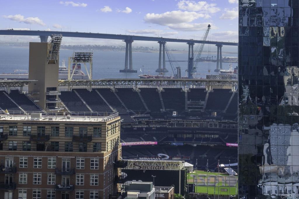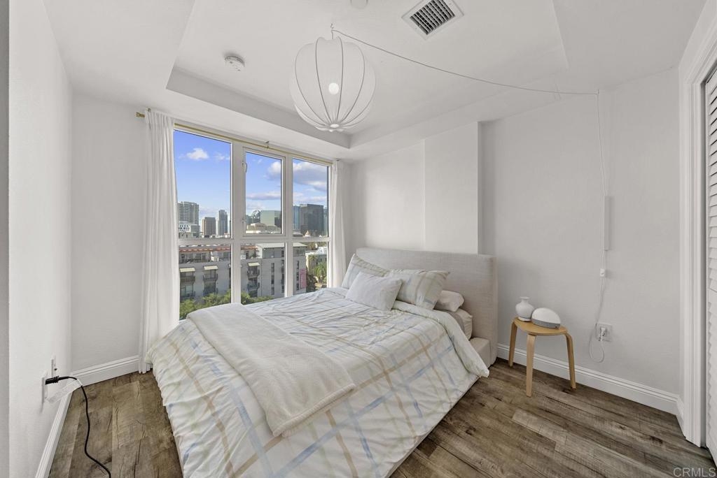 Introducing a breathtaking 7th-floor corner unit with stunning westward views of the downtown skyline and bay. Immerse yourself in the urban lifestyle, savoring the incredible cityscape and sunset vistas from your very own private balcony. This spacious studio boasts a distinct bedroom nook, complete with elegant kitchen cabinetry, stainless steel appliances, quartz countertops, and updated flooring. You'll also find the convenience of an in-unit washer and dryer. In addition, this unit offers a premium parking space on the first level and a separate storage locker. The location is simply ideal, just moments away from Petco Park, the vibrant Gaslamp District, and an array of fantastic restaurants and shops. Building amenities include a welcoming lobby, a fully equipped fitness room, a secure area for bike storage, one designated parking space in the gated underground lot, and a rooftop patio with a communal barbecue. This opportunity is not to be missed.