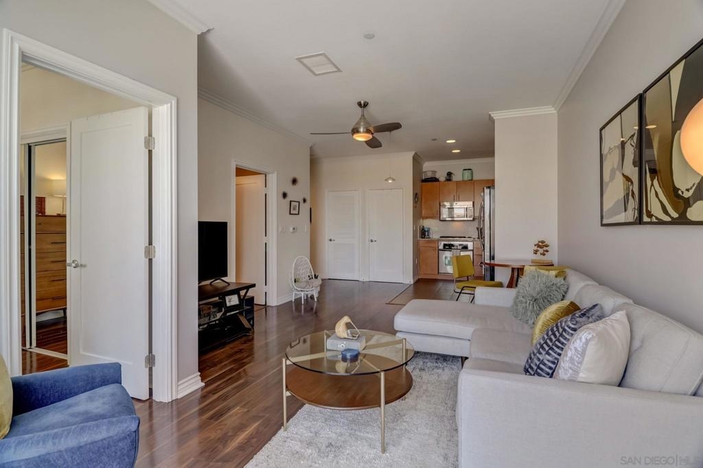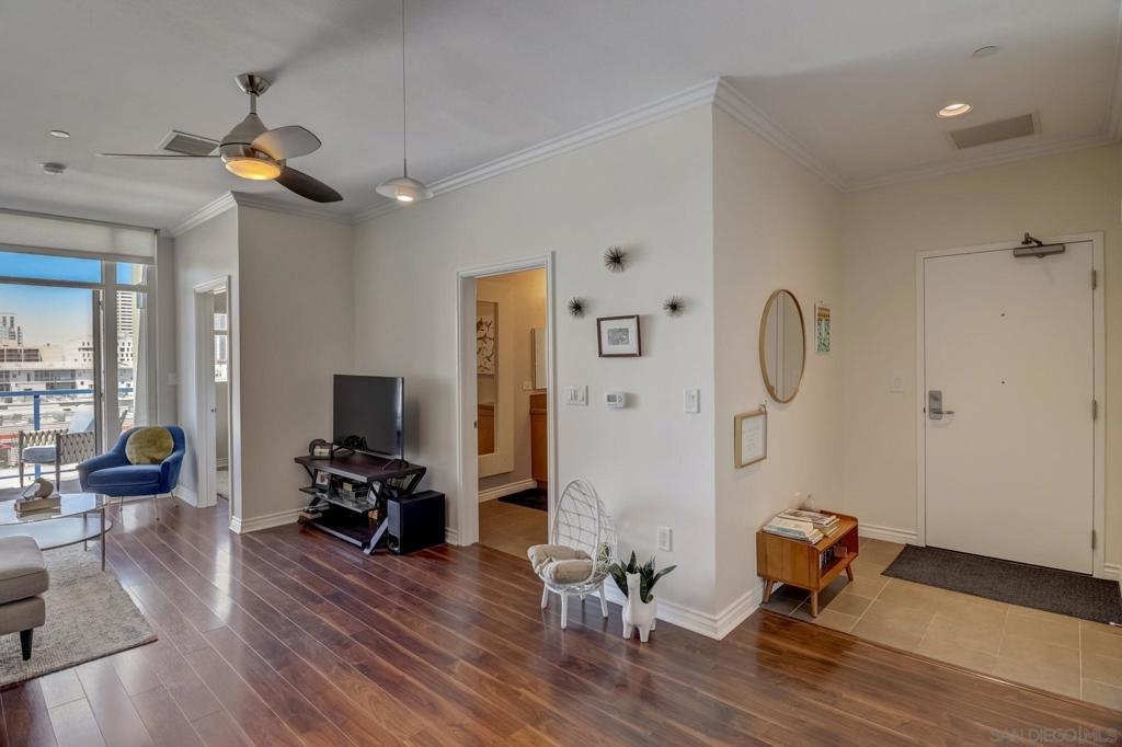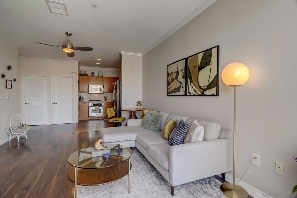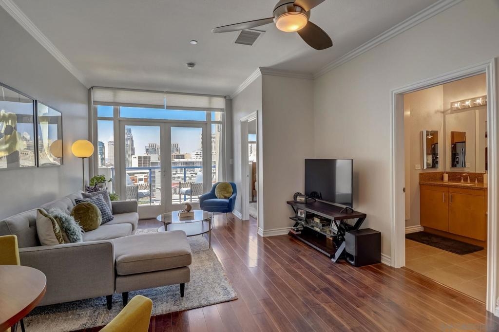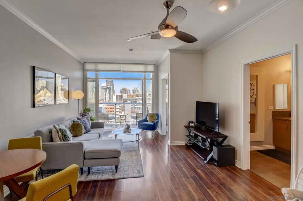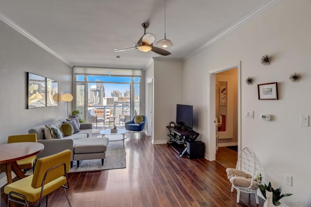 This is the perfect one bedroom, urban gem that you have been waiting for! Situated on the top floor with a corner unit advantage, enjoy privacy with no neighbors above or beside you. This bright & breezy home welcomes you with its turnkey, move-in ready charm, featuring an open floor plan & a spacious living room that effortlessly leads to the adjoining balcony, providing city & peek-a-boo bay views. Formal entry, wood flooring, stainless appliances, & in-unit washer/dryer. Oversized separate storage area conveniently located near the parking space. Nexus offers a fitness center & 7th-floor rooftop deck with BBQ & views! Great East Village location with EZ access to Petco Park, Gaslamp & the Marina District.