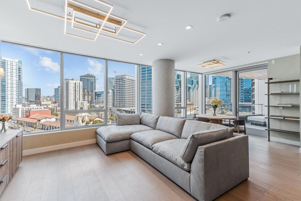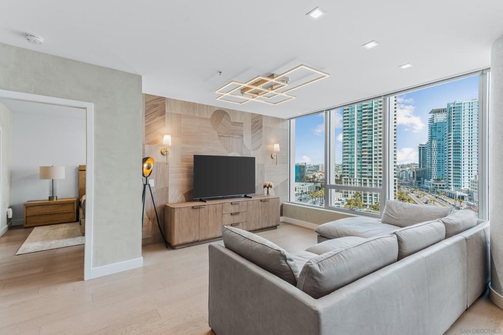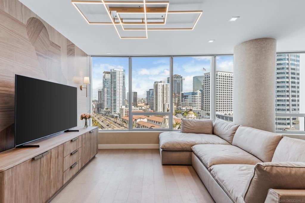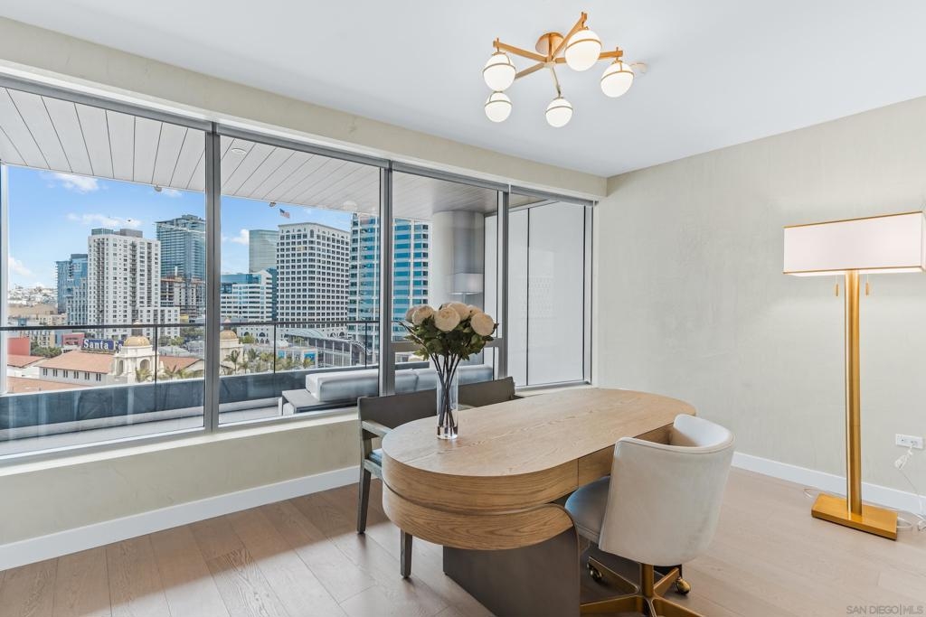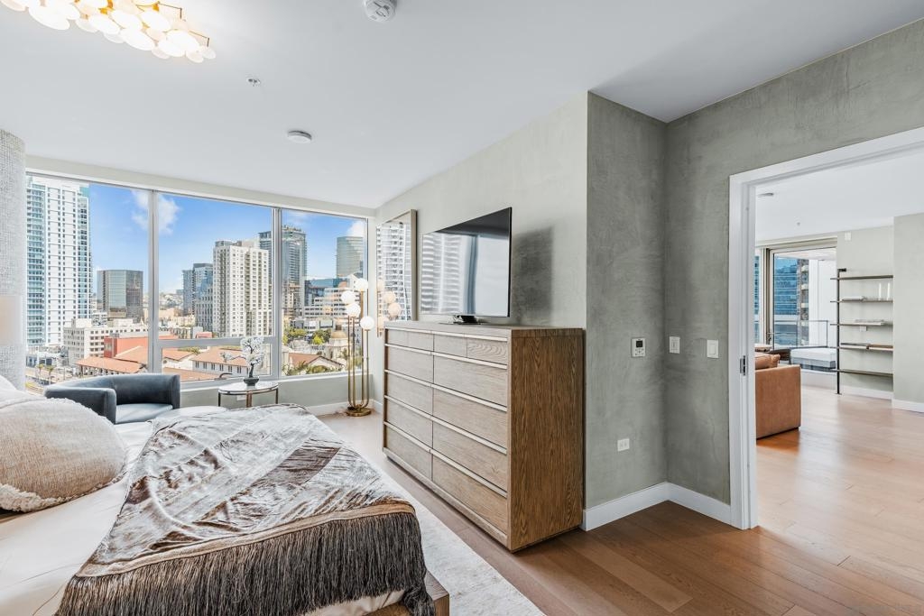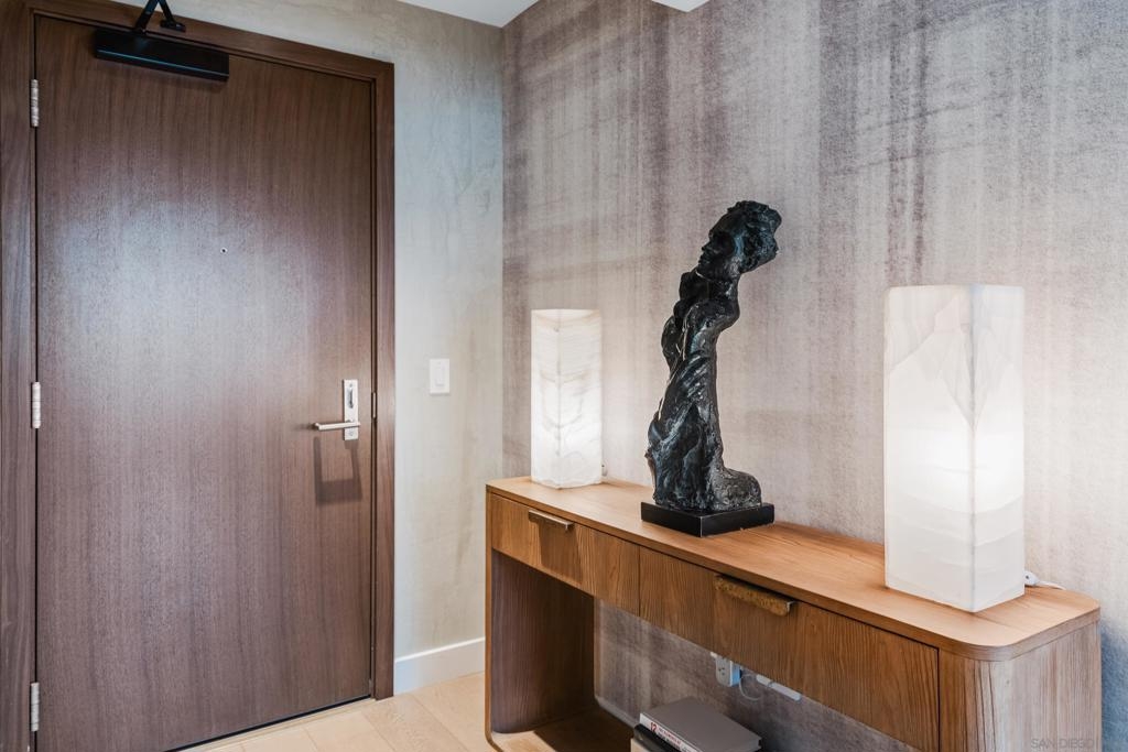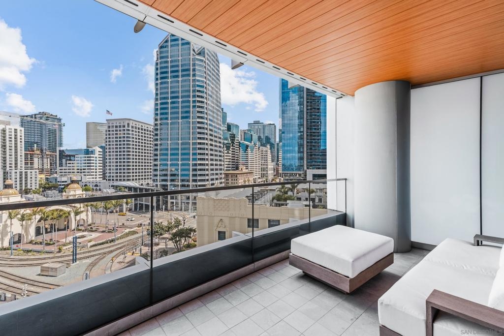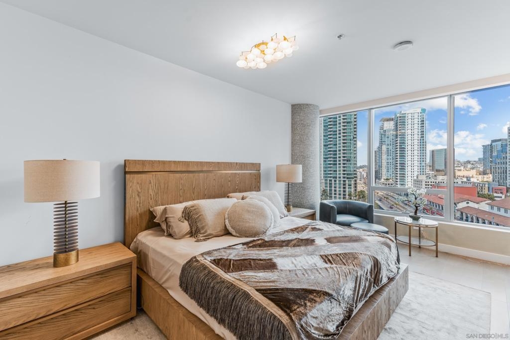 Experience the ultimate in luxury high-rise living at Pacific Gate, San Diego’s iconic waterfront address. Residence 1106 is a stunning 2-bedroom, 2-bath home spanning 1,390 sq. ft., offering an elegant blend of modern design and urban comfort. Expansive glass walls fill the home with natural light, showcasing dynamic city views framed by the downtown skyline. The open-concept living space features sophisticated upgrades like new wall coverings, fresh paint, and stylish lighting enhancements for added comfort and style. A split-bedroom layout ensures privacy and flexibility, while the private covered terrace extends your living area outdoors. The generous primary suite offers an elegant walk-in closet by California Closet Systems and a spa-inspired bath with heated floors, a walk-in shower, a soaking tub, and an anti-fog electric mirror with an integrated 10” TV screen. Automated blinds and a Smart Home system with climate control add convenience throughout the residence. The second bedroom offers flexibility as a home office or guest retreat. Residents enjoy unparalleled resort-style amenities including a private yacht share, luxury car fleet, chef concierge, guest suite, state-of-the-art fitness center with sauna and steam room, residents’ lounge, and an on-site restaurant led by a celebrity chef. Ideally located just steps from the bay, this residence is moments from Seaport Village, the Rady Shell, the new RaDD development, and San Diego’s finest dining, shopping, and entertainment. The first all-glass Super Prime residential tower in San Diego offers an unprecedented waterfront lifestyle with sky-high amenities and picture-postcard views. Directly overlooking the waterfront, the 41-story tower contains an exclusive offering of homes designed by Hirsch Bedner Associates. Renowned New York-based architectural firm Kohn Pedersen Fox (KPF) created a landmark that reimaged the San Diego skyline. The custom-engineered glass walls dynamically reflect the hues of the sky and the Pacific Ocean. Pacific Gate has evolved the San Diego skyline and represents the future of the city. The building is comprised of two-nested curved glass towers that rise as a single column from a three-story ground floor retail podium on the north and west sides of the tower. Because of the building’s curves and exterior glass, Pacific Gate offers a striking viewing experience from every vantage point. Residents arrive home to a beautifully landscaped motor court with a private luxury car fleet, which leads to a double-height lobby with a 24-hour concierge and porter services. Two levels of amenities boast a residents lounge ideal for events and everyday use, the fitness center contains an extensive range of state-of-the-art equipment. Adjacent to the fitness center is the steam and sauna retreats that open up to the fourth-floor pool terrace fitted with poolside cabanas and glass surround.