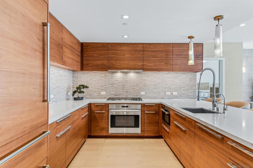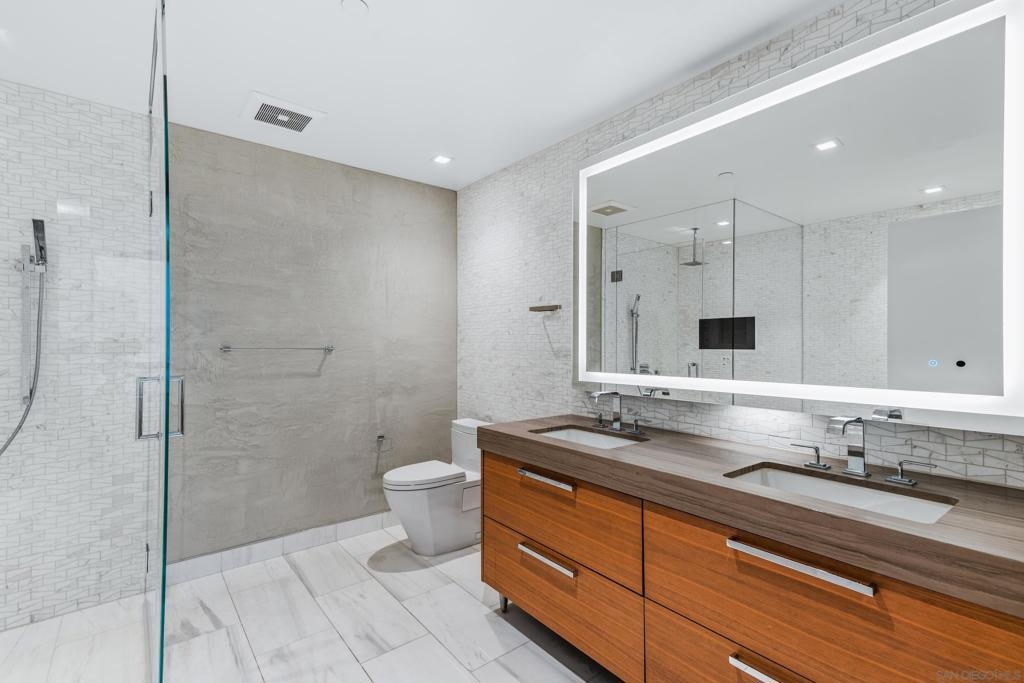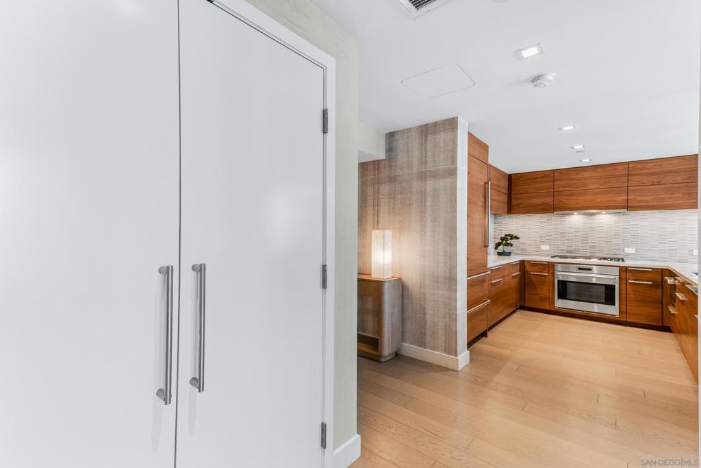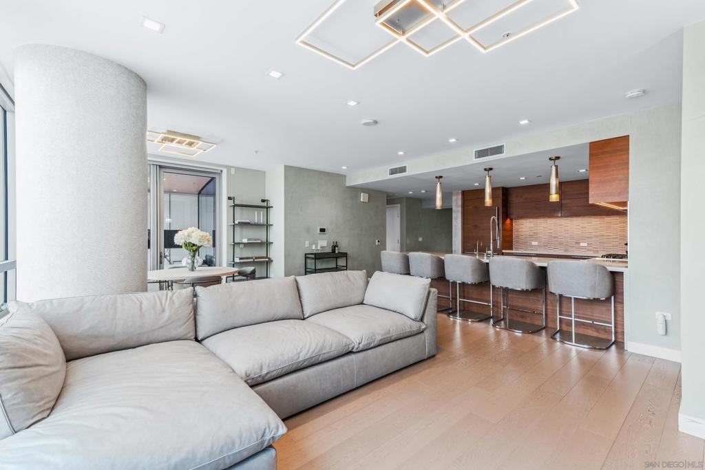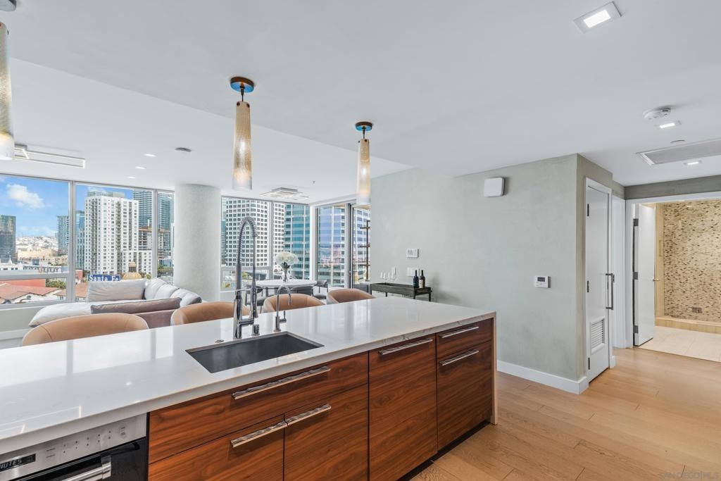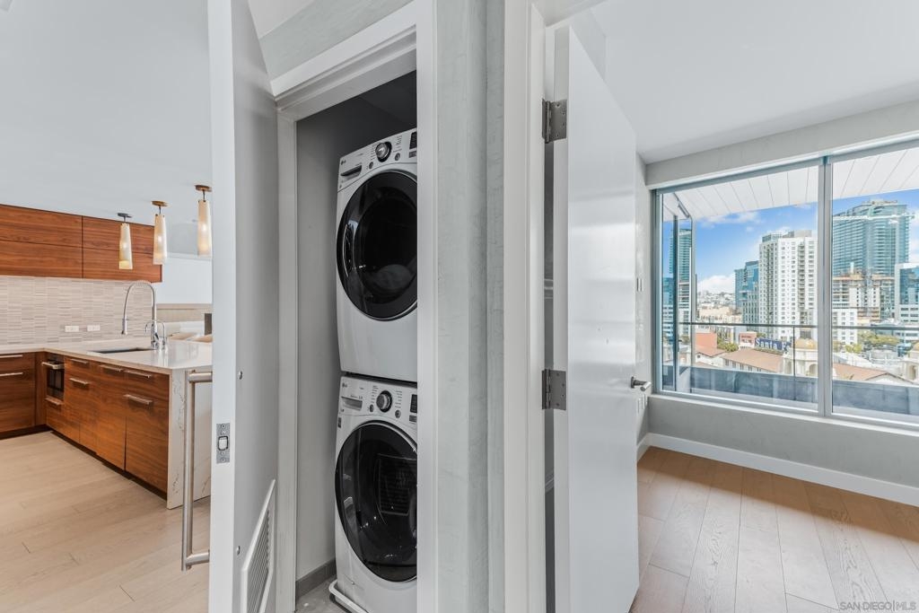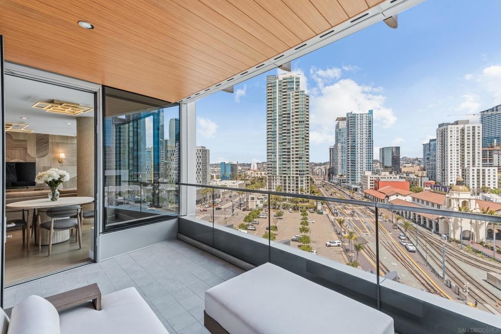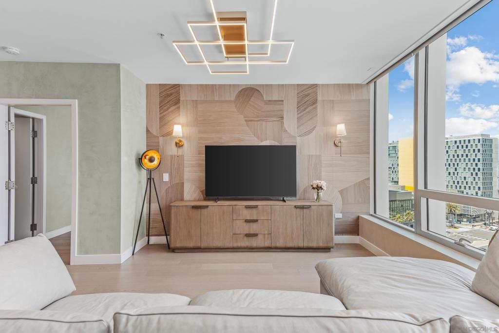 Experience the ultimate in luxury high-rise living at Pacific Gate, San Diego’s iconic waterfront address. Residence 1106 is a stunning 2-bedroom, 2-bath home spanning 1,390 sq. ft., offering an elegant blend of modern design and urban comfort. Expansive glass walls fill the home with natural light, showcasing dynamic city views framed by the downtown skyline. The open-concept living space features sophisticated upgrades like new wall coverings, fresh paint, and stylish lighting enhancements for added comfort and style. A split-bedroom layout ensures privacy and flexibility, while the private covered terrace extends your living area outdoors. The generous primary suite offers an elegant walk-in closet by California Closet Systems and a spa-inspired bath with heated floors, a walk-in shower, a soaking tub, and an anti-fog electric mirror with an integrated 10” TV screen. Automated blinds and a Smart Home system with climate control add convenience throughout the residence. The second bedroom offers flexibility as a home office or guest retreat. Residents enjoy unparalleled resort-style amenities including a private yacht share, luxury car fleet, chef concierge, guest suite, state-of-the-art fitness center with sauna and steam room, residents’ lounge, and an on-site restaurant led by a celebrity chef. Ideally located just steps from the bay, this residence is moments from Seaport Village, the Rady Shell, the new RaDD development, and San Diego’s finest dining, shopping, and entertainment. The first all-glass Super Prime residential tower in San Diego offers an unprecedented waterfront lifestyle with sky-high amenities and picture-postcard views. Directly overlooking the waterfront, the 41-story tower contains an exclusive offering of homes designed by Hirsch Bedner Associates. Renowned New York-based architectural firm Kohn Pedersen Fox (KPF) created a landmark that reimaged the San Diego skyline. The custom-engineered glass walls dynamically reflect the hues of the sky and the Pacific Ocean. Pacific Gate has evolved the San Diego skyline and represents the future of the city. The building is comprised of two-nested curved glass towers that rise as a single column from a three-story ground floor retail podium on the north and west sides of the tower. Because of the building’s curves and exterior glass, Pacific Gate offers a striking viewing experience from every vantage point. Residents arrive home to a beautifully landscaped motor court with a private luxury car fleet, which leads to a double-height lobby with a 24-hour concierge and porter services. Two levels of amenities boast a residents lounge ideal for events and everyday use, the fitness center contains an extensive range of state-of-the-art equipment. Adjacent to the fitness center is the steam and sauna retreats that open up to the fourth-floor pool terrace fitted with poolside cabanas and glass surround.
