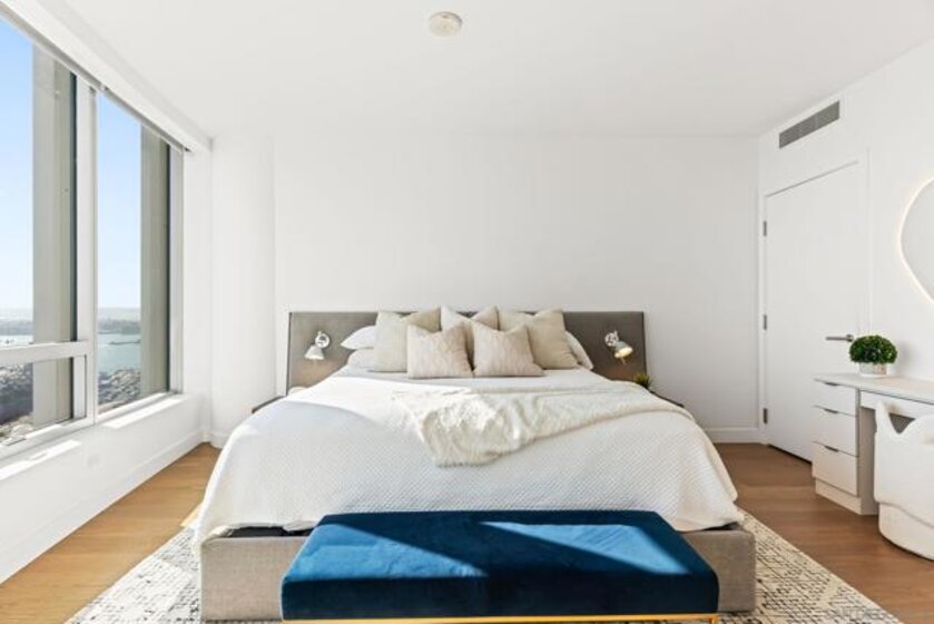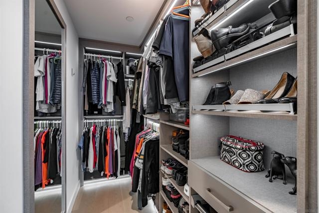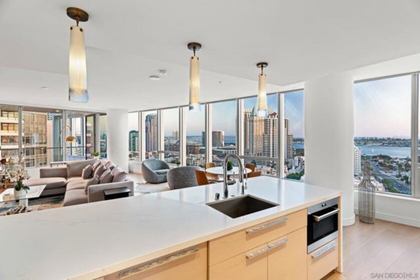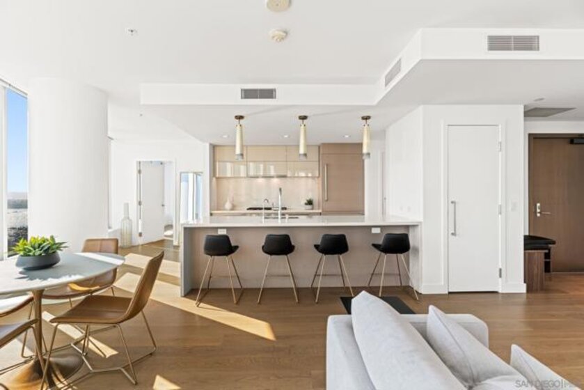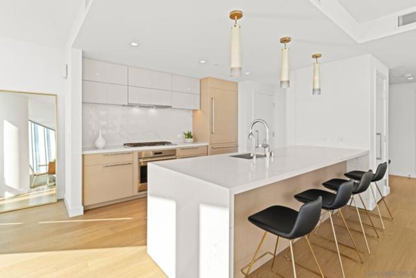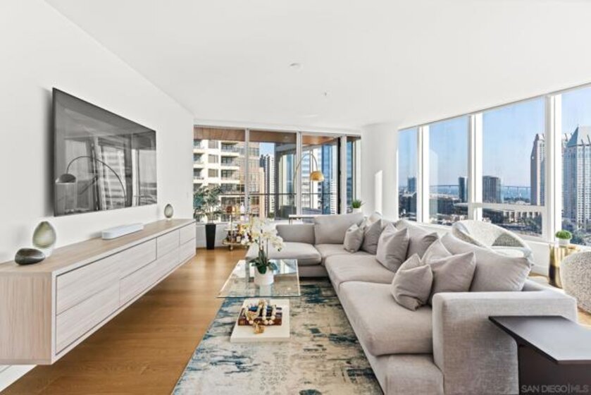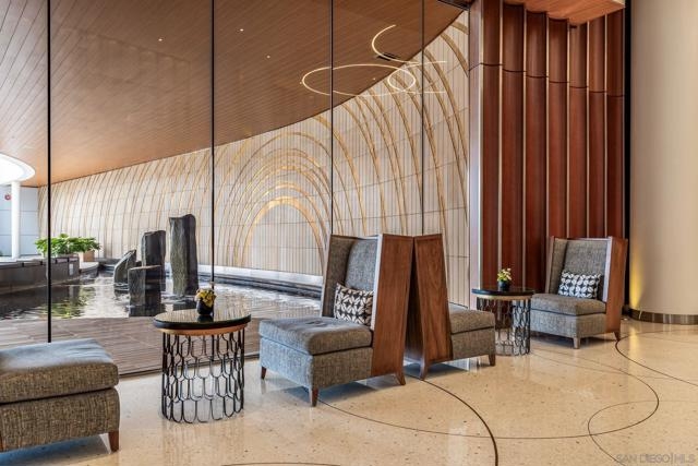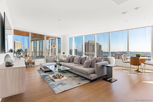 Experience resort-style living high above the San Diego waterfront in this stunning two-bedroom, two-bath residence at Pacific Gate, downtown’s most iconic luxury high-rise. Framed by walls of glass, this highly sought-after southwest corner floor plan captures panoramic views of the Pacific Ocean, San Diego Bay, Coronado Bridge, and the city skyline. Thoughtfully designed and upgraded, this home features custom built-ins throughout including a sleek living room media center, a bespoke walk-in closet and vanity in the primary suite, and a versatile office station with a pull-out Murphy bed in the guest room. The open-concept kitchen showcases top-of-the-line Wolf, Miele, and Sub-Zero appliances, complemented by rich finishes and designer details. Step onto your expansive private terrace and take in the breathtaking coastal vistas, perfect for morning coffee or evening sunsets. The split-bedroom layout provides optimal privacy and functionality, ideal for hosting guests or working from home. As a resident of Pacific Gate, you’ll enjoy an unparalleled collection of amenities including a private luxury boat share, car fleet, 24-hour concierge, guest suite, pool terrace with cabanas, state-of-the-art fitness center, residents lounge, screening room, and on-site restaurant. Live moments from the waterfront, Seaport Village, and the city’s finest dining and entertainment. The first all-glass Super Prime residential tower in San Diego offers an unprecedented waterfront lifestyle with sky-high amenities and picture-postcard views. Directly overlooking the waterfront, the 41-story tower contains an exclusive offering of homes designed by Hirsch Bedner Associates. Renowned New York-based architectural firm Kohn Pedersen Fox (KPF) created a landmark that reimaged the San Diego skyline. The custom-engineered glass walls dynamically reflect the hues of the sky and the Pacific Ocean. Pacific Gate has evolved the San Diego skyline and represents the future of the city. The building is comprised of two-nested curved glass towers that rise as a single column from a three-story ground floor retail podium on the north and west sides of the tower. Because of the building’s curves and exterior glass, Pacific Gate offers a striking viewing experience from every vantage point. Residents arrive home to a beautifully landscaped motor court with a private luxury car fleet, which leads to a double-height lobby with a 24-hour concierge and porter services. Two levels of amenities boast a residents lounge ideal for events and everyday use, the fitness center contains an extensive range of state-of-the-art equipment. Adjacent to the fitness center is the steam and sauna retreats that open up to the fourth-floor pool terrace fitted with poolside cabanas and glass surround.