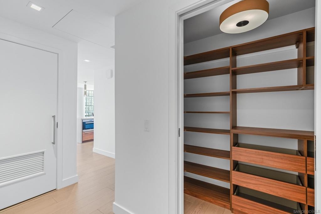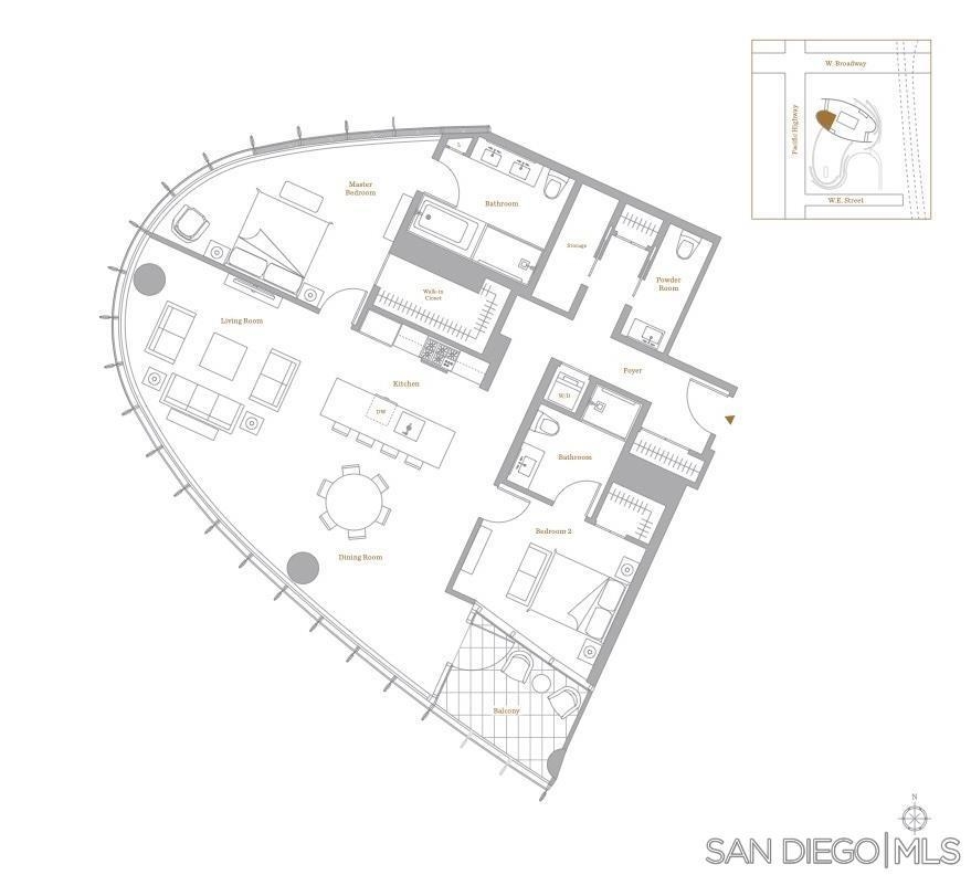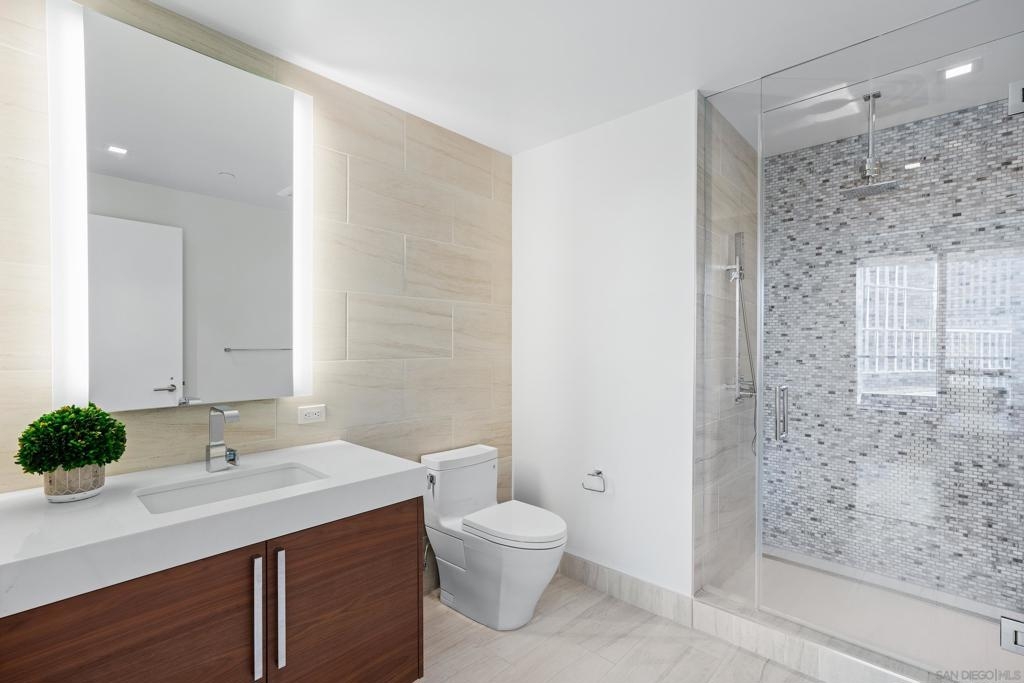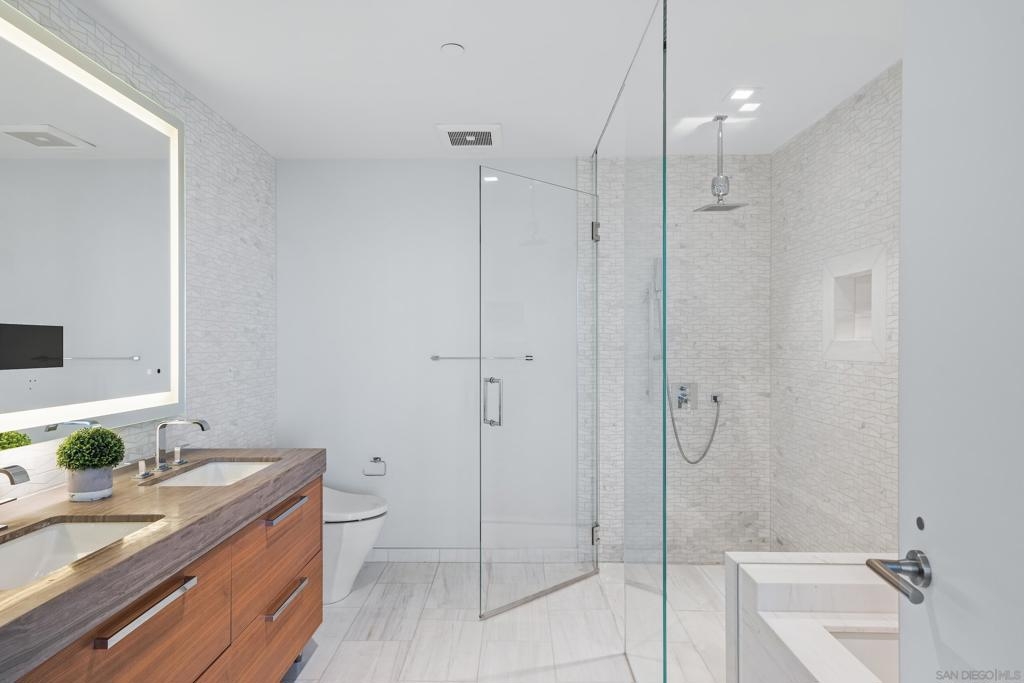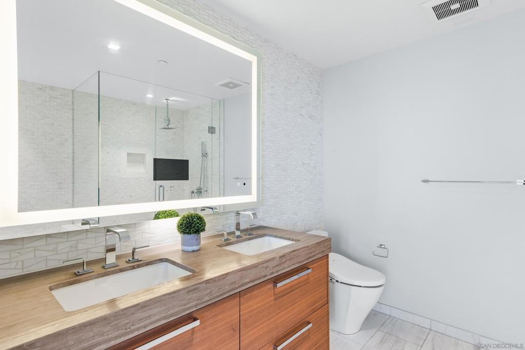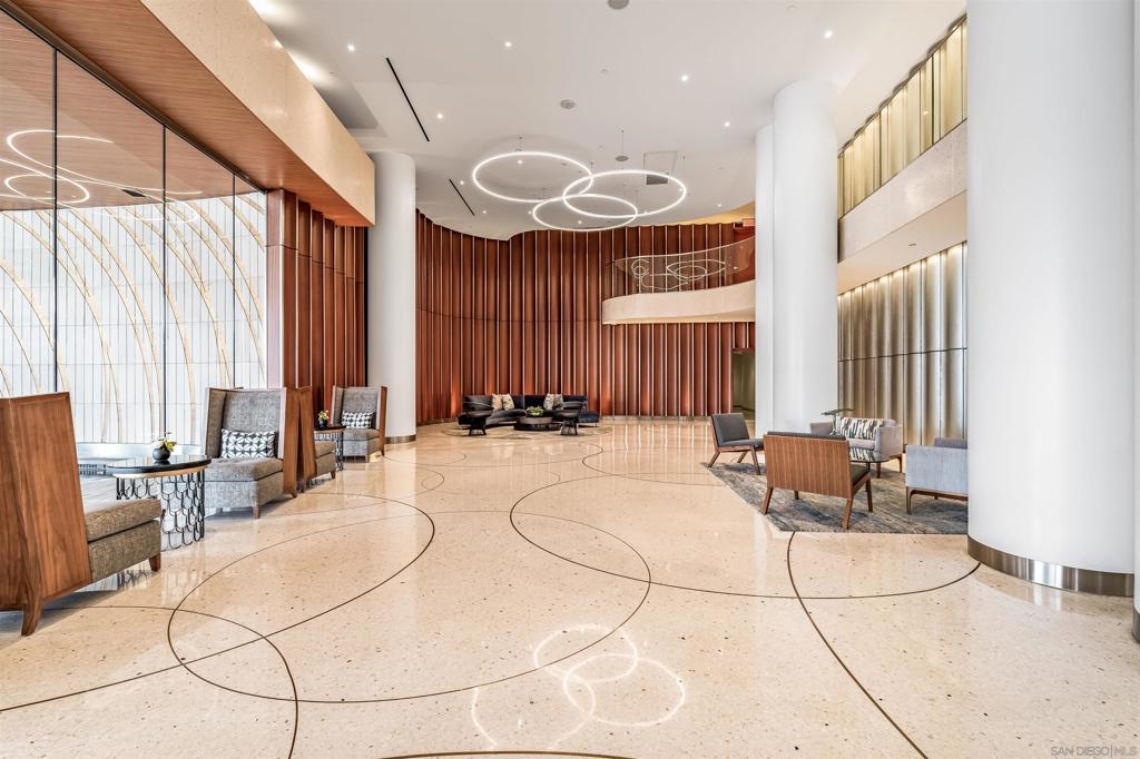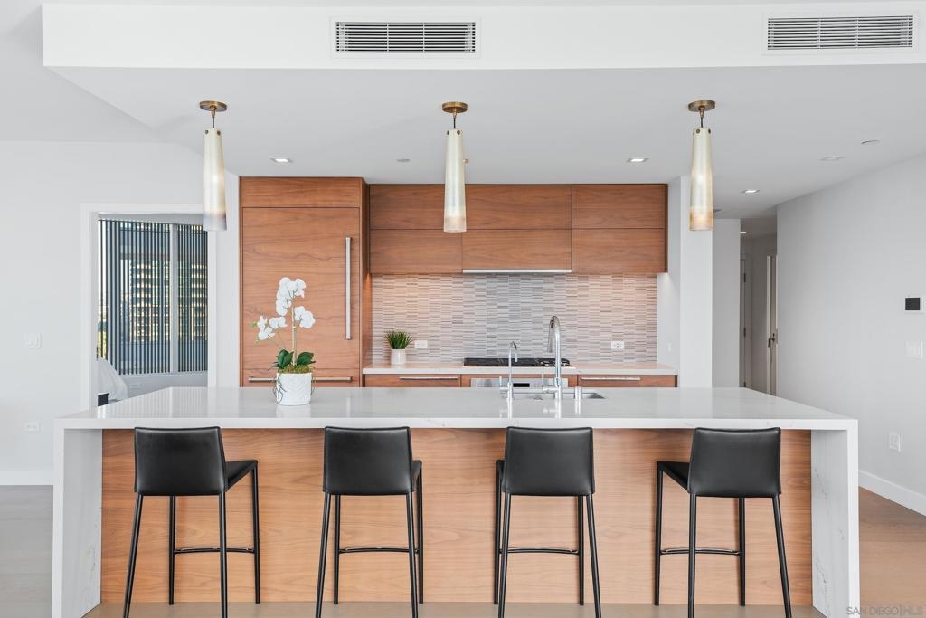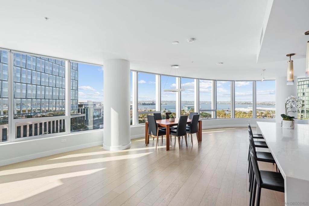 Welcome to San Diego's most distinguished residential tower, Pacific Gate. Spanning just over 1,800 sq. ft., this turn-key luxury condo features 2 bedrooms, 2.5 bathrooms, ample storage space, beautiful upgrades, and exquisite bay views. A curved form living area wall of oversized windows offers panoramic southwest, northwest, bay, and city views. Elegantly upgraded, the home boasts tasteful modern lighting and custom high-end built-ins. The chef's kitchen features a large Caesarstone waterfall-edge island, top-of-the-line Wolf, Sub-Zero, and Miele appliances, push-button cabinetry, and illuminated drawers. The primary bedroom showcases a captivating architectural curved design and includes a custom walk-in closet. Its spa-inspired bathroom offers heated floors, a glass-enclosed shower, and a luxurious soaking tub. The coveted 02 floorplan at Pacific Gate was among the most popular during BOSA’s pre-sale phase. Pacific Gate offers exclusive resort-style services and amenities, including a private yacht share, luxury car fleet, 24-hour concierge, porter services, a pool terrace with private cabanas, spa, fire pit, cooking and dining alfresco, a resident lounge with a catering kitchen, a state-of-the-art fitness center, steam and sauna rooms, a guest suite, a screening room, a business center, and an on-site restaurant. Experience the best of America’s Finest City at your doorstep! The first all-glass Super Prime residential tower in San Diego, offers an unprecedented waterfront lifestyle with sky-high amenities and picture-postcard views. Directly overlooking the waterfront, the 41-story tower contains an exclusive offering of homes designed by Hirsch Bedner Associates. Renowned New York-based architectural firm Kohn Pedersen Fox (KPF) created a landmark that reimaged the San Diego skyline. The custom engineered glass walls dynamically reflect the hues of the sky and the Pacific Ocean. Pacific Gate has evolved the San Diego skyline and represents the future of the city. The building is comprised of two-nested curved glass towers that rise as a single column from a three-story ground floor retail podium on the north and west sides of the tower. Because of the building’s curves and exterior glass, Pacific Gate offers a striking viewing experience from every vantage point. Residents arrive home to a beautifully landscaped motor court with private luxury car fleet, which leads to a double-height lobby with a 24-hour concierge and porter services. Two levels of amenities boasts a residents lounge ideal for events and everyday use, the fitness center contains an extensive range of state-of-the-art equipment. Adjacent to the fitness center are the steam and sauna retreats that open up to the fourth floor pool terrace fitted with poolside cabanas and glass surround. Residents at Pacific Gate have access to the most extensive resort-like services and amenities in the area, from a residents only guest suite, Chef Concierge, porter services, private luxury car fleet and Pacific Dream, Pacific Gate’s private boat share. Interior finishes include: push button upper cabinetry for ease of access and to maximize storage (lift cabinets only); Sub-Zero cabinet-front refrigerator, water dispenser, and ice maker; Wolf stainless steel five-burner gas cooktop; Wolf stainless steel convection oven; Miele stainless steel built-in range hood; Miele energy-efficient dishwasher with custom cabinet door panel and hidden controls; Wolf microwave; Caesarstone countertops and Caesarstone backsplash; ceiling can lights, integrated Everpure water filtration system.
