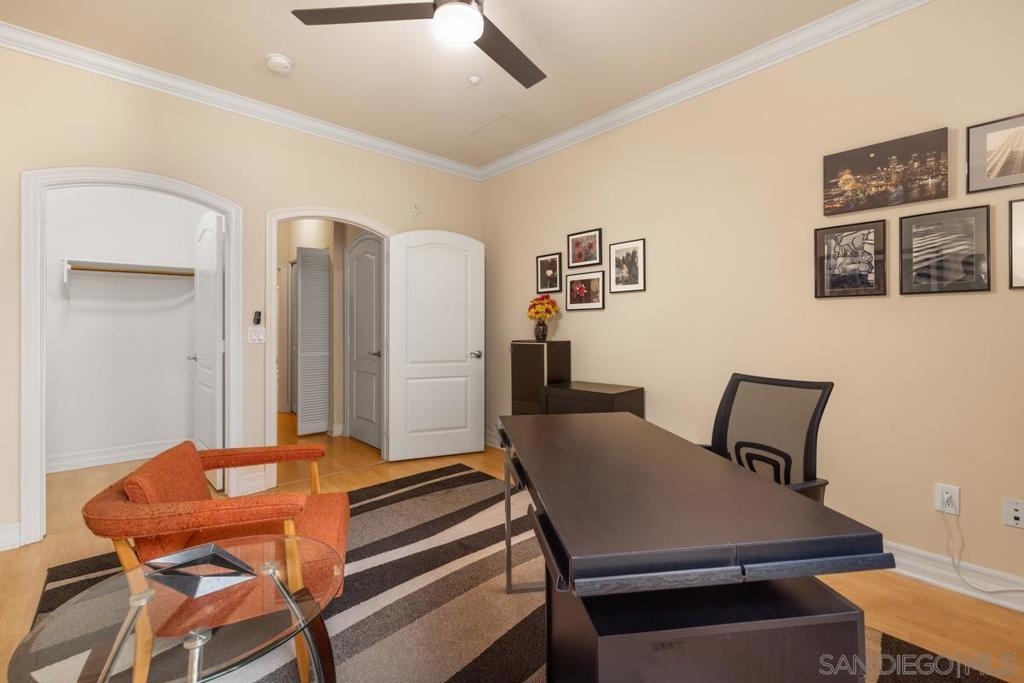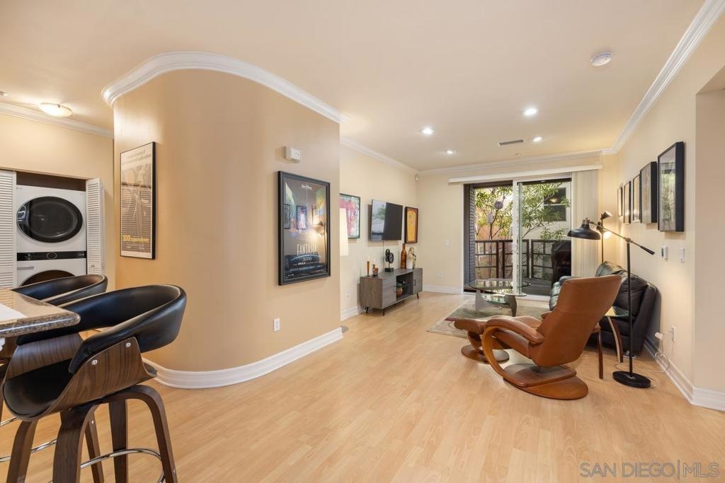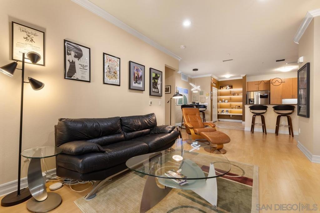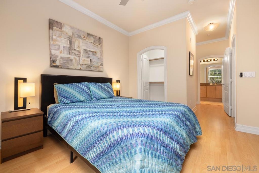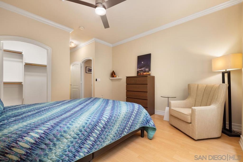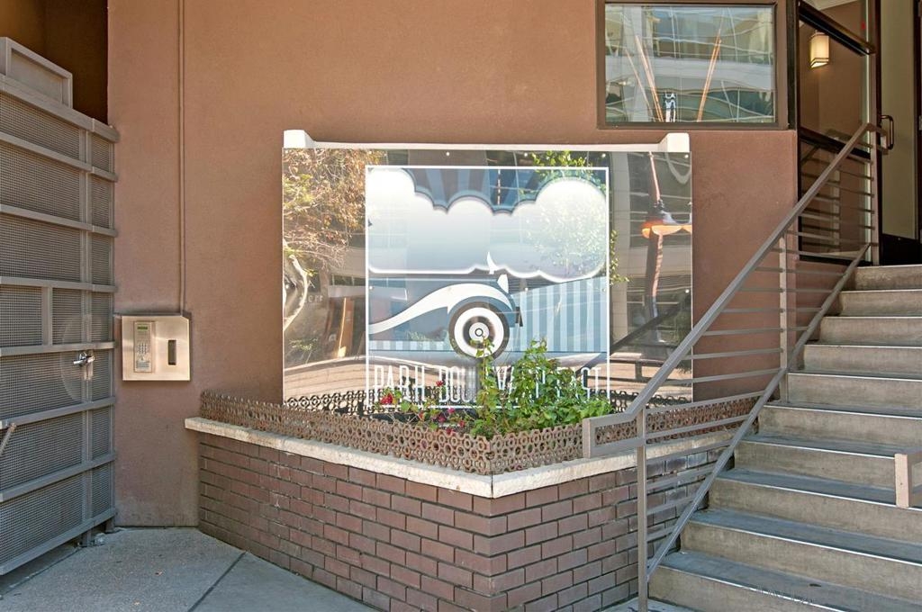 Located across from the Thomas Jefferson Law School, with curbside trolley access, three blocks to Petco Park, and a short walk to the Gaslamp restaurants, this luxurious East Village unit is quiet and cozy. The open floor plan features dramatic LED lighting with home automation ready smart switches, high ceilings with crown moulding, and laminate flooring. The kitchen features granite countertops and a recently upgraded ultra quiet dishwasher. Bedrooms have ceiling fans and walk-in closets. Full size stacked washer and dryer in unit. 1 assigned underground parking space. Sip your coffee in the morning light, or relax on the spacious wood-decked balcony!