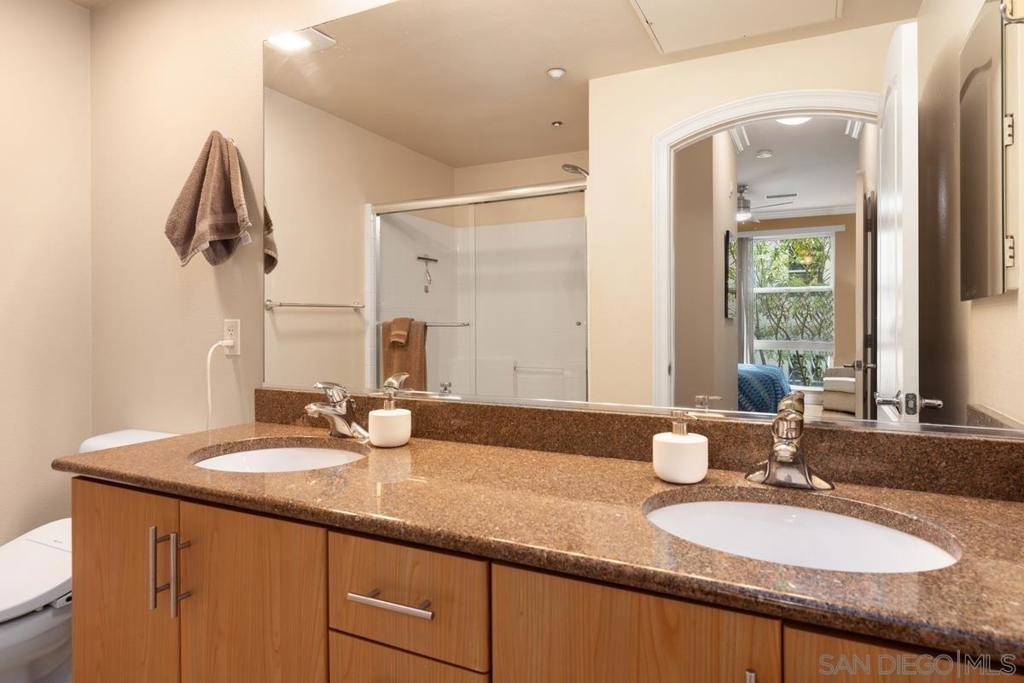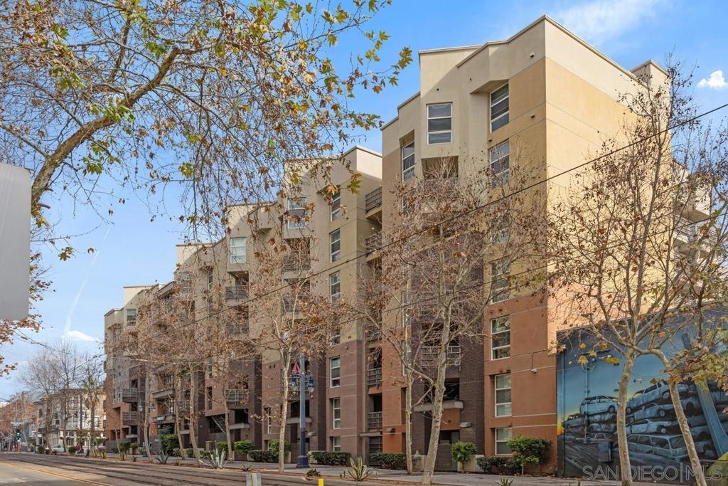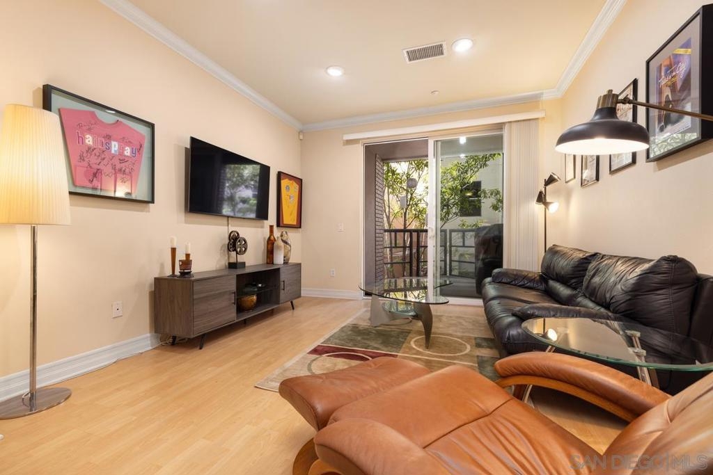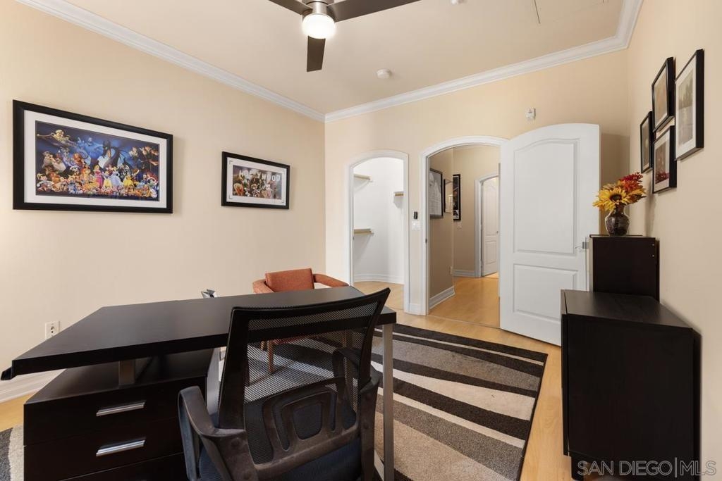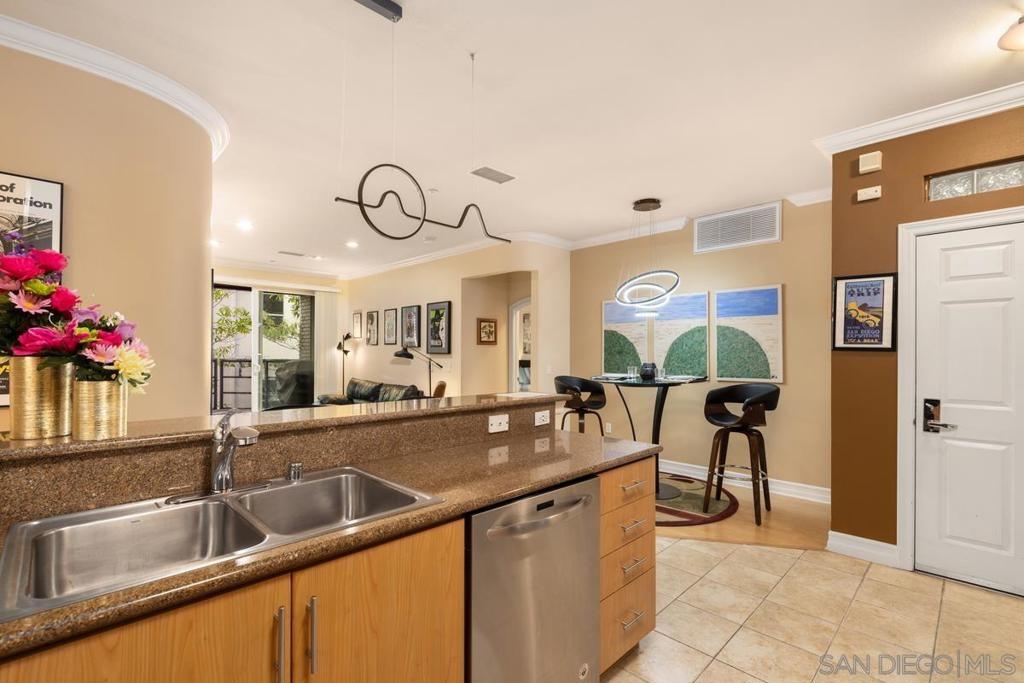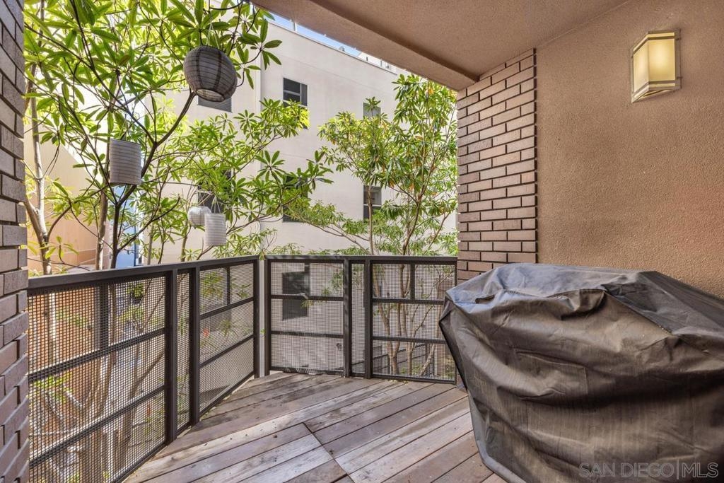 Located across from the Thomas Jefferson Law School, with curbside trolley access, three blocks to Petco Park, and a short walk to the Gaslamp restaurants, this luxurious East Village unit is quiet and cozy. The open floor plan features dramatic LED lighting with home automation ready smart switches, high ceilings with crown moulding, and laminate flooring. The kitchen features granite countertops and a recently upgraded ultra quiet dishwasher. Bedrooms have ceiling fans and walk-in closets. Full size stacked washer and dryer in unit. 1 assigned underground parking space. Sip your coffee in the morning light, or relax on the spacious wood-decked balcony!