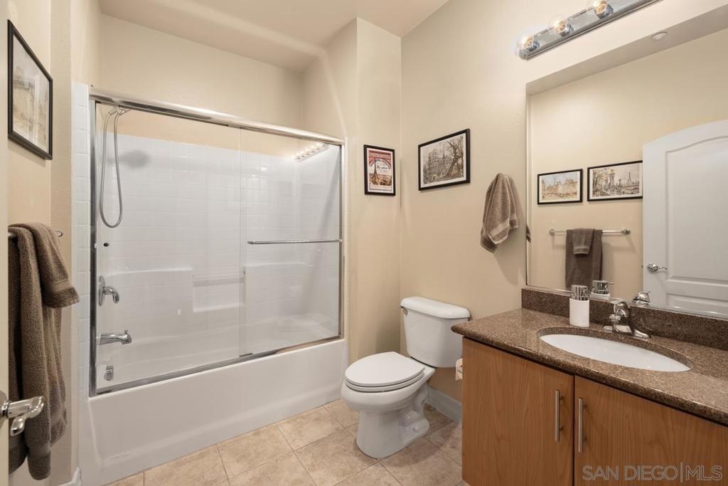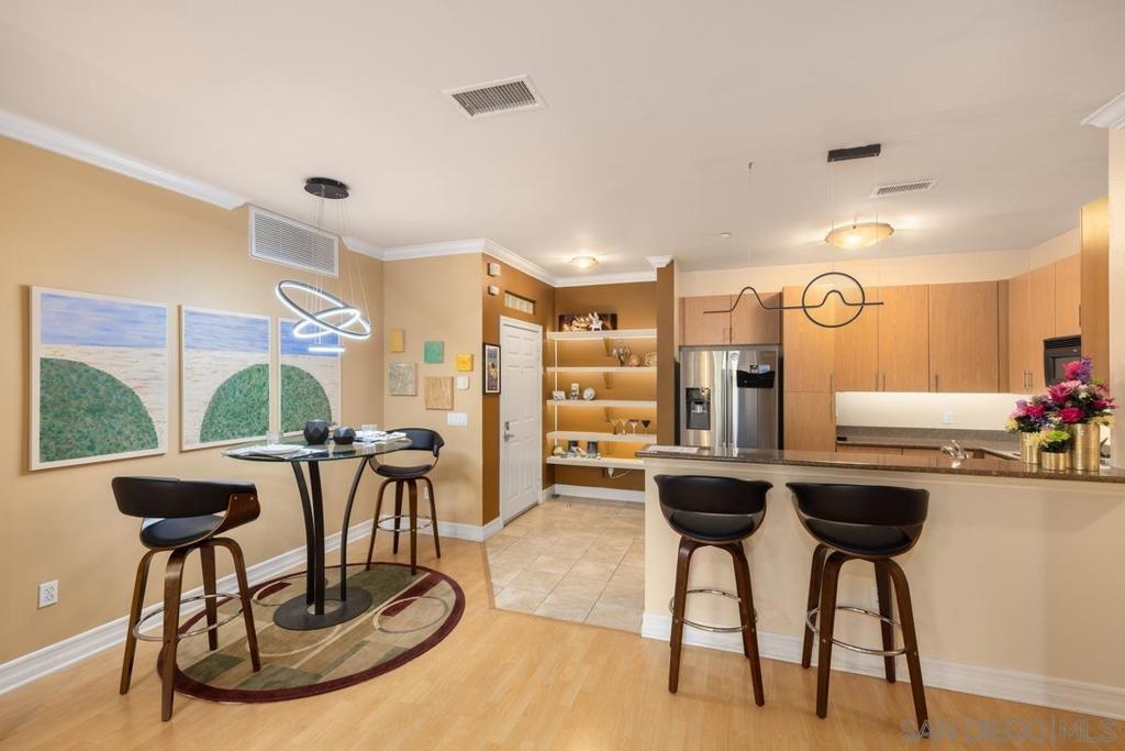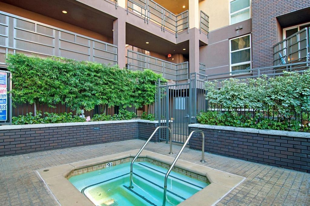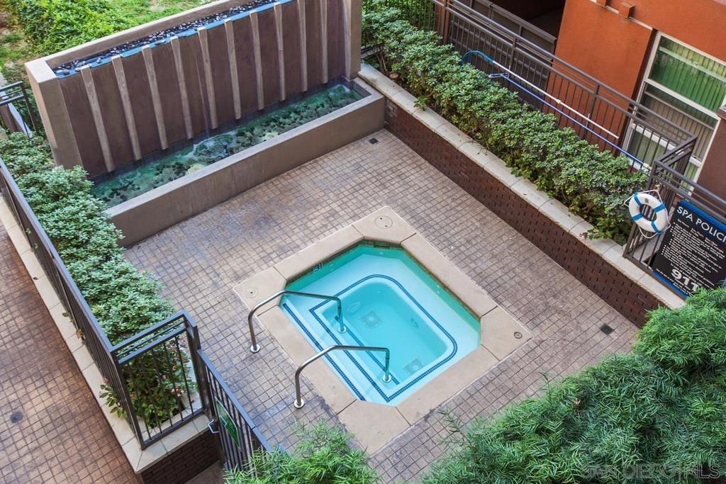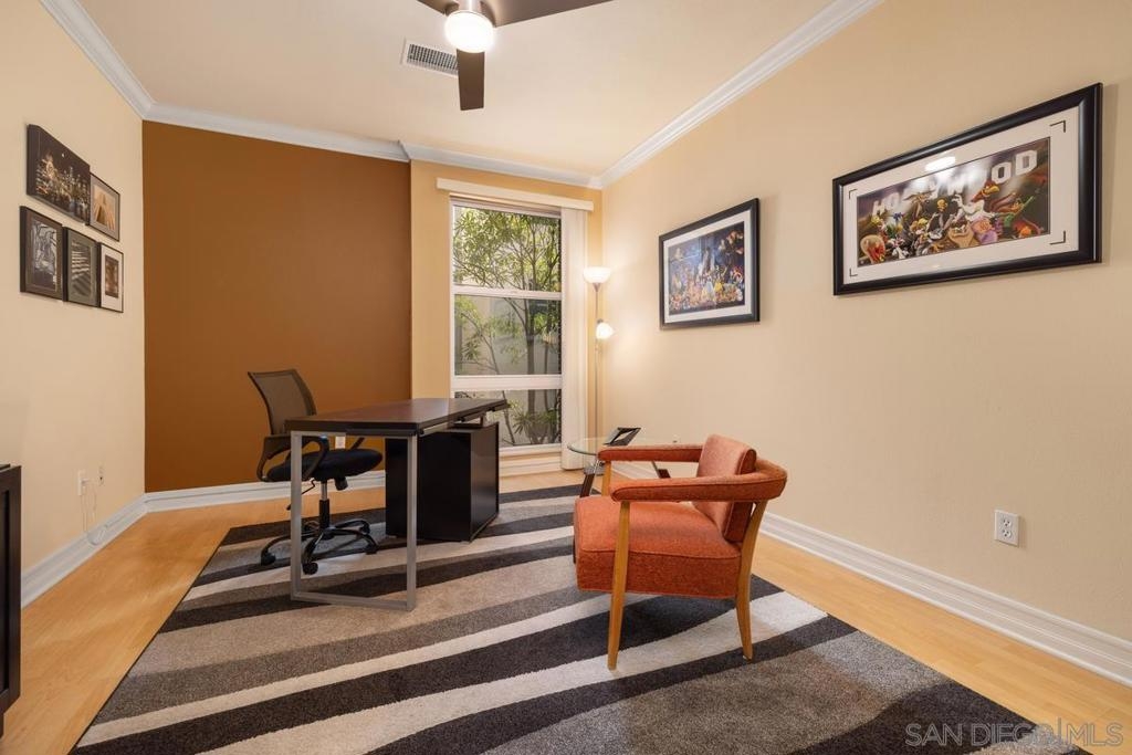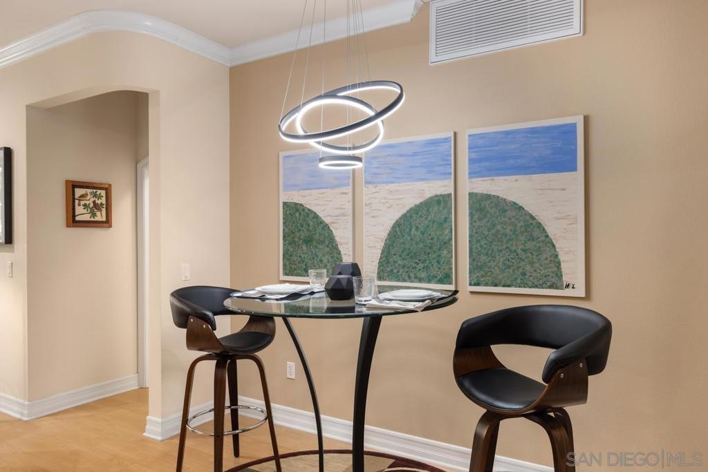 Located across from the Thomas Jefferson Law School, with curbside trolley access, three blocks to Petco Park, and a short walk to the Gaslamp restaurants, this luxurious East Village unit is quiet and cozy. The open floor plan features dramatic LED lighting with home automation ready smart switches, high ceilings with crown moulding, and laminate flooring. The kitchen features granite countertops and a recently upgraded ultra quiet dishwasher. Bedrooms have ceiling fans and walk-in closets. Full size stacked washer and dryer in unit. 1 assigned underground parking space. Sip your coffee in the morning light, or relax on the spacious wood-decked balcony!