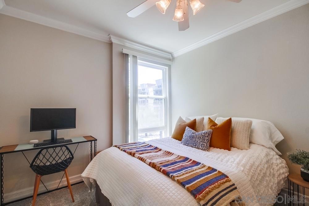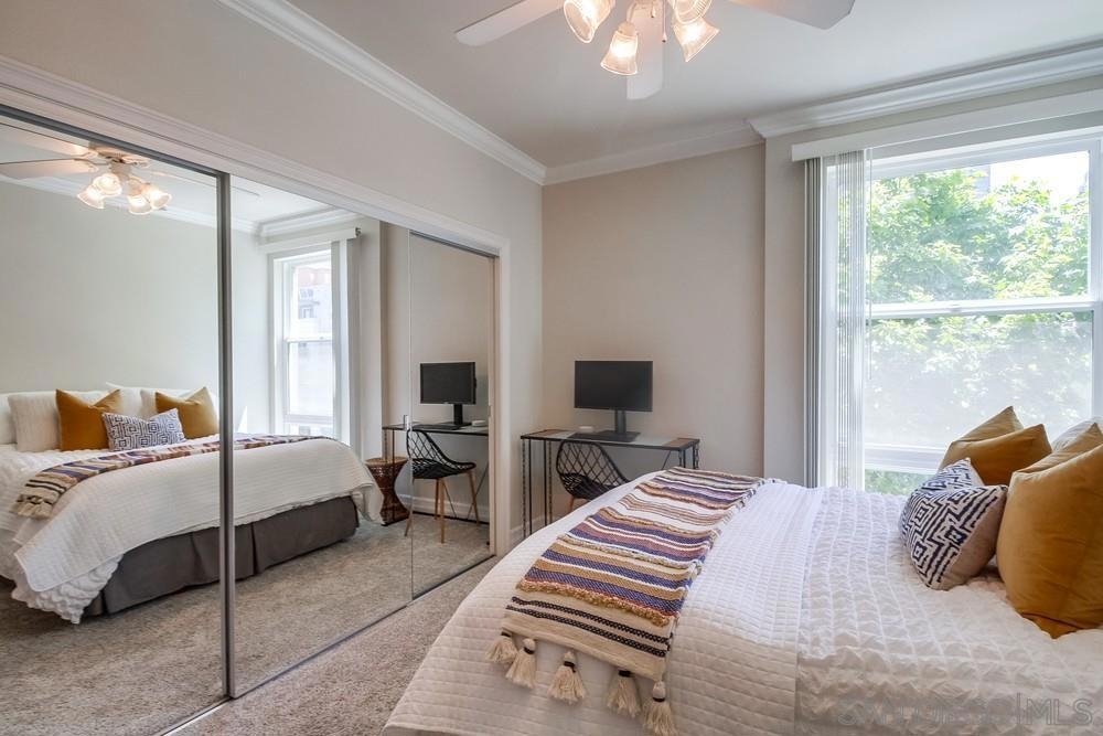 A spacious two-bedroom home at Park Blvd East with lots of natural light and great city views! This northwest corner unit has a split bedroom floor plan and is move-in ready with new carpet and fresh paint. Primary bedroom has a large walk-in closet plus there is a plenty of extra storage throughout. Two parking spaces (tandem). Located across the street from one of the hottest restaurants in San Diego, Callie! See supplement. Other great restaurants and bars nearby include Storyhouse Spirits, The Mission, The Lost Abbey, Basic Pizza, and Copa Vida! Only 3 blocks to Petco Park for Padres games and concerts. For days you don’t feel like driving, the unit is across the street from the Park & Market trolley station, which services the blue and orange lines. Enjoy all that Downtown has to offer!