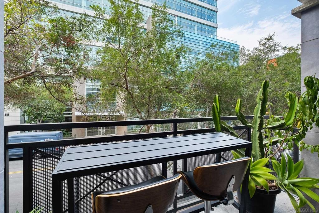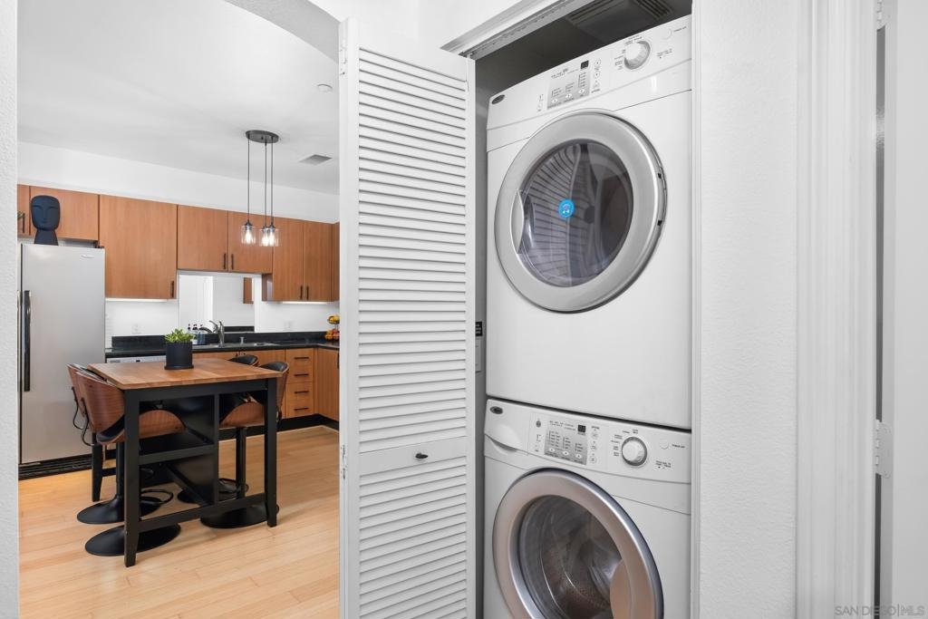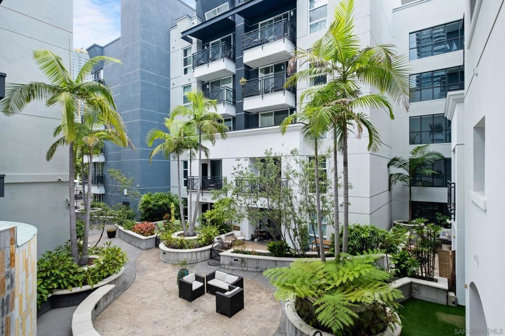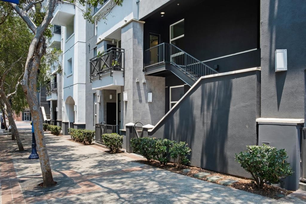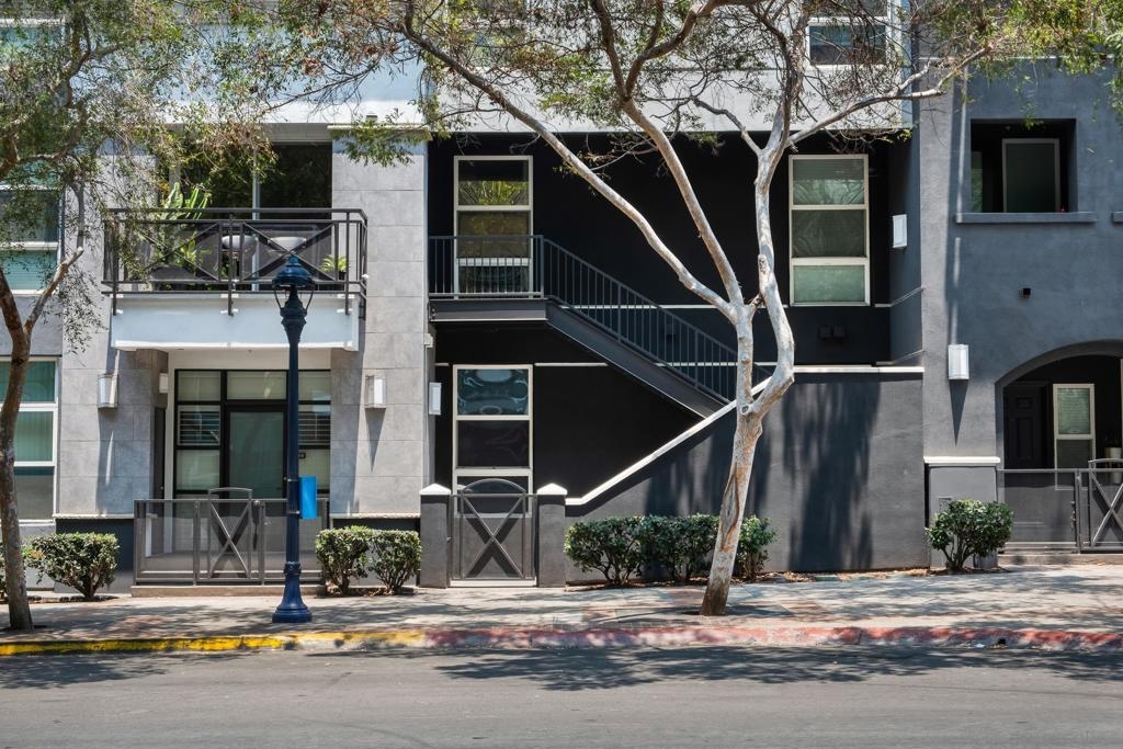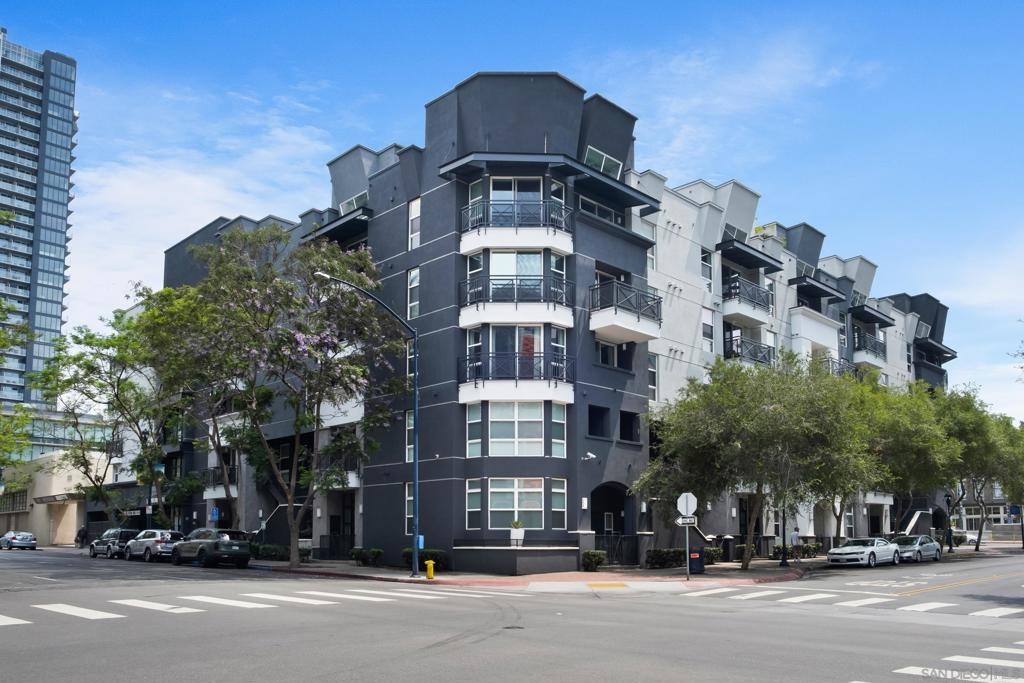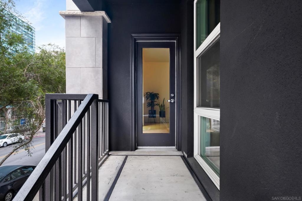 Stunning East Village second floor Condo offering both interior building access and convenient street access which has its own private stairs & gate. Nicely upgraded unit features hardwood floors, granite, SS appliances, new dishwasher, spacious balcony, many storage areas, front load washer/dryer & more. Complex offers ample free guest parking & security patrols. Guest parking available. Close to Petco Park & Gaslamp.