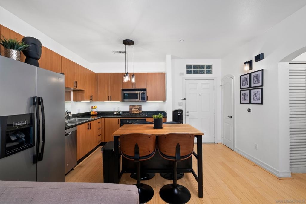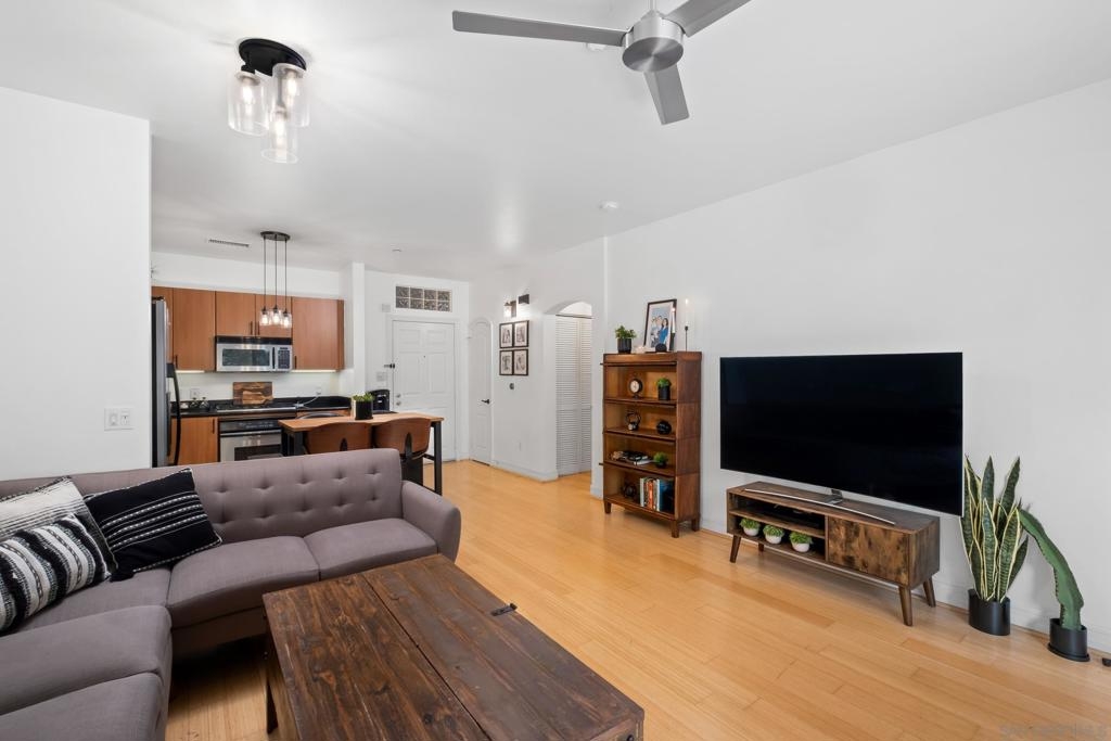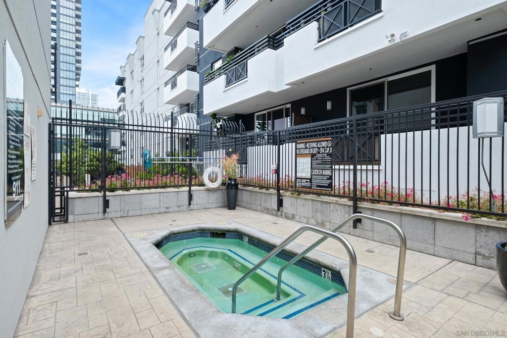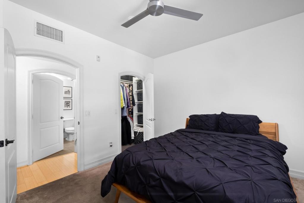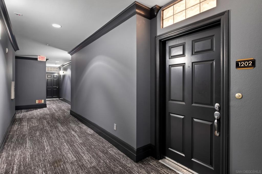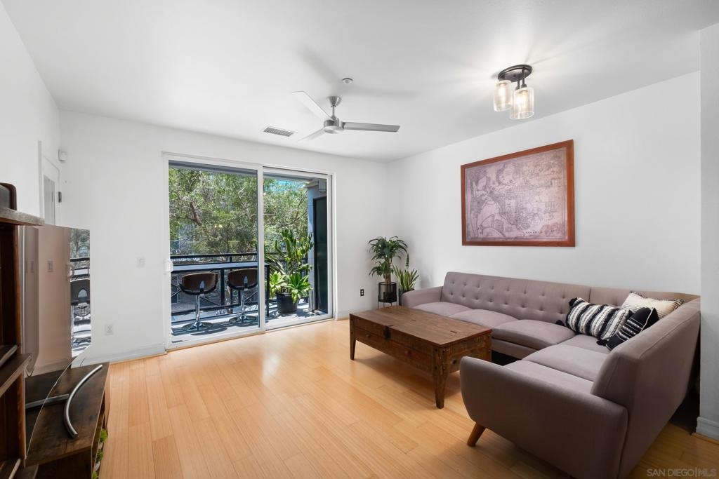 Stunning East Village second floor Condo offering both interior building access and convenient street access which has its own private stairs & gate. Nicely upgraded unit features hardwood floors, granite, SS appliances, new dishwasher, spacious balcony, many storage areas, front load washer/dryer & more. Complex offers ample free guest parking & security patrols. Guest parking available. Close to Petco Park & Gaslamp.