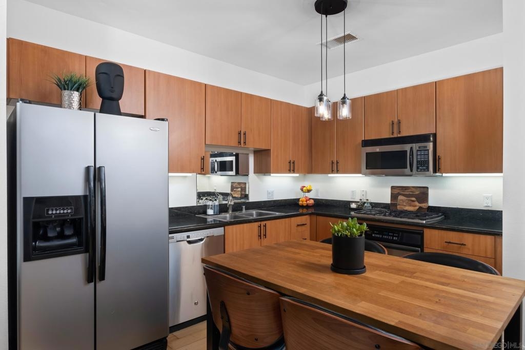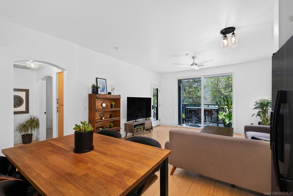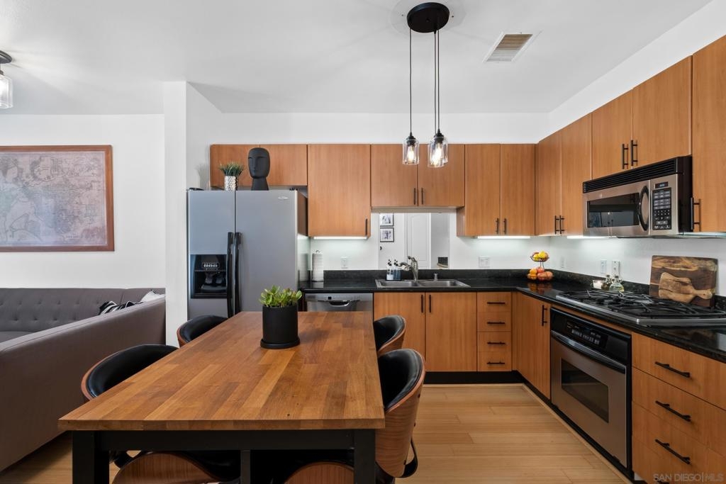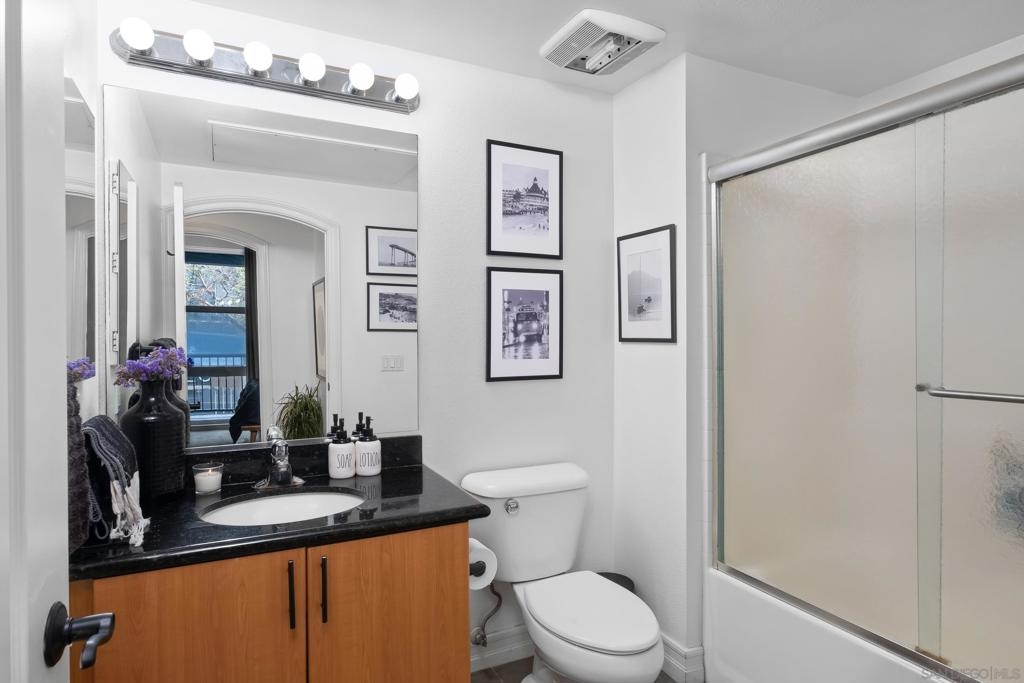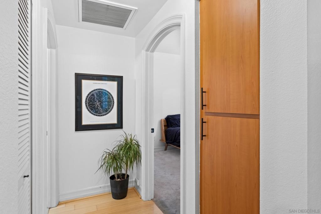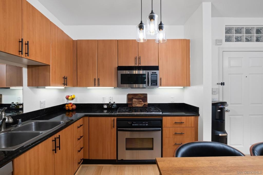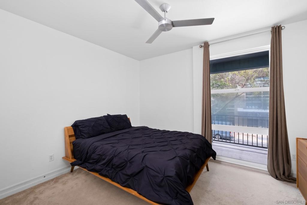 Stunning East Village second floor Condo offering both interior building access and convenient street access which has its own private stairs & gate. Nicely upgraded unit features hardwood floors, granite, SS appliances, new dishwasher, spacious balcony, many storage areas, front load washer/dryer & more. Complex offers ample free guest parking & security patrols. Guest parking available. Close to Petco Park & Gaslamp.
