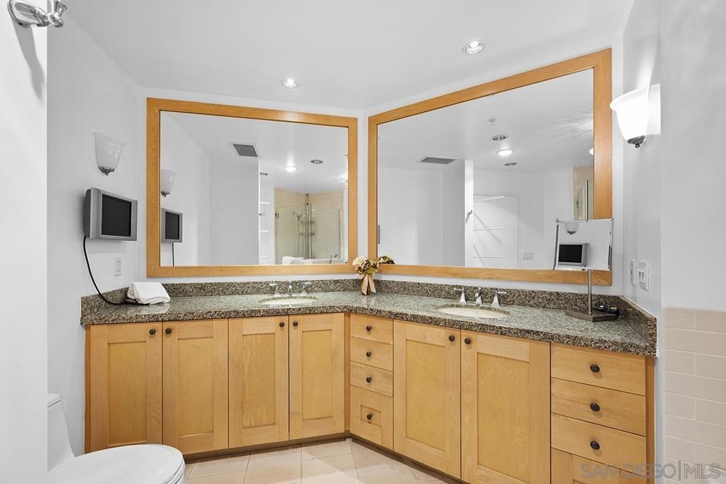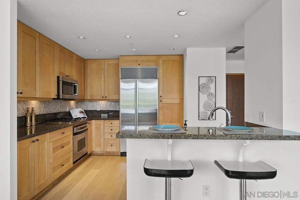 Experience refined living at Park Place with this elegant east-facing residence at Park Place. Step inside to find luxury vinyl plank flooring, dual-sided limestone fireplace, and an abundance of natural light that fills the open-concept living space. The kitchen features stainless Dacor appliances, Sub-Zero refrigerator, granite countertops, ample cabinetry, tile backsplash, and recessed lighting: perfect for both casual meals and entertaining. The spacious primary suite boasts direct terrace access and a spa-inspired ensuite bath with a frameless glass shower, soaking tub, and dual vanity. The private terrace accessible from both the dining area and the primary suite, offering the perfect spot to take in sunrise mornings. Additional perks include an oversized storage cage and a secured parking space, adding everyday ease to this exceptional residence. More than a home, this is Downtown living at its finest: refined, effortless, and surrounded by all the best of the Marina District. Park Place offers a prized location in the Marina District conveniently across from Seaport Village, The Headquarters, and the brand-new Rady’s Shell at Jacobs Park, a unique live music venue and home of the San Diego Symphony! Also enjoy proximity to the future life science and biotechnology research development The Research and Development District (The RaDD) at the Embarcadero and the sustainable tech-focused Horton Plaza Redevelopment in the center of the city. The resort-style pool and spa are accentuated by lounging areas and barbecues. Residents may also take advantage of the recreation room featuring a big-screen TV, fireplace, kitchen and pool table, ideal for entertaining! You’ll love working out at the well-equipped fitness center featuring banks of windows for natural light, and you and your guests will be welcomed in the lavish lobby with concierge service, 24-hour front desk attendant, and guest parking. This showpiece residence is exquisite in every detail and offers unparalleled modern living in a truly unique and lavish building. Old MLS listings quoted builder brochure which showed 1374 sq.ft., assessor’s record now shows 1192 sq.ft., appraiser measured 1263