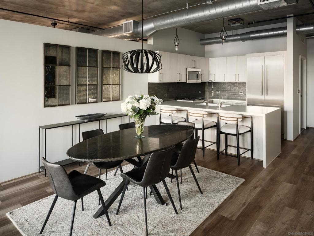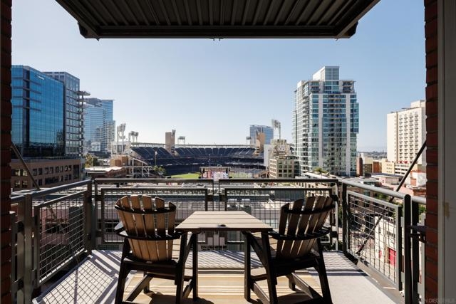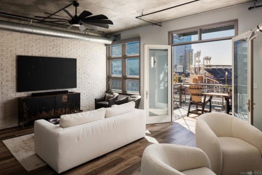 Panoramic ballpark views highlight this distinguished Parkloft residence, with a rare and highly sought-after floor plan. Soaring 10-foot ceilings with exposed ductwork, Pella windows, white brick and concrete wall accents capture the essence of industrial yet elegant loft living. This fully remodeled residence features a brand new chef’s kitchen, showcasing bespoke cabinetry, waterfall-edge quartz countertops, slate subway tile backsplash and Thermador appliances with a 5 burner gas cooktop. Both bathrooms were completely reimagined featuring new cabinetry, quartz countertops, Toto toilets and a large soaking tub with glass shower in the primary bath. New engineered hardwood floors extend throughout the loft, enhancing its modern sophistication while dramatic custom lighting installations create ambiance and architectural intrigue. The expansive Pella windows feature custom motorized shades and open up to the city’s most iconic panoramic Petco Park views. The large private terrace is equipped with gas hookups, perfect for alfresco dining and entertaining. A large storage unit and two (2) oversized side by side parking spaces are deeded to this unit, and both located a few steps from the elevators. Parkloft features a state of the art underground parking garage with tall ceilings and robust ventilation systems. Parkloft residents enjoy a well appointed fitness center; 24-hour concierge and security services; on-site management ensuring exceptional care and convenience; and a serene landscaped courtyard with ambient fire features, BBQ’s and a club house with a kitchenette which opens up to a large outdoor dining table and sets the stage for effortless outdoor entertaining. The Ballpark District spans 22 blocks surrounding Petco Park, where the Padres-affiliated Ballpark District Community Partnership provides daily clean-up services to maintain the area.