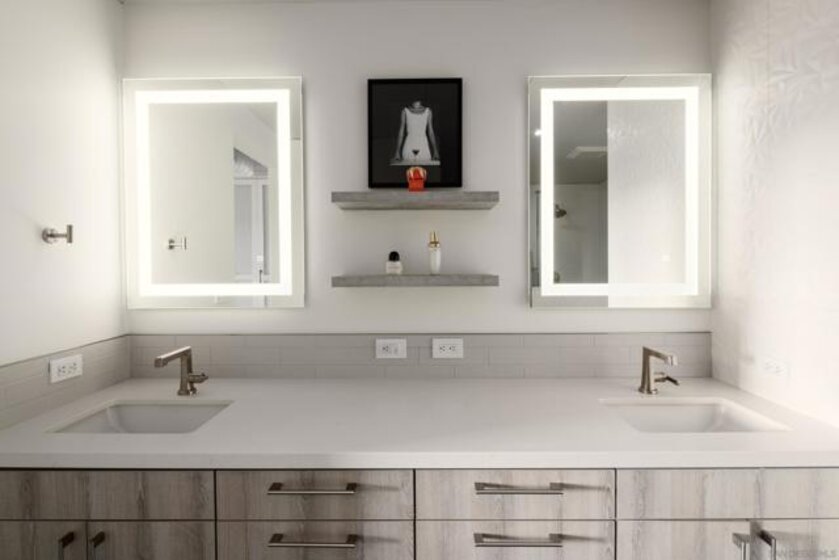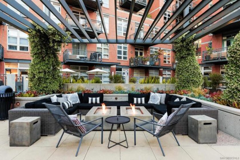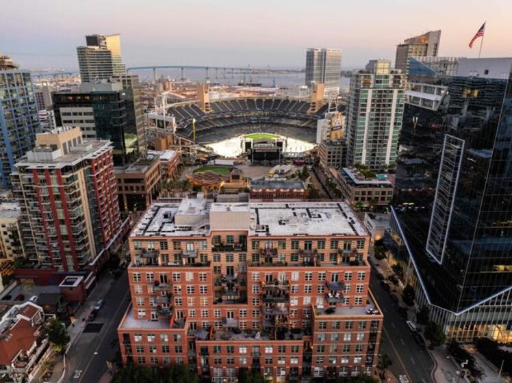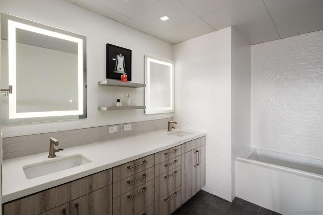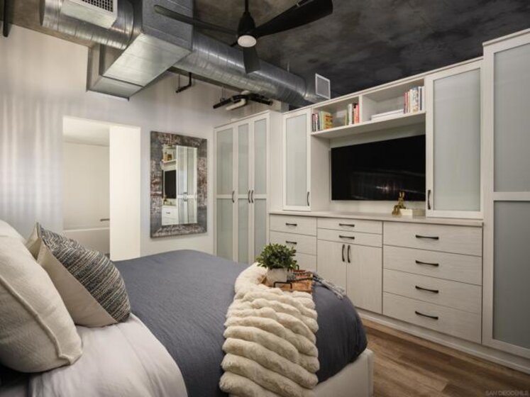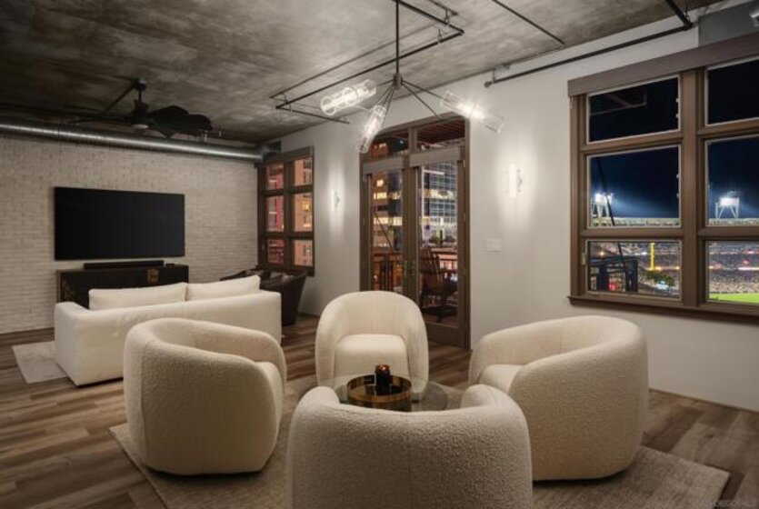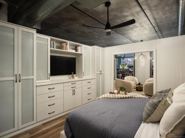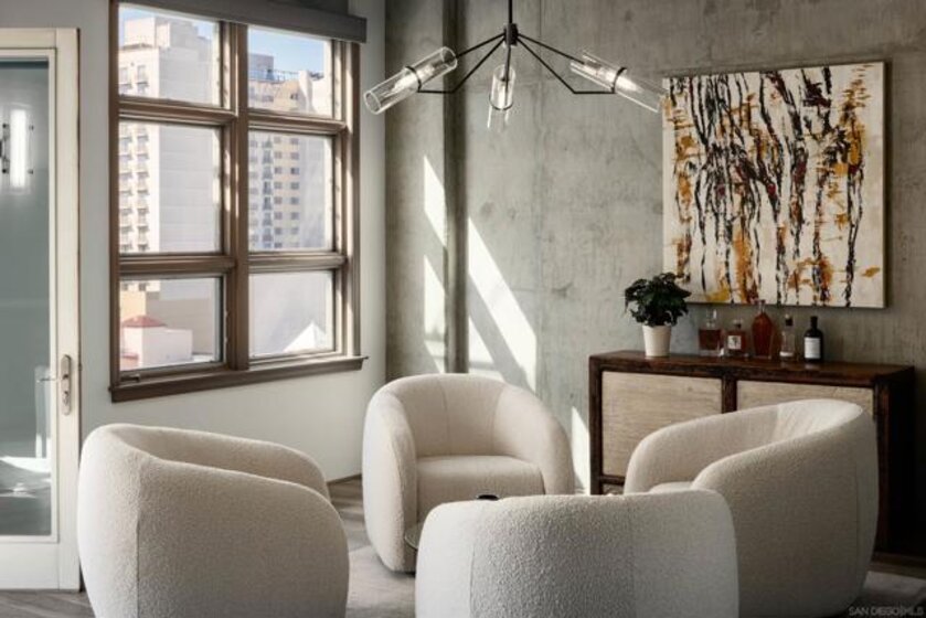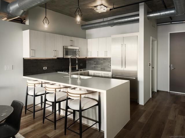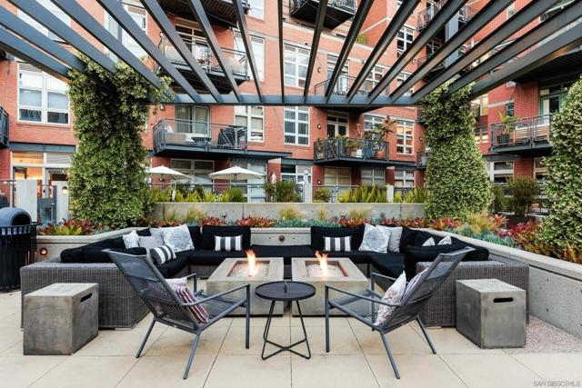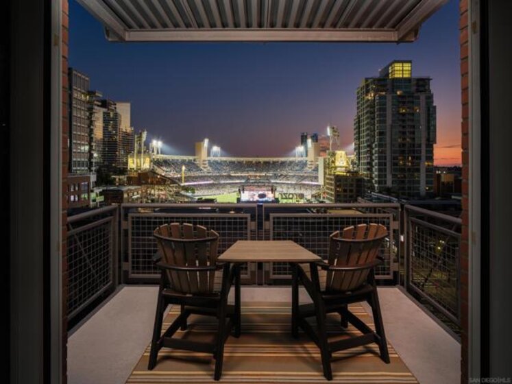 Panoramic ballpark views highlight this distinguished Parkloft residence, with a rare and highly sought-after floor plan. Soaring 10-foot ceilings with exposed ductwork, Pella windows, white brick and concrete wall accents capture the essence of industrial yet elegant loft living. This fully remodeled residence features a brand new chef’s kitchen, showcasing bespoke cabinetry, waterfall-edge quartz countertops, slate subway tile backsplash and Thermador appliances with a 5 burner gas cooktop. Both bathrooms were completely reimagined featuring new cabinetry, quartz countertops, Toto toilets and a large soaking tub with glass shower in the primary bath. New engineered hardwood floors extend throughout the loft, enhancing its modern sophistication while dramatic custom lighting installations create ambiance and architectural intrigue. The expansive Pella windows feature custom motorized shades and open up to the city’s most iconic panoramic Petco Park views. The large private terrace is equipped with gas hookups, perfect for alfresco dining and entertaining. A large storage unit and two (2) oversized side by side parking spaces are deeded to this unit, and both located a few steps from the elevators. Parkloft features a state of the art underground parking garage with tall ceilings and robust ventilation systems. Parkloft residents enjoy a well appointed fitness center; 24-hour concierge and security services; on-site management ensuring exceptional care and convenience; and a serene landscaped courtyard with ambient fire features, BBQ’s and a club house with a kitchenette which opens up to a large outdoor dining table and sets the stage for effortless outdoor entertaining. The Ballpark District spans 22 blocks surrounding Petco Park, where the Padres-affiliated Ballpark District Community Partnership provides daily clean-up services to maintain the area.