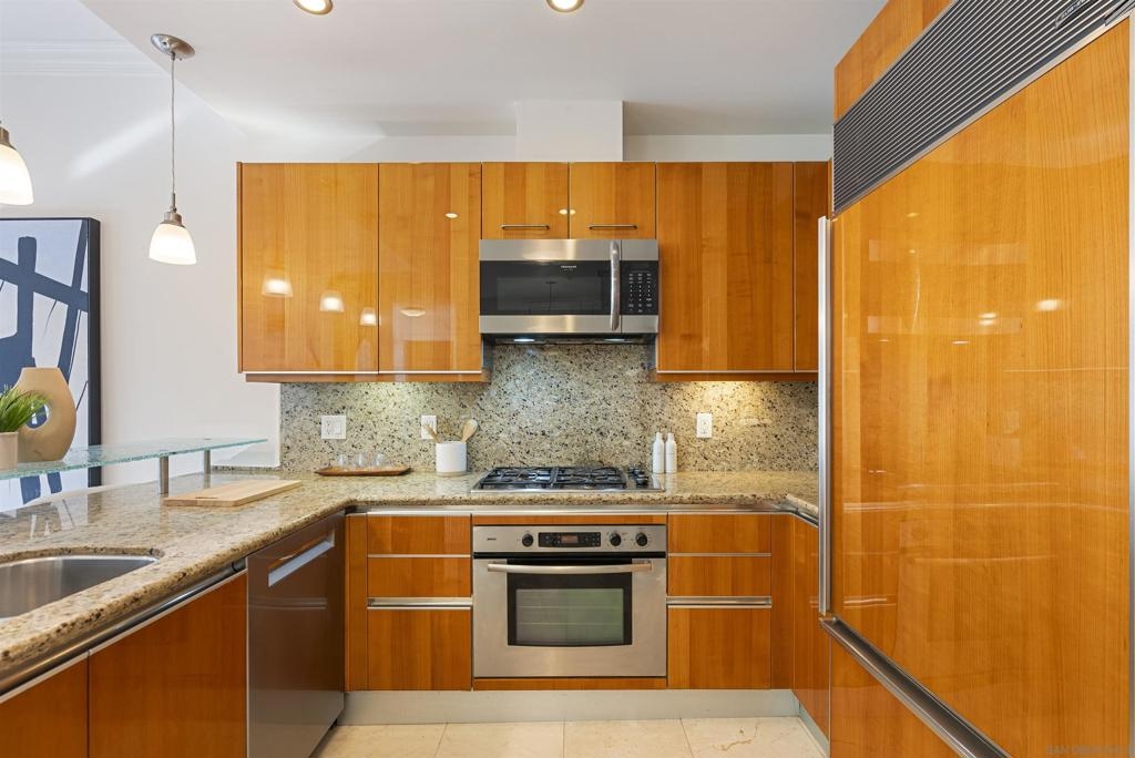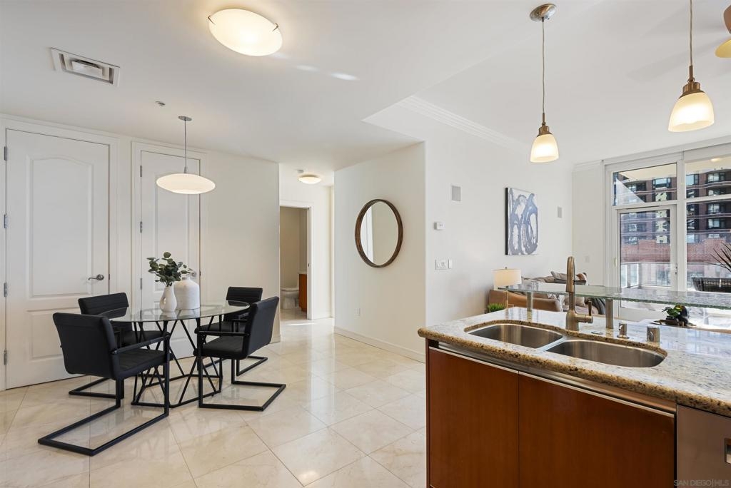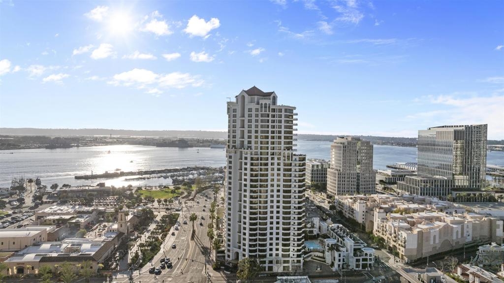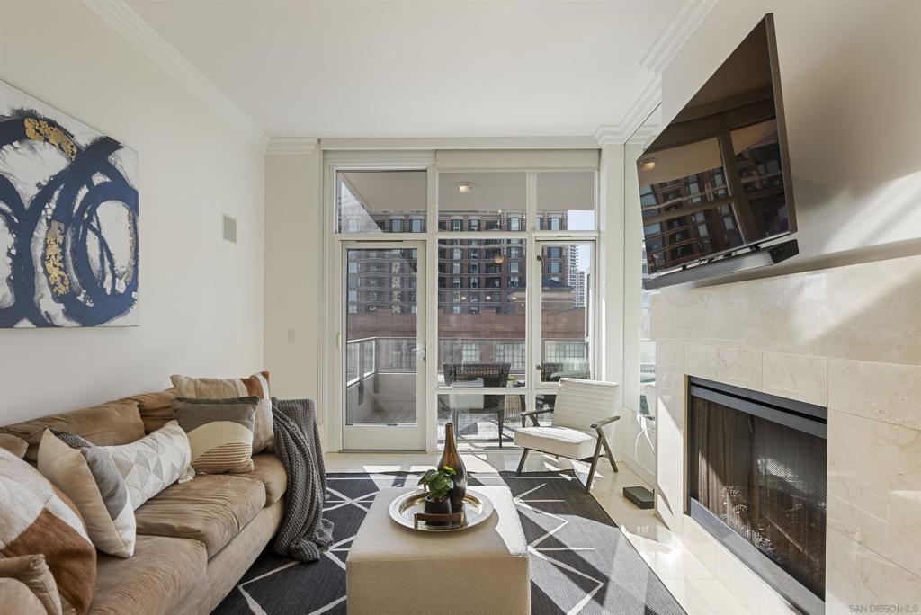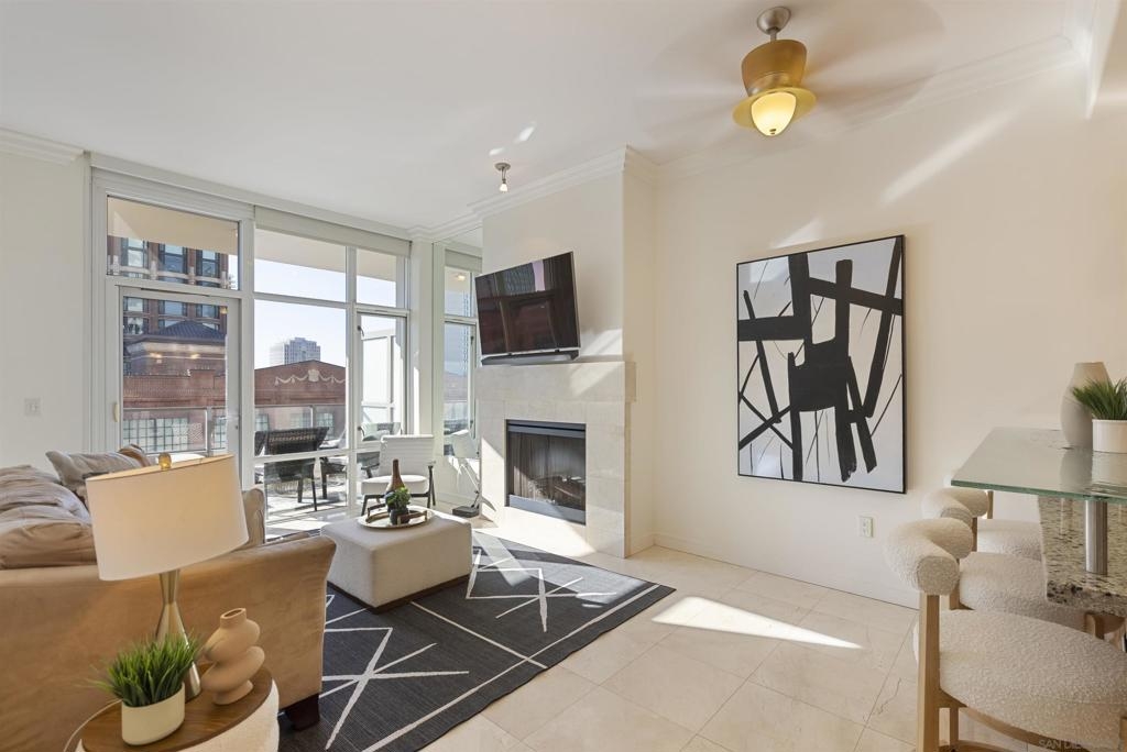 Welcome to 550 Front St #407, a stunning west-facing 1br/1ba w TWO PARKING spaces in The Pinnacle, one of downtown San Diego’s most prestigious high-rises. Offering 737 sq.ft. of elegant living space, this residence boasts high-end finishes, sophisticated design, and resort-style amenities in the heart of the Marina District. Inside, you’ll find stone flooring throughout, an open-concept layout, and floor-to-ceiling windows that fill the home with natural light. The gourmet kitchen is designed for both function and style, featuring granite countertops, Italian cabinetry by Snaidero, and top-of-the-line Sub-Zero and Bosch appliances. A bar seating area connects the kitchen to the spacious living room, where a fireplace and built-in surround sound create a cozy yet modern ambiance. A large private balcony extends the living space outdoors, complete with a TV hookup, making it the perfect place to unwind while enjoying peekaboo views of the bay. The primary suite offers a peaceful retreat, while the spa-inspired bathroom features luxurious finishes. Adding to the convenience, this unit includes two parking spaces and a storage unit, a rare find in downtown living. The Pinnacle offers world-class amenities, including a concierge, 24/7 security, a rooftop heated lap pool, jacuzzi, steam and sauna rooms, a fully equipped gym, a community lounge, a conference room, and a guest suite for visitors. Situated in the highly sought-after Marina District, this home is just moments from the bayfront, Seaport Village, fine dining, shopping, and vibrant nightlife.