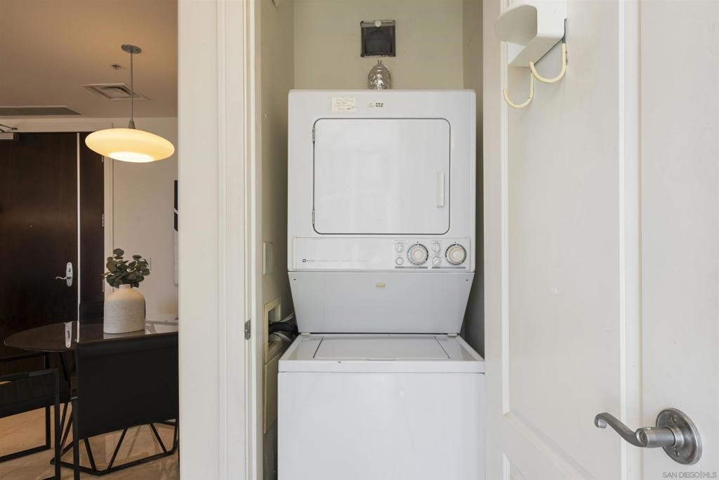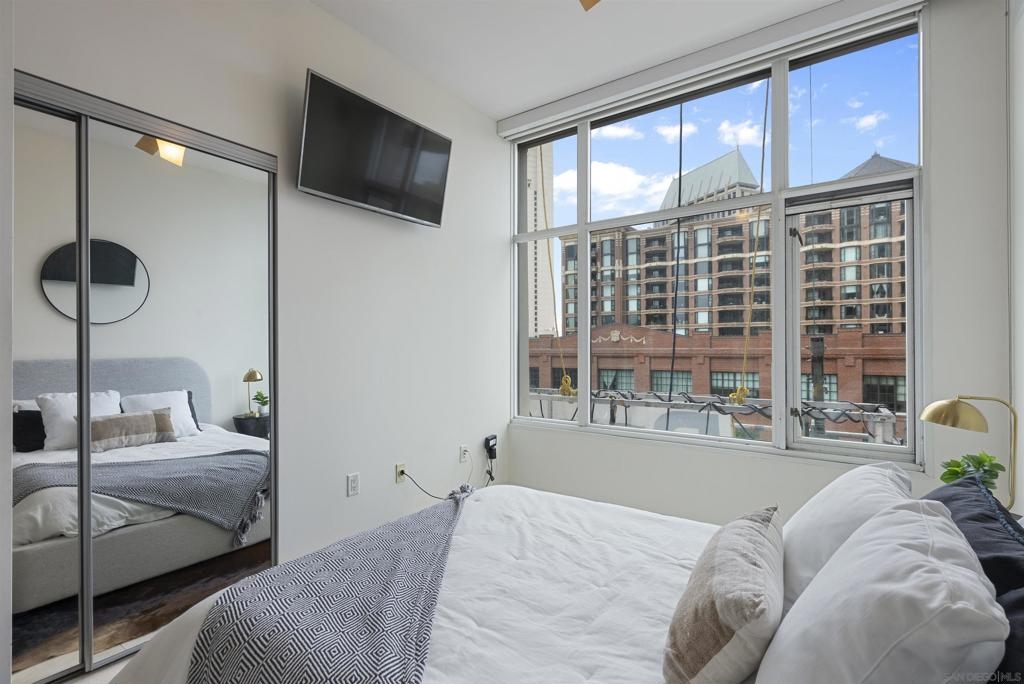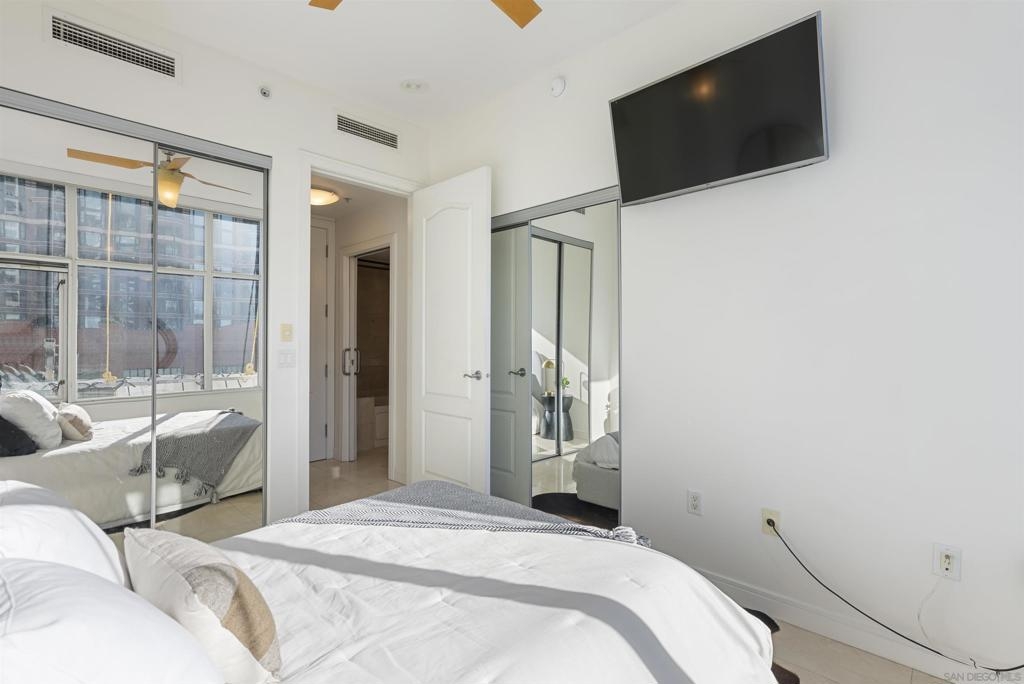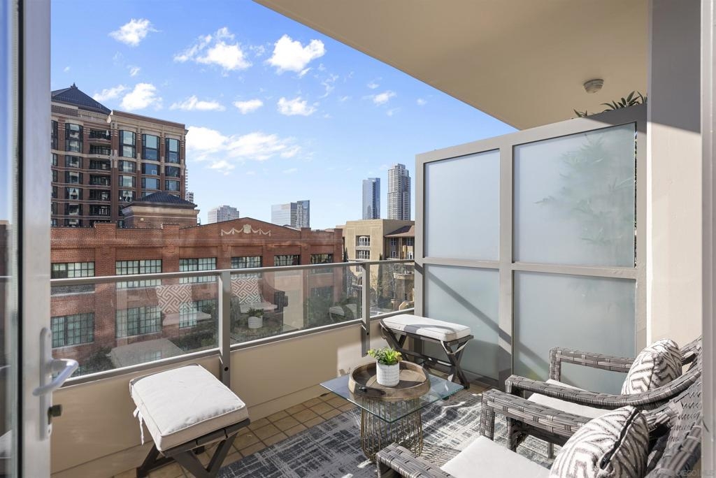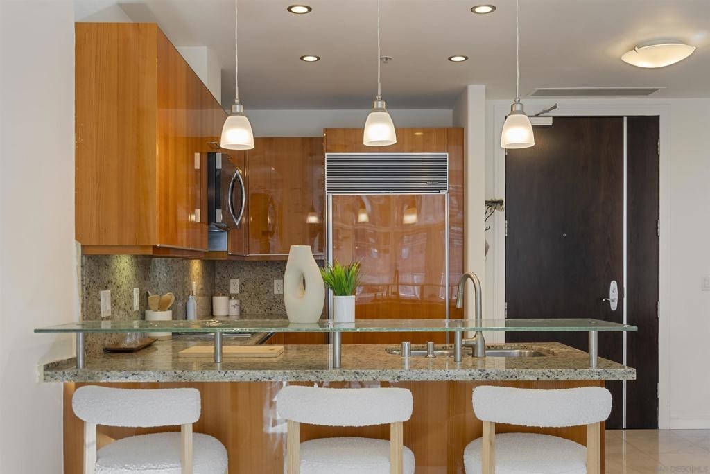 Welcome to 550 Front St #407, a stunning west-facing 1br/1ba w TWO PARKING spaces in The Pinnacle, one of downtown San Diego’s most prestigious high-rises. Offering 737 sq.ft. of elegant living space, this residence boasts high-end finishes, sophisticated design, and resort-style amenities in the heart of the Marina District. Inside, you’ll find stone flooring throughout, an open-concept layout, and floor-to-ceiling windows that fill the home with natural light. The gourmet kitchen is designed for both function and style, featuring granite countertops, Italian cabinetry by Snaidero, and top-of-the-line Sub-Zero and Bosch appliances. A bar seating area connects the kitchen to the spacious living room, where a fireplace and built-in surround sound create a cozy yet modern ambiance. A large private balcony extends the living space outdoors, complete with a TV hookup, making it the perfect place to unwind while enjoying peekaboo views of the bay. The primary suite offers a peaceful retreat, while the spa-inspired bathroom features luxurious finishes. Adding to the convenience, this unit includes two parking spaces and a storage unit, a rare find in downtown living. The Pinnacle offers world-class amenities, including a concierge, 24/7 security, a rooftop heated lap pool, jacuzzi, steam and sauna rooms, a fully equipped gym, a community lounge, a conference room, and a guest suite for visitors. Situated in the highly sought-after Marina District, this home is just moments from the bayfront, Seaport Village, fine dining, shopping, and vibrant nightlife.