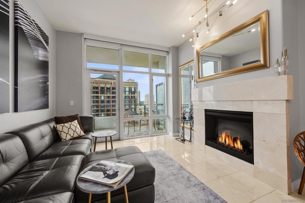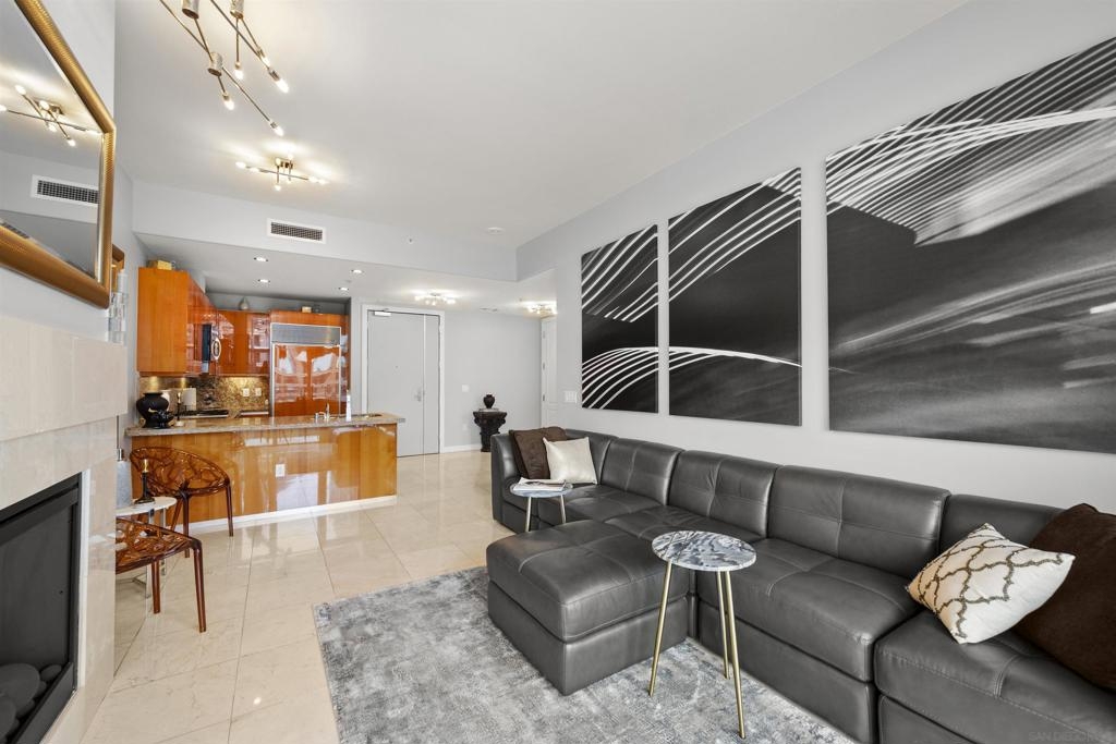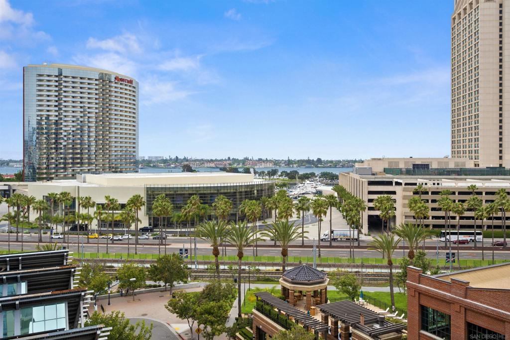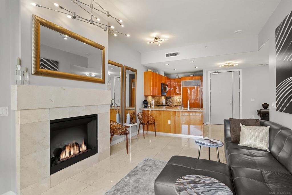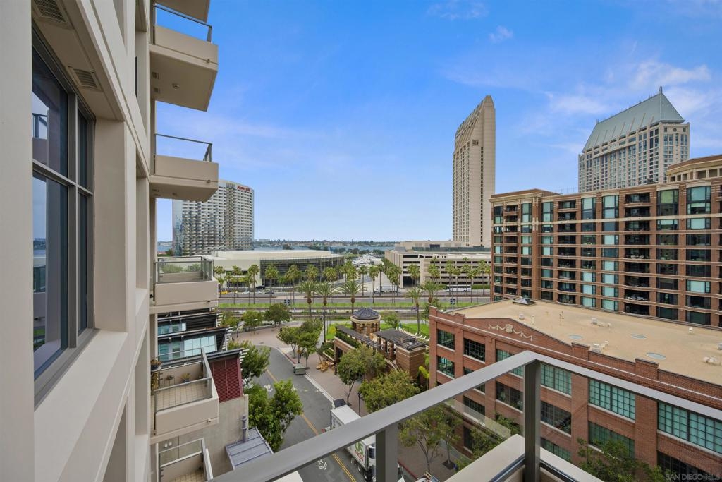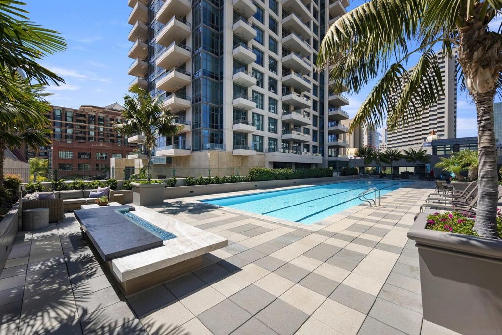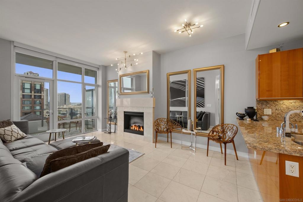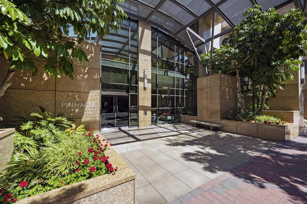 BAY VIEWS FOR UNDER $600K. Discover modern sophistication at The Pinnacle, where contemporary living reaches new heights. This 7th floor residence features soaring 10-foot ceilings, sleek marble flooring, an ambient electric fireplace, and a private west-facing balcony with captivating views of the San Diego Bay. The open kitchen features an integrated Sub-Zero refrigerator, Bosch appliances, Snaidero Italian cabinetry, newer designer paint and ultra modern light fixtures throughout. The bathroom features a soaking tub and shower combo, and recently updated cabinetry and countertop. Ideally situated in the heart of the Marina District, this turnkey residence delivers an exceptional urban lifestyle. Enjoy one deeded full size parking space as well as a storage unit. Inquire about Seller credit toward HOA dues. Welcome to The Pinnacle—where life reaches new heights of luxury and convenience. Nestled in the heart of the Marina District, this premier residence places you just steps from San Diego’s most iconic destinations: scenic Waterfront Park, vibrant Seaport Village, The Headquarters, the reimagined Children’s Park, and the world-class Rady Shell at Jacobs Park. At The Pinnacle, residents are treated to an unmatched suite of amenities: a stunningly designed lobby with full-service concierge, a state-of-the-art fitness center with steam and sauna rooms, a heated Olympic-style pool, a resort-style outdoor kitchen and BBQ area, a resident lounge and meeting room with a fully equipped kitchen, and even a furnished guest suite for visiting friends and family. Immerse yourself in the Pinnacle of Downtown living where elegance, comfort, and location converge. Builder brochure cites the unit as 737 sq. ft., tax records how 669 sq. ft.
