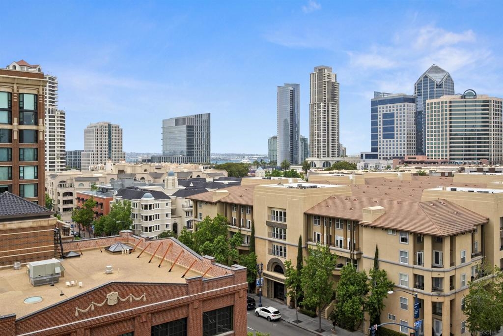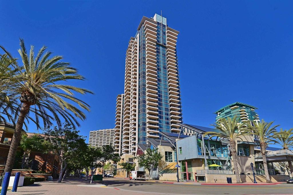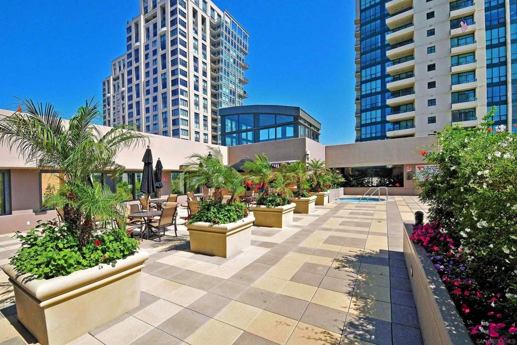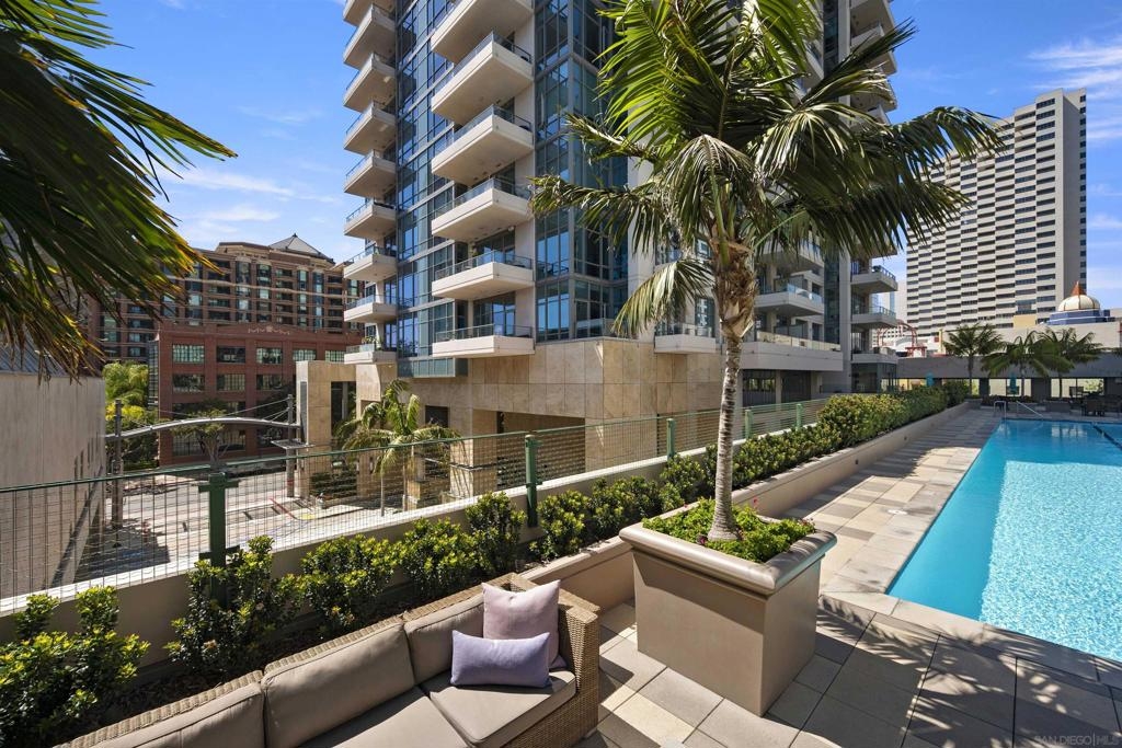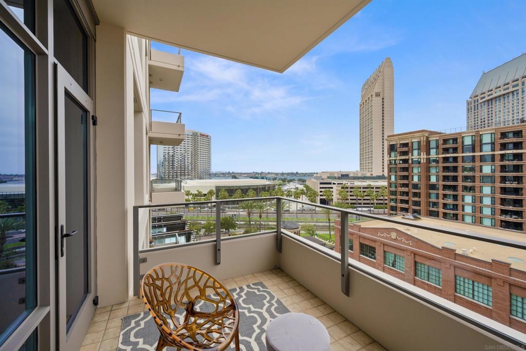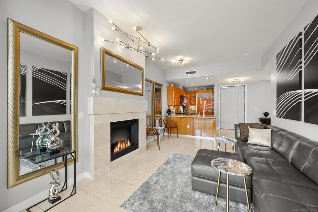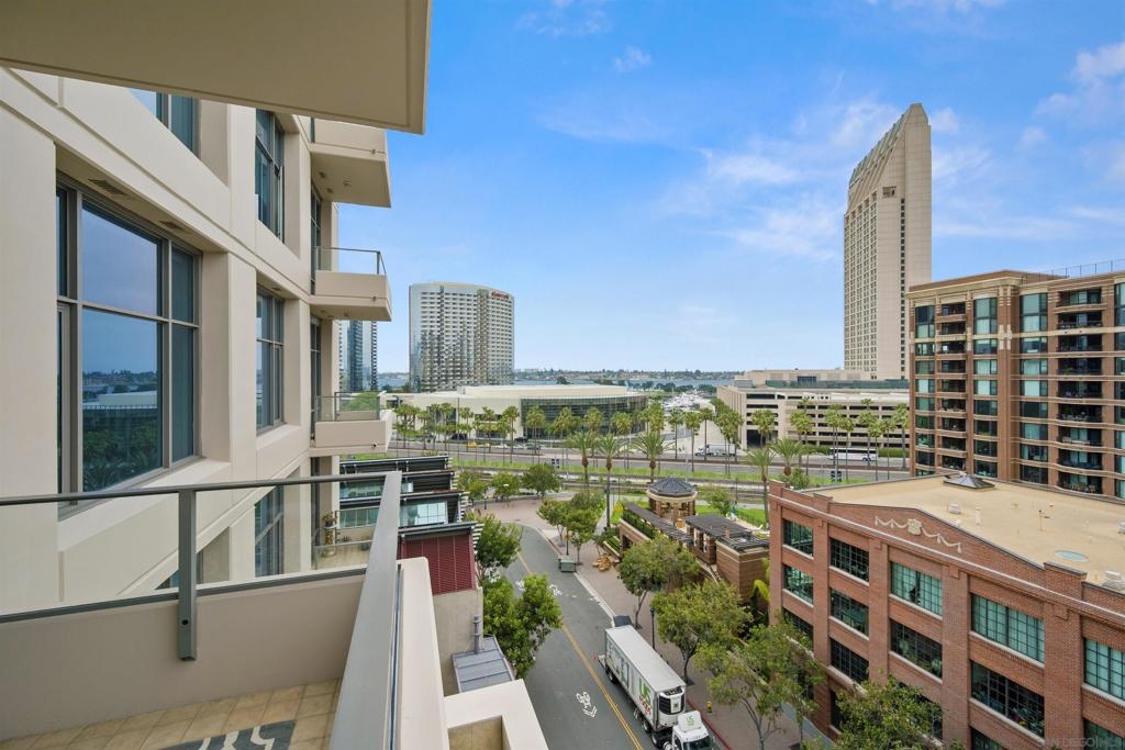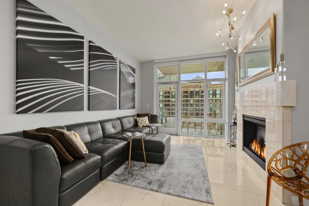 BAY VIEWS FOR UNDER $600K. Discover modern sophistication at The Pinnacle, where contemporary living reaches new heights. This 7th floor residence features soaring 10-foot ceilings, sleek marble flooring, an ambient electric fireplace, and a private west-facing balcony with captivating views of the San Diego Bay. The open kitchen features an integrated Sub-Zero refrigerator, Bosch appliances, Snaidero Italian cabinetry, newer designer paint and ultra modern light fixtures throughout. The bathroom features a soaking tub and shower combo, and recently updated cabinetry and countertop. Ideally situated in the heart of the Marina District, this turnkey residence delivers an exceptional urban lifestyle. Enjoy one deeded full size parking space as well as a storage unit. Inquire about Seller credit toward HOA dues. Welcome to The Pinnacle—where life reaches new heights of luxury and convenience. Nestled in the heart of the Marina District, this premier residence places you just steps from San Diego’s most iconic destinations: scenic Waterfront Park, vibrant Seaport Village, The Headquarters, the reimagined Children’s Park, and the world-class Rady Shell at Jacobs Park. At The Pinnacle, residents are treated to an unmatched suite of amenities: a stunningly designed lobby with full-service concierge, a state-of-the-art fitness center with steam and sauna rooms, a heated Olympic-style pool, a resort-style outdoor kitchen and BBQ area, a resident lounge and meeting room with a fully equipped kitchen, and even a furnished guest suite for visiting friends and family. Immerse yourself in the Pinnacle of Downtown living where elegance, comfort, and location converge. Builder brochure cites the unit as 737 sq. ft., tax records how 669 sq. ft.