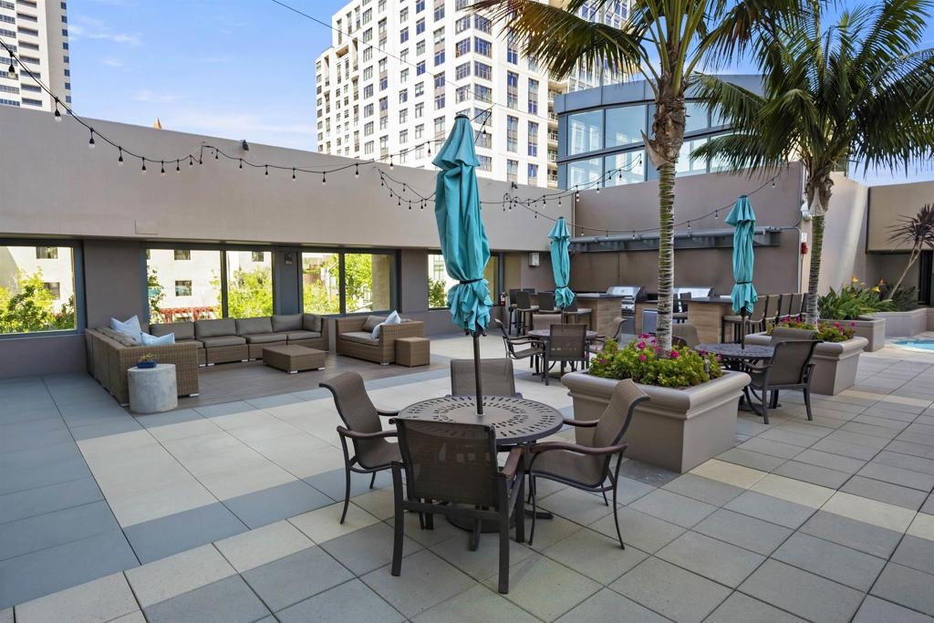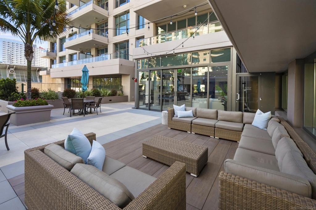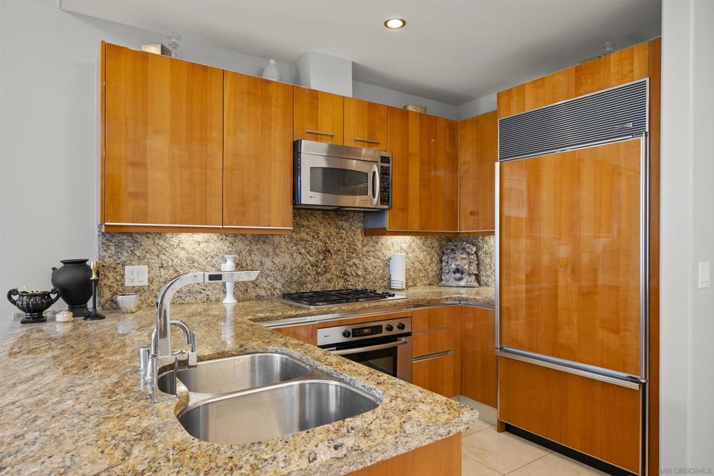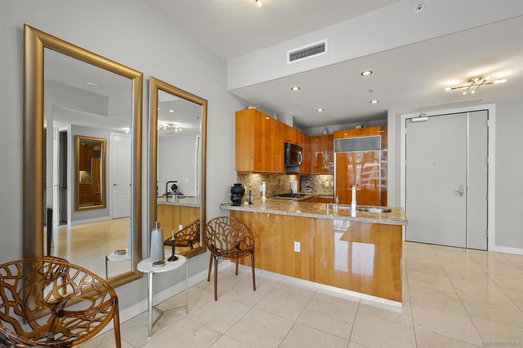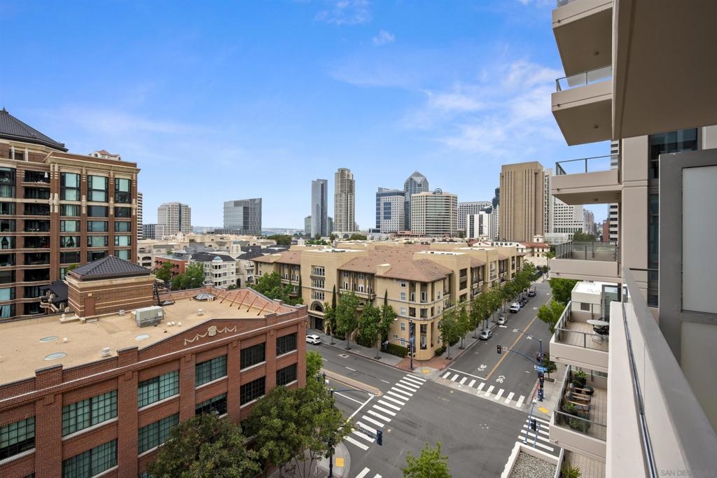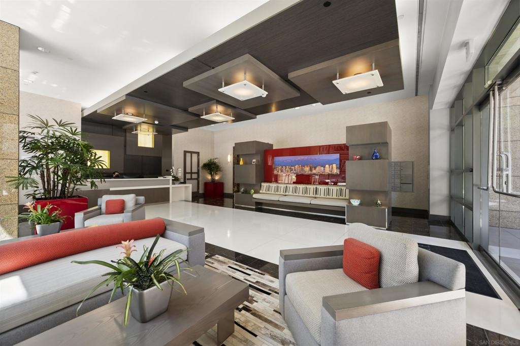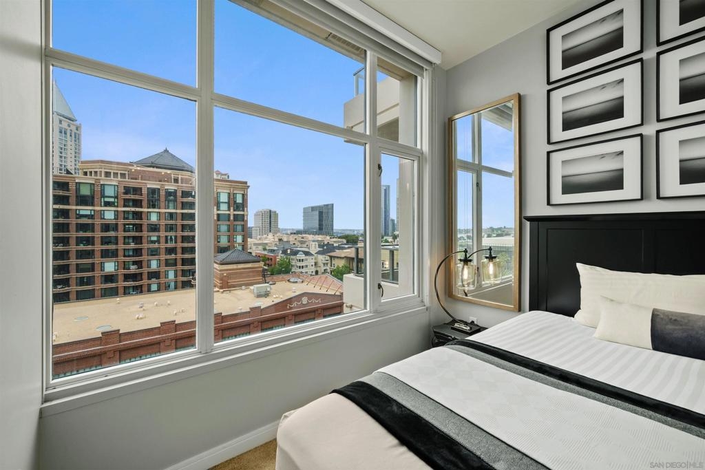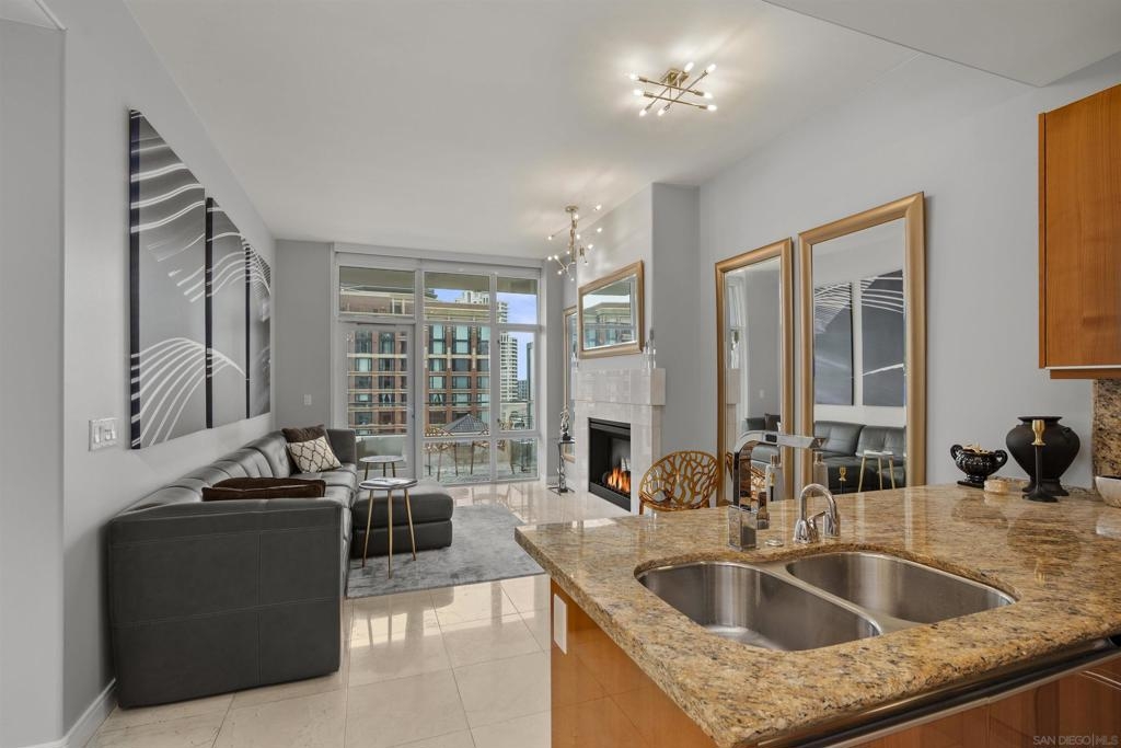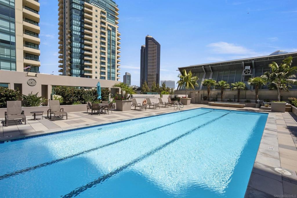 BAY VIEWS FOR UNDER $600K. Discover modern sophistication at The Pinnacle, where contemporary living reaches new heights. This 7th floor residence features soaring 10-foot ceilings, sleek marble flooring, an ambient electric fireplace, and a private west-facing balcony with captivating views of the San Diego Bay. The open kitchen features an integrated Sub-Zero refrigerator, Bosch appliances, Snaidero Italian cabinetry, newer designer paint and ultra modern light fixtures throughout. The bathroom features a soaking tub and shower combo, and recently updated cabinetry and countertop. Ideally situated in the heart of the Marina District, this turnkey residence delivers an exceptional urban lifestyle. Enjoy one deeded full size parking space as well as a storage unit. Inquire about Seller credit toward HOA dues. Welcome to The Pinnacle—where life reaches new heights of luxury and convenience. Nestled in the heart of the Marina District, this premier residence places you just steps from San Diego’s most iconic destinations: scenic Waterfront Park, vibrant Seaport Village, The Headquarters, the reimagined Children’s Park, and the world-class Rady Shell at Jacobs Park. At The Pinnacle, residents are treated to an unmatched suite of amenities: a stunningly designed lobby with full-service concierge, a state-of-the-art fitness center with steam and sauna rooms, a heated Olympic-style pool, a resort-style outdoor kitchen and BBQ area, a resident lounge and meeting room with a fully equipped kitchen, and even a furnished guest suite for visiting friends and family. Immerse yourself in the Pinnacle of Downtown living where elegance, comfort, and location converge. Builder brochure cites the unit as 737 sq. ft., tax records how 669 sq. ft.