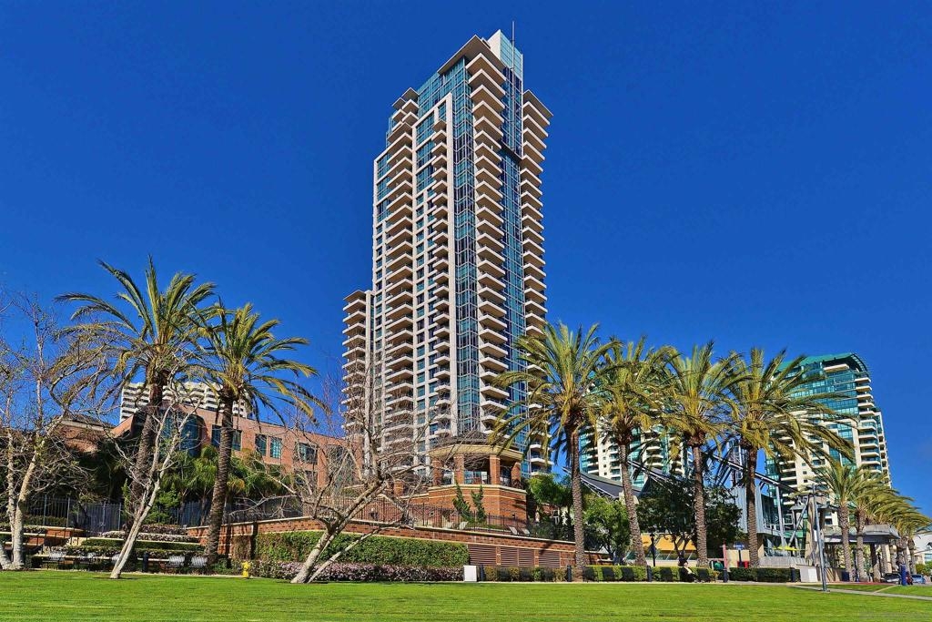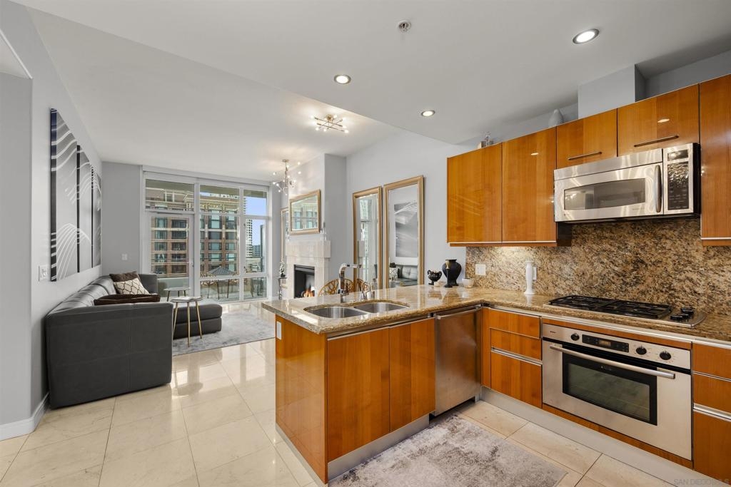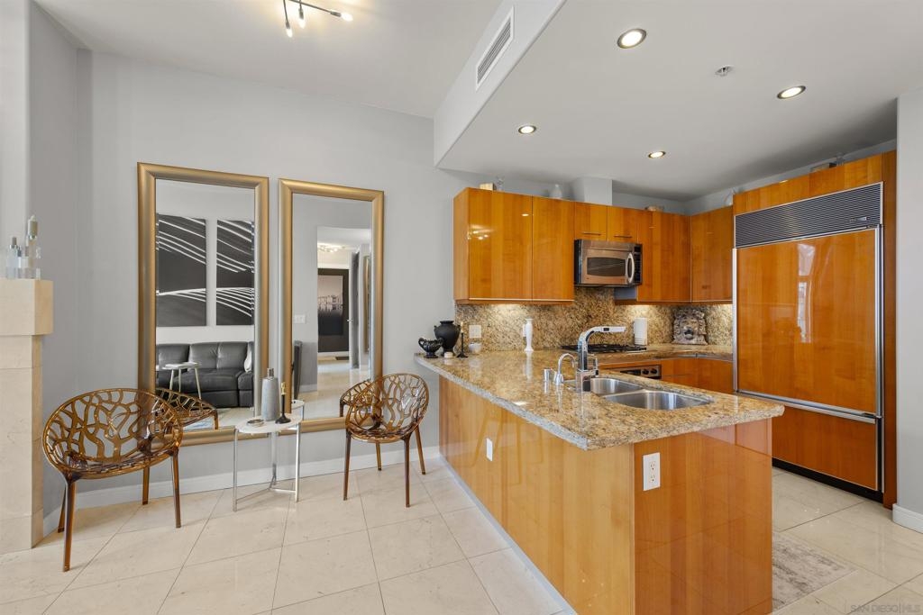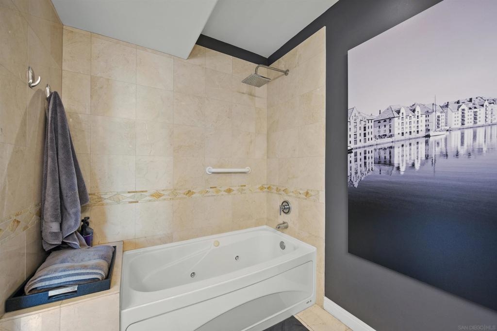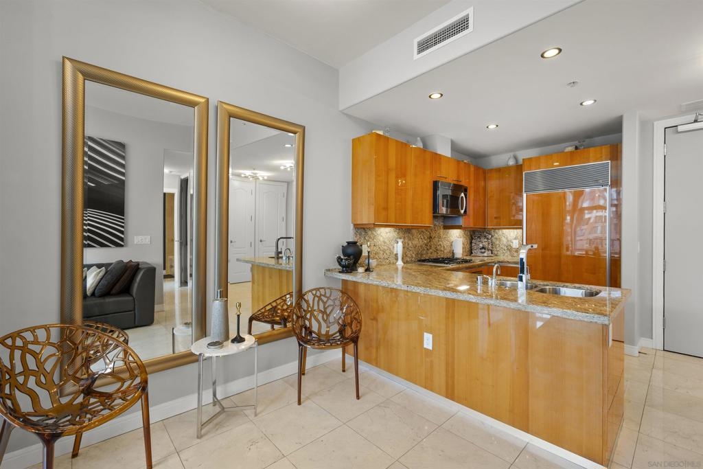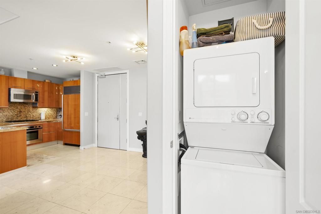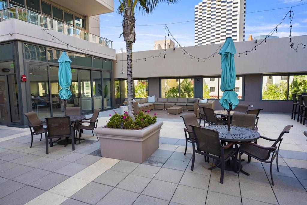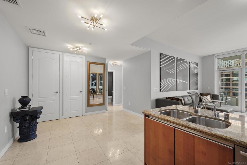 BAY VIEWS FOR UNDER $600K. Discover modern sophistication at The Pinnacle, where contemporary living reaches new heights. This 7th floor residence features soaring 10-foot ceilings, sleek marble flooring, an ambient electric fireplace, and a private west-facing balcony with captivating views of the San Diego Bay. The open kitchen features an integrated Sub-Zero refrigerator, Bosch appliances, Snaidero Italian cabinetry, newer designer paint and ultra modern light fixtures throughout. The bathroom features a soaking tub and shower combo, and recently updated cabinetry and countertop. Ideally situated in the heart of the Marina District, this turnkey residence delivers an exceptional urban lifestyle. Enjoy one deeded full size parking space as well as a storage unit. Inquire about Seller credit toward HOA dues. Welcome to The Pinnacle—where life reaches new heights of luxury and convenience. Nestled in the heart of the Marina District, this premier residence places you just steps from San Diego’s most iconic destinations: scenic Waterfront Park, vibrant Seaport Village, The Headquarters, the reimagined Children’s Park, and the world-class Rady Shell at Jacobs Park. At The Pinnacle, residents are treated to an unmatched suite of amenities: a stunningly designed lobby with full-service concierge, a state-of-the-art fitness center with steam and sauna rooms, a heated Olympic-style pool, a resort-style outdoor kitchen and BBQ area, a resident lounge and meeting room with a fully equipped kitchen, and even a furnished guest suite for visiting friends and family. Immerse yourself in the Pinnacle of Downtown living where elegance, comfort, and location converge. Builder brochure cites the unit as 737 sq. ft., tax records how 669 sq. ft.